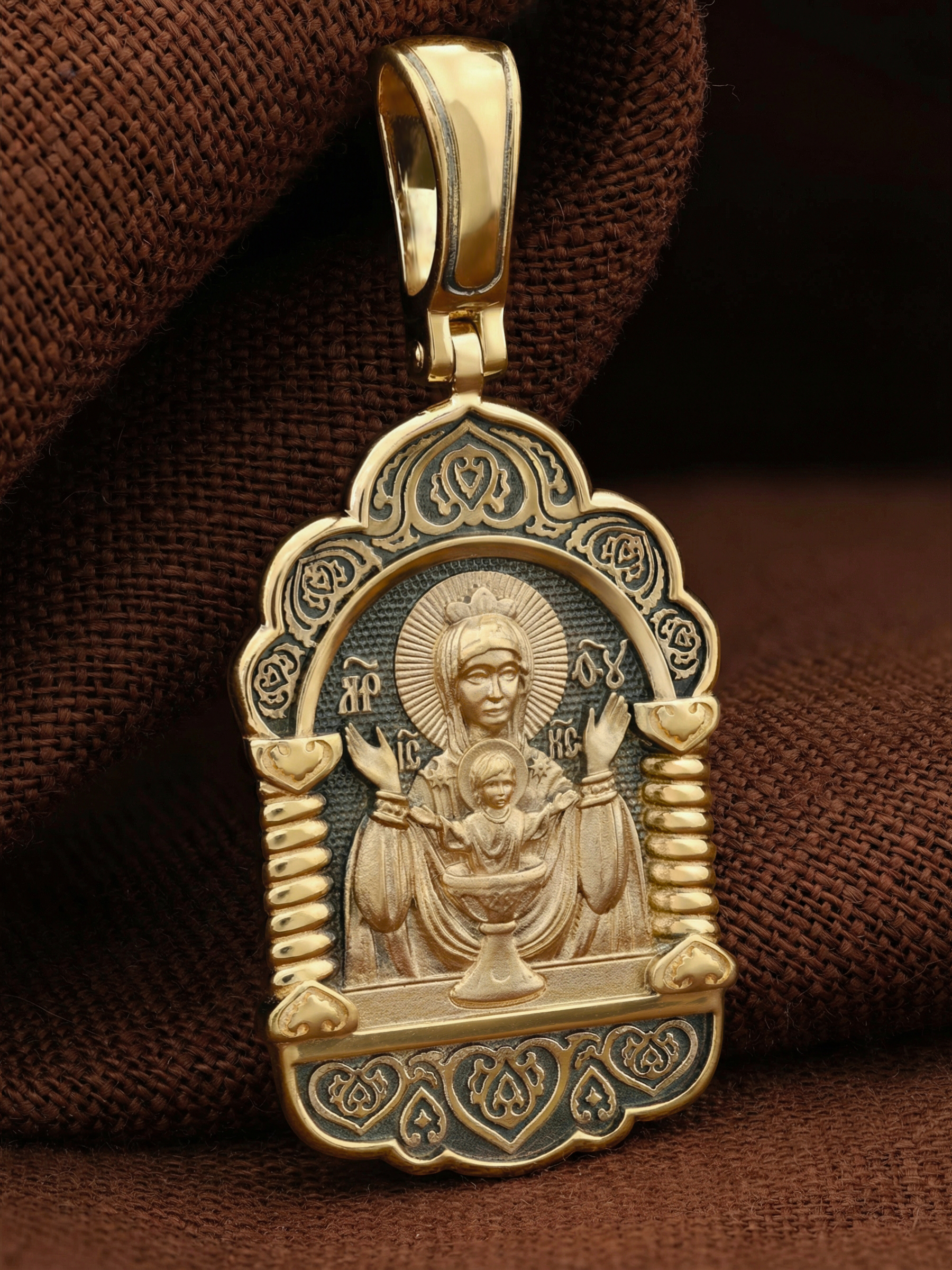 На лицевой части образка изображена икона Божией Матери «Неупиваемая чаша». Икона славится помощью в исцелении зависимостей, помогает людям обрести свободу от греховных страстей.