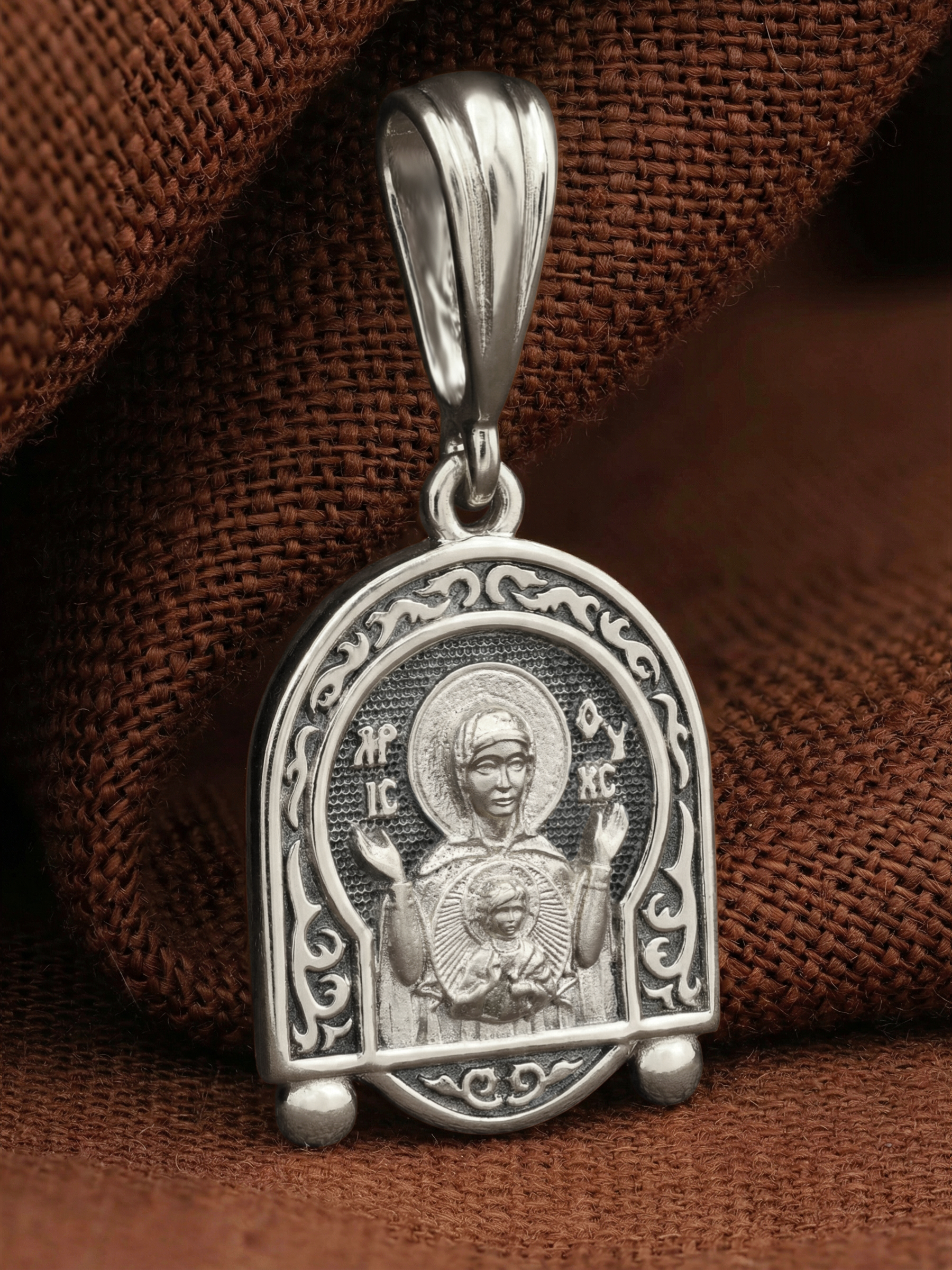 В центр образка помещен образ Божией Матери «Знамение», прославившийся многими чудесами в Новгороде в XII веке. Икона эта чтится как одна из самых великих святынь Русской земли. Молитвенно воздетые руки Богородицы означают заступничество за людей пред Богом. Рядом с Ней, на фоне круглого щита, — благословляющий Божественный Младенец — Спас-Эммануил.