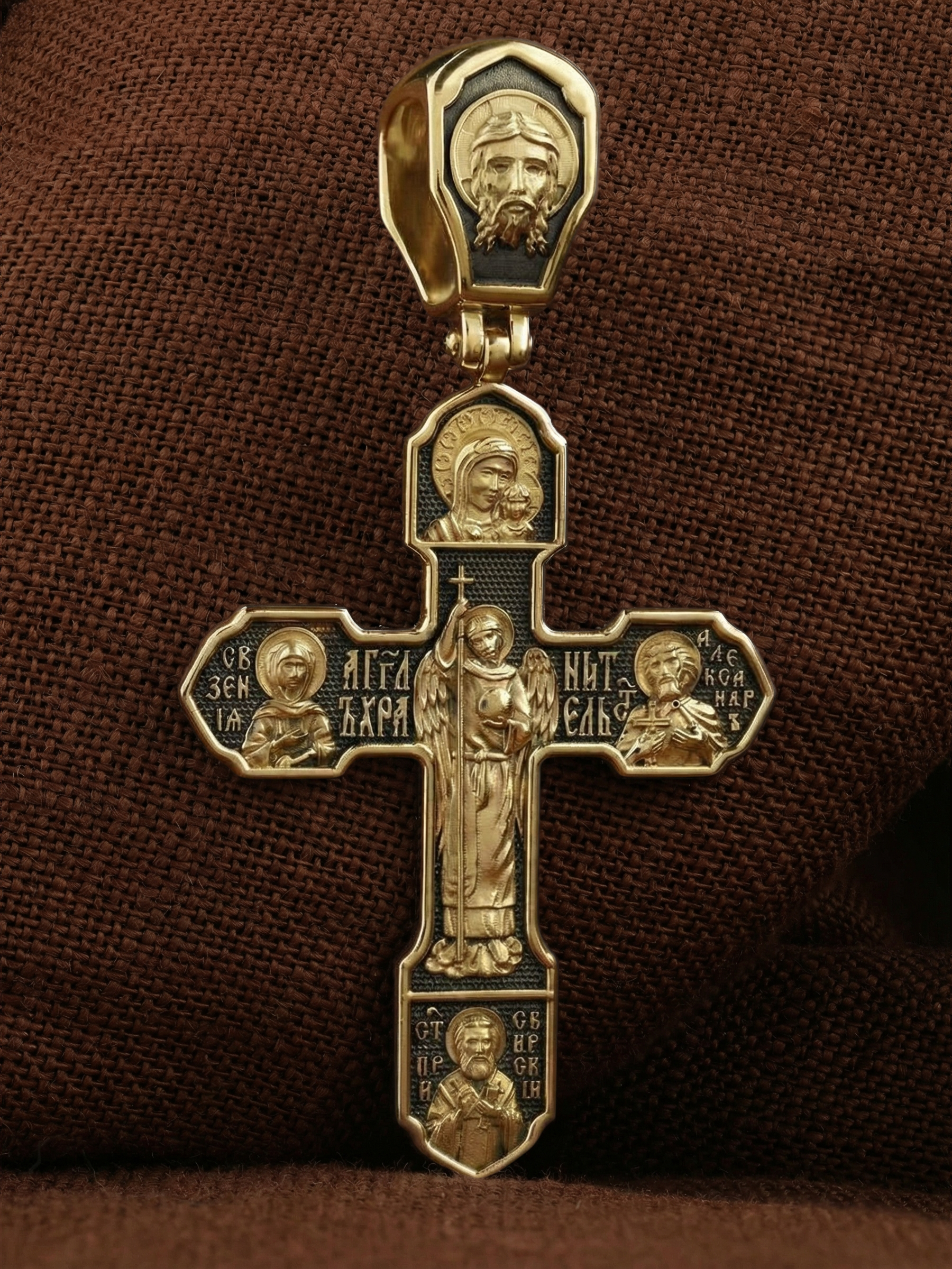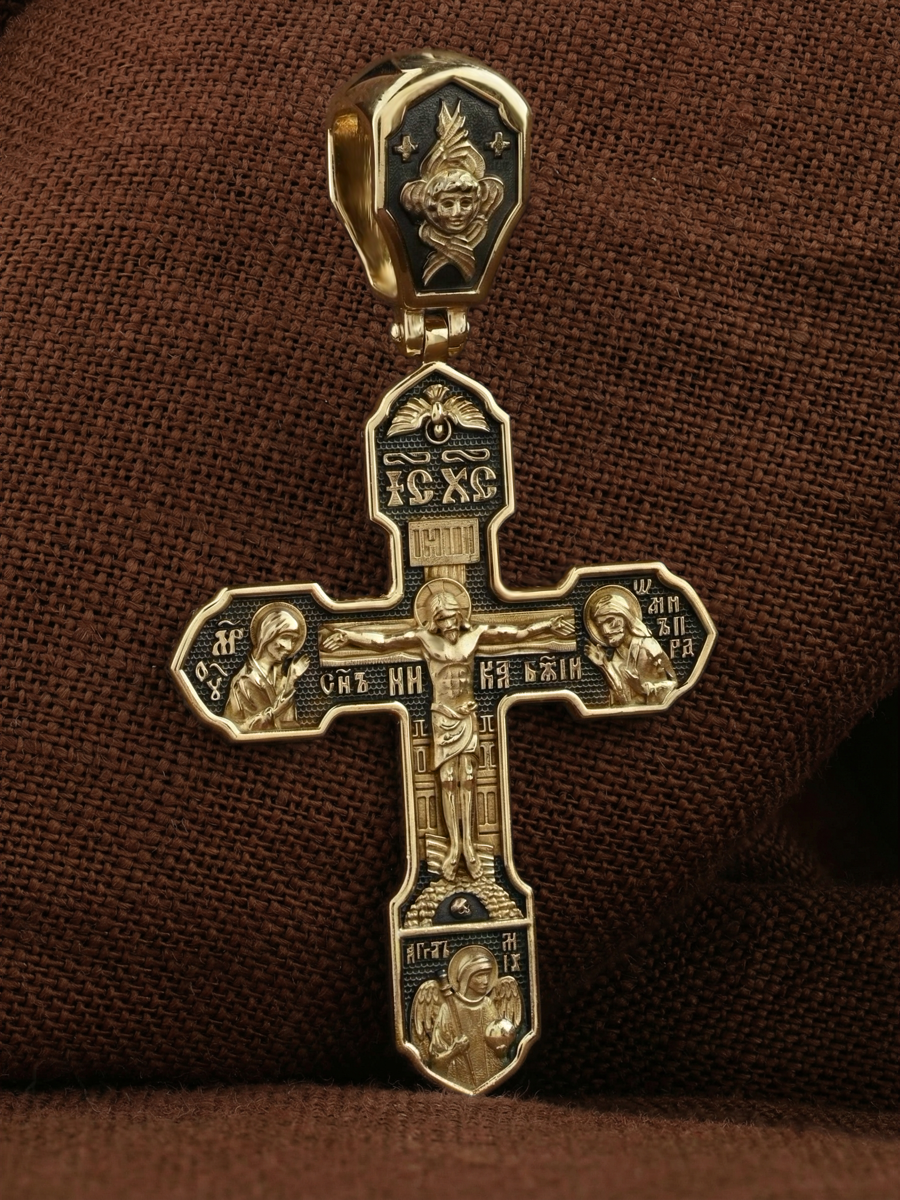 На лицевой стороне изображено Распятие Господа Иисуса Христа, над вершиной которого помещены титлы Его святого имени — «ИС ХС». Под основной перекладиной надписи — «НИКА», что в переводе с греческого означает «победитель», и словосочетание «СЫН БОЖИЙ», что означает божественную природу Иисуса Христа. С двух сторон Христу предстоят Пресвятая Богородица и св. Андрей Первозванный. Внизу — образ Архангела Михаила, могучего защитника от злых сил. Это он низверг дьявола и встал во главе ангелов для борьбы с бесовскими силами. Его имя означает «Кто яко Бог?».
