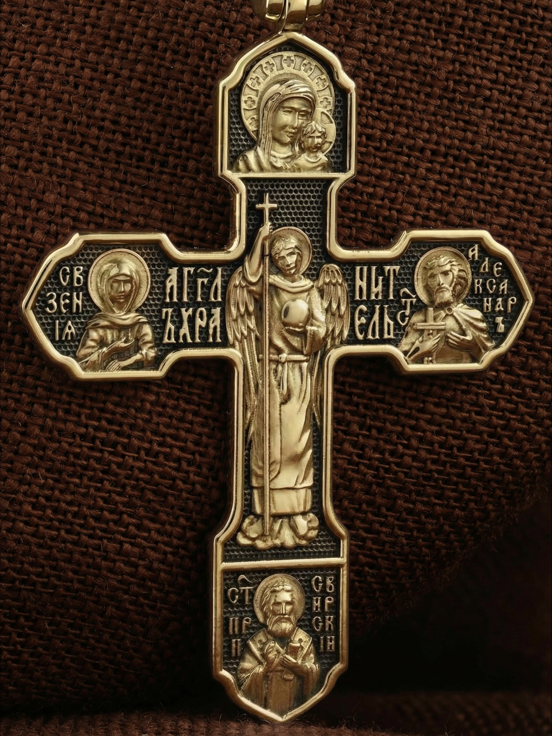 С обратной стороны креста осеняет своими крыльями Ангел Хранитель. Его образ помещен в центральной части, потому что он первый друг и помощник каждому человеку, данный ему от Бога в таинстве крещения. Рядом с Ангелом Хранителем, помещены образы особо почитаемых в Русской Церкви святых, мощи которых находятся в Петербургской епархии. Это св. блаженная Ксения Петербургская, св. блгв. кн. Александр Невский, и великий святой целитель Николай Чудотворец. Вверху креста — Казанская икона Пресвятой Богородицы, одна из самых почитаемых в России.