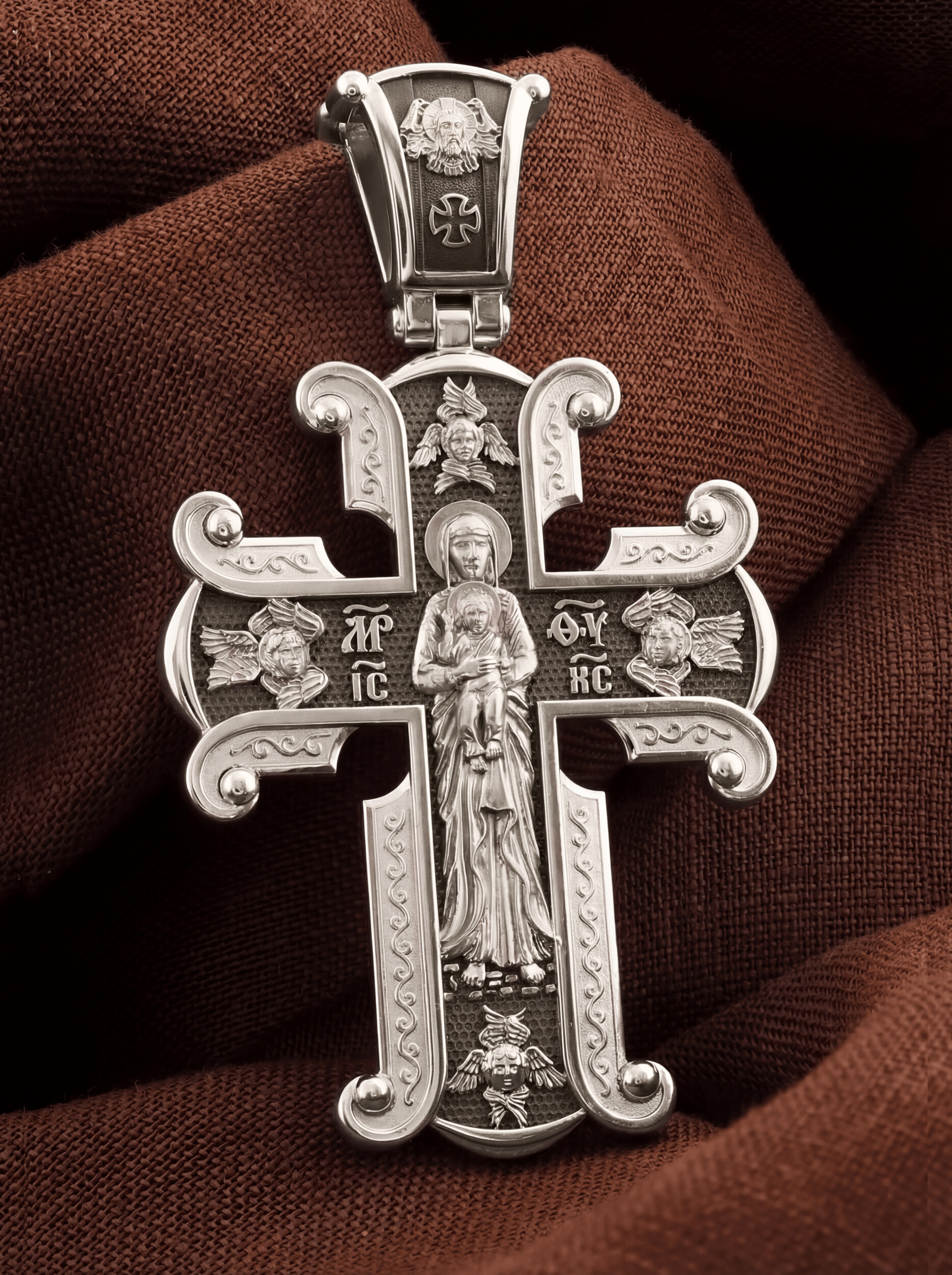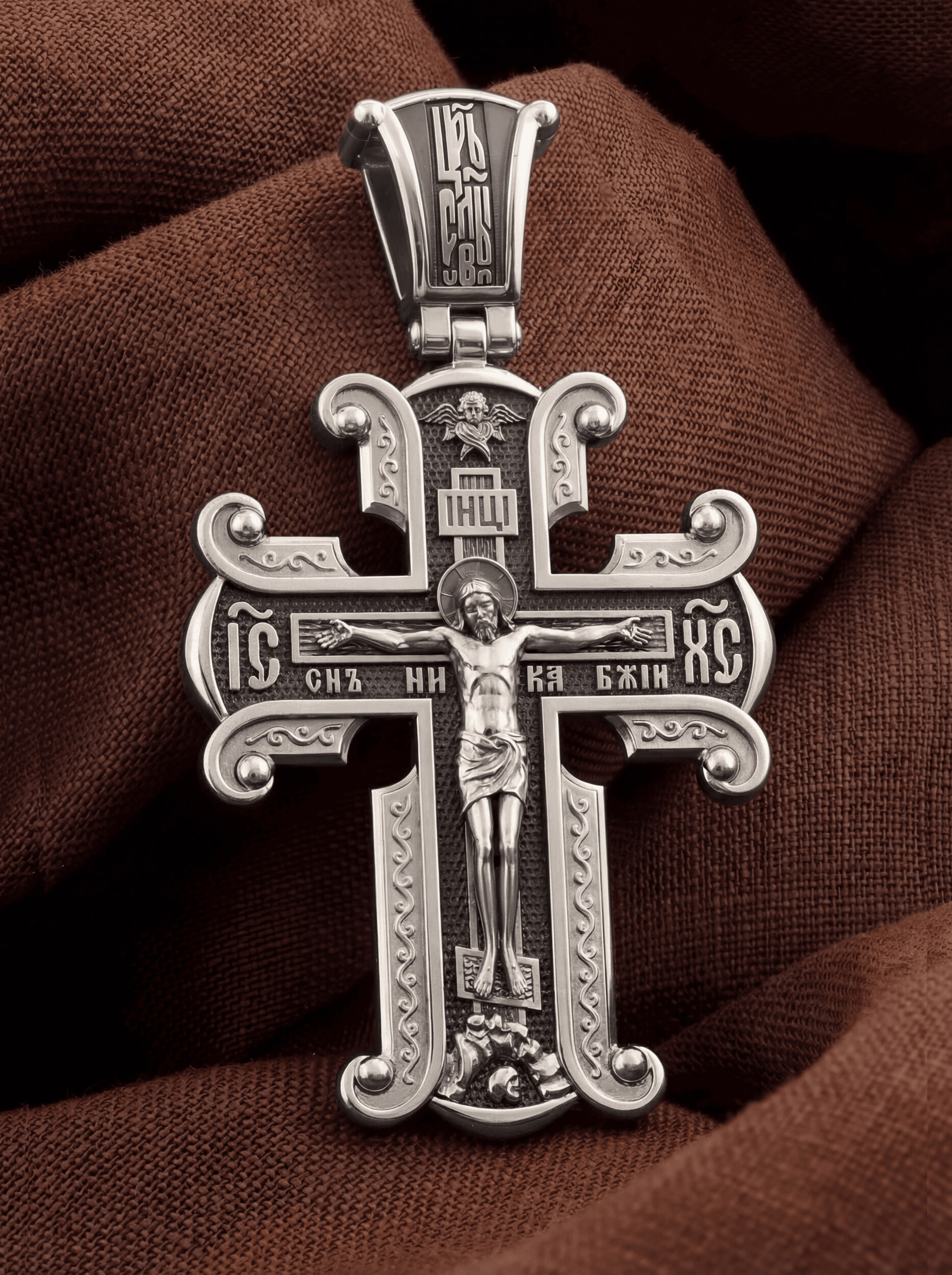 На лицевой стороне необычной формы нательного креста мы видим распятие Господне. Сам крест украшен плетением полурастительной тематики и золотым ободком, заканчивающимся завитками. На кулонном кольце с лицевой стороны надпись — Царь Славы. Под ней — шестикрылый огненный серафим, и буквы «IНЦI», означающие Иисус Назорей Царь Иудейский. С обеих сторон горизонтальной перекладины надписи — монограмма Святого имени Христа — «ИС ХС», а под ней — «НИКА» (Победитель) и «Сын Божий». В подножии мы видим изображенную гору Голгофу в виде скалистой горки с Главой Адамовой в пещере.