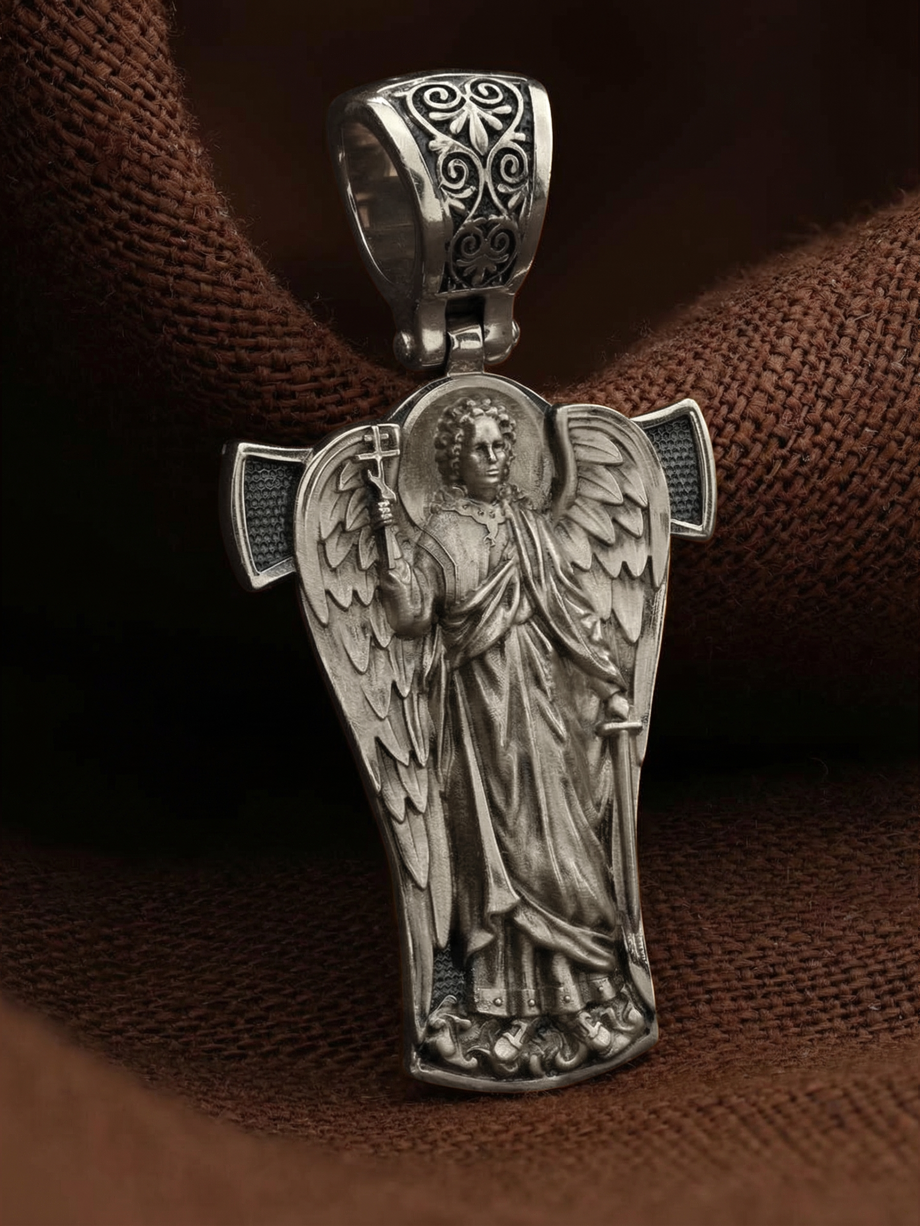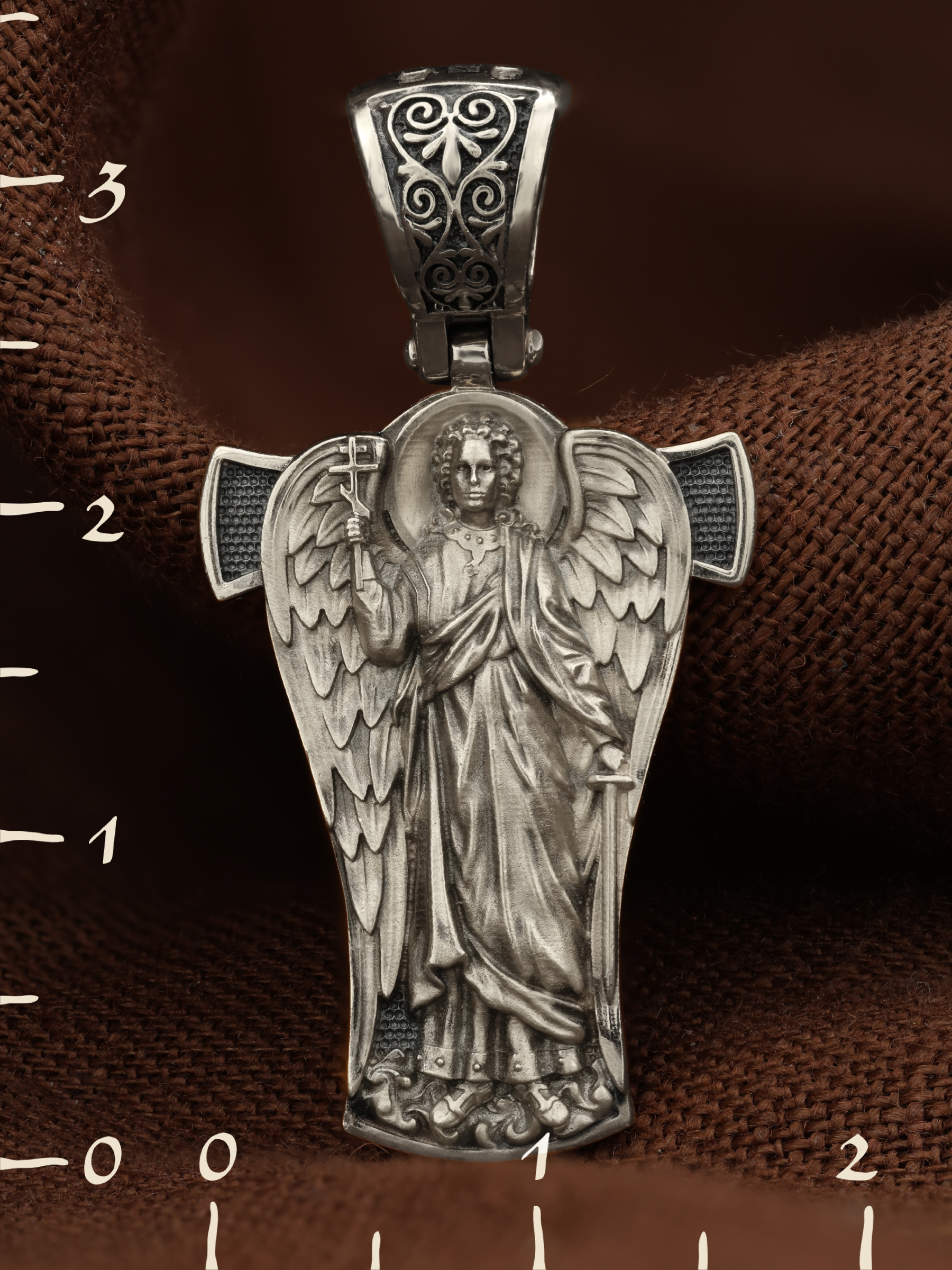Основой композиции является изображение Святого Ангела-Хранителя держащего в правой руке крест, а в левой — мечь. Крест является символом жертвенной любви всеблагого Бога к падшим людям, всепобеждающим духовным оружием христиан, основанием и средоточием церковной жизни. Господь сказал: «кто хочет идти за Мною, отвергнись себя, и возьми крест свой, и следуй за Мною». (Мк. 8: 34). Ангел-Хранитель — это Ангел приставляемый Богом к человеку при крещении для охраны и помощи в добрых делах. Он невидимо находится при человеке на протяжении всей его жизни, если человек сохраняет в себе любовь к Богу и истинную веру перед Ним. Ангел-Xранитель делают для нас все, что служит к истинному нашему благу и спасению. Невидимо пребывая при нас постоянно, он, руководствуя нас ко спасению, не только по нашему желанию таинственно наставляет нас на все доброе и полезное, не только возносит наши молитвы к Богу, но еще и сам от себя охраняют и защищают нас от врагов видимых и невидимых и ходатайствует за нас пред Богом. Ангел-Хранитель так любит нас, как никто на земле любить не может. Одного лишь каждому из нас он желает — спасения души; к этому он направляет все свои заботы. И если видит нас также заботящимися о спасении, радуется, если же видит нас пребывающими в нерадении о душе своей, скорбит. Но и самый великий грешник может примириться со своим Ангелом-Хранителем посредством искреннего раскаяния в грехах и оставления их навсегда. В таком случае, по слову Писания, великая радость бывает для всех ангелов на небесах (Лк. 15:10).