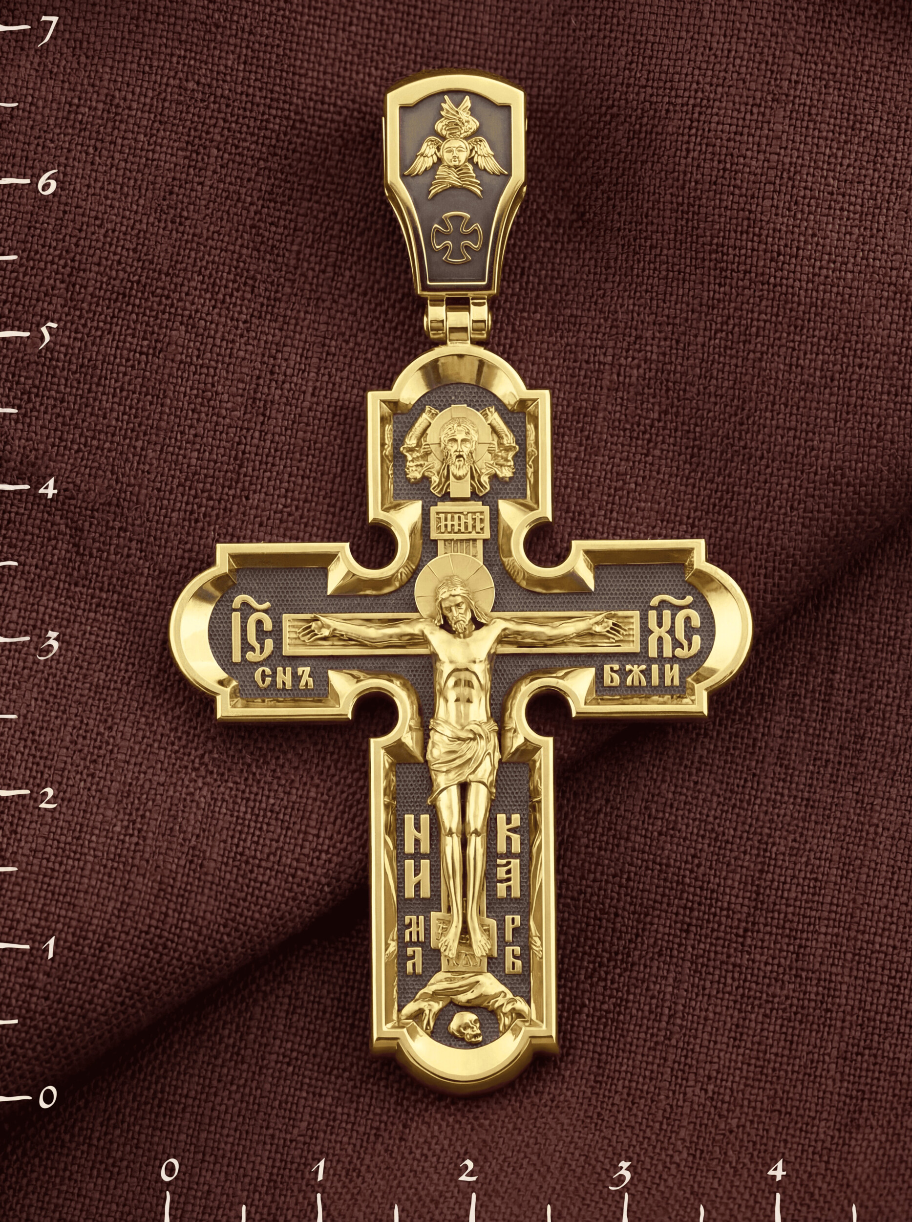 На лицевой стороне нательного креста по традиции изображено Распятие Господа нашего Иисуса Христа. Крест Господень стоит на небольшом каменистом возвышении, символизирующем гору Голгофу, которая обозначена буквами МЛРБ (Место Лобное Рай Бысть). Над головой Господа на поперечной перекладине написано «ИНЦИ», что символизирует табличку, которая была прибита к Кресту, с надписью «Иисус Назорей Царь Иудейский». Этим иудеи хотели посмеяться над Христом, не зная, что распинают истинного Царя всех царей. По сторонам основной перекладины расположены позолоченные рельефные инициалы Христа «ИС ХС». Под перекладиной, по сторонам древа, находится надпись «СЫН БОЖИЙ», а в основании креста — надпись «НИКА» (Победитель).