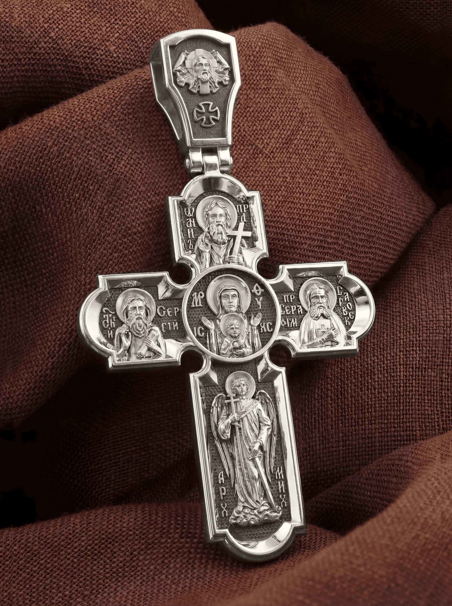 Центральную часть оборота креста украшает икона Божией Матери «Знамение». Икона «Знамение» написана по пророчеству пророка Исайи, предрекшего, что Господь Иисус Христос родится от Девы. На кресте внизу изображен Архангел Михаил, слева — прп. Сергий Радонежский, справа — образ Преподобного Серафима Саровского, вверху — последний пророк, почитающийся в христианстве, Предтеча Господень Иоанн Креститель. На кулонном кольце помещено изображение Спаса Нерукотворного — образ Спасителя, который Он запечатлел на плате и передал для исцеления больному проказой царю Эдессы. Ему придается победное и защитное значение.