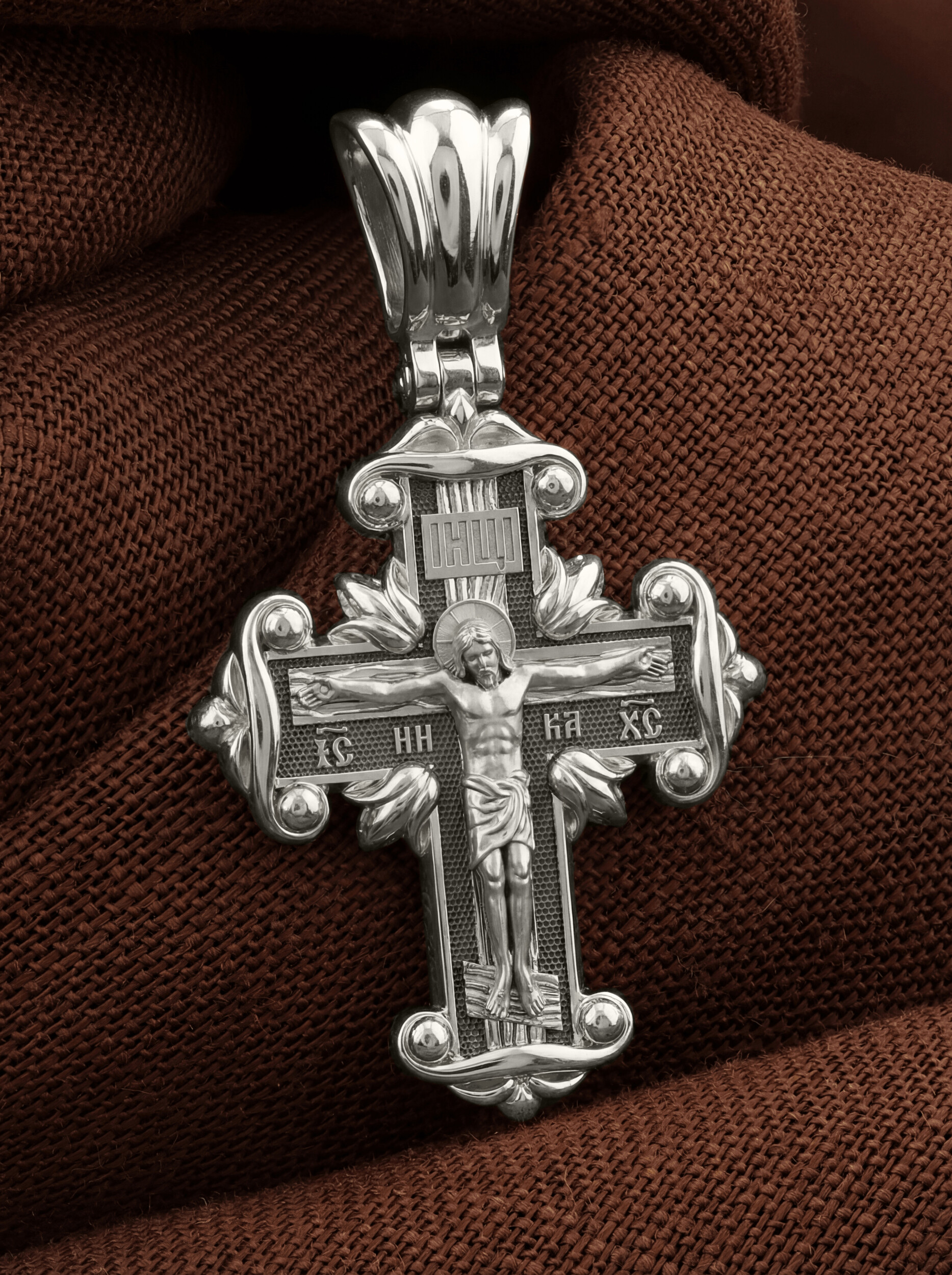 На лицевой стороне креста изображено Распятие Господа и Спасителя нашего Иисуса Христа, отдавшего Себя на смерть, для искупления грехов мира. Крест является символом жертвенной любви Всеблагого Бога к падшим людям, всепобеждающим духовным оружием христиан, основанием и средоточием церковной жизни. Господь сказал: кто хочет идти за Мною, отвергнись себя, и возьми крест свой, и следуй за Мною. (Мк. 8: 34). На верхней табличке, выше головы Иисуса, расположена надпись, составленная Понтием Пилатом — «IНЦI». Она означает «Иисус Назорей, Царь Иудейский». Надпись «IC» «ХC», означает Иисус Христос, помещается на разных сторонах поперечной перекладины креста. Рядом — слово «НИКА», что означает «победитель». На православном кресте Христос не умирает, а свободно простирает руки, ладони Иисуса открыты, будто он хочет обнять все человечество, даря им свою любовь и открывая путь к вечной жизни.