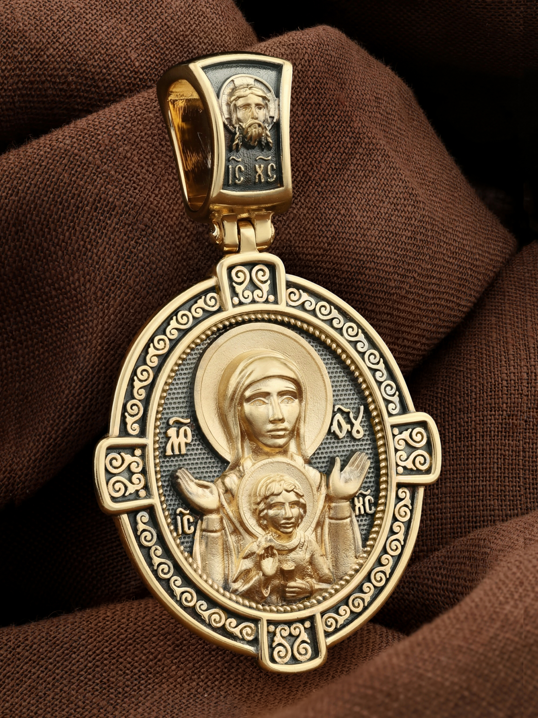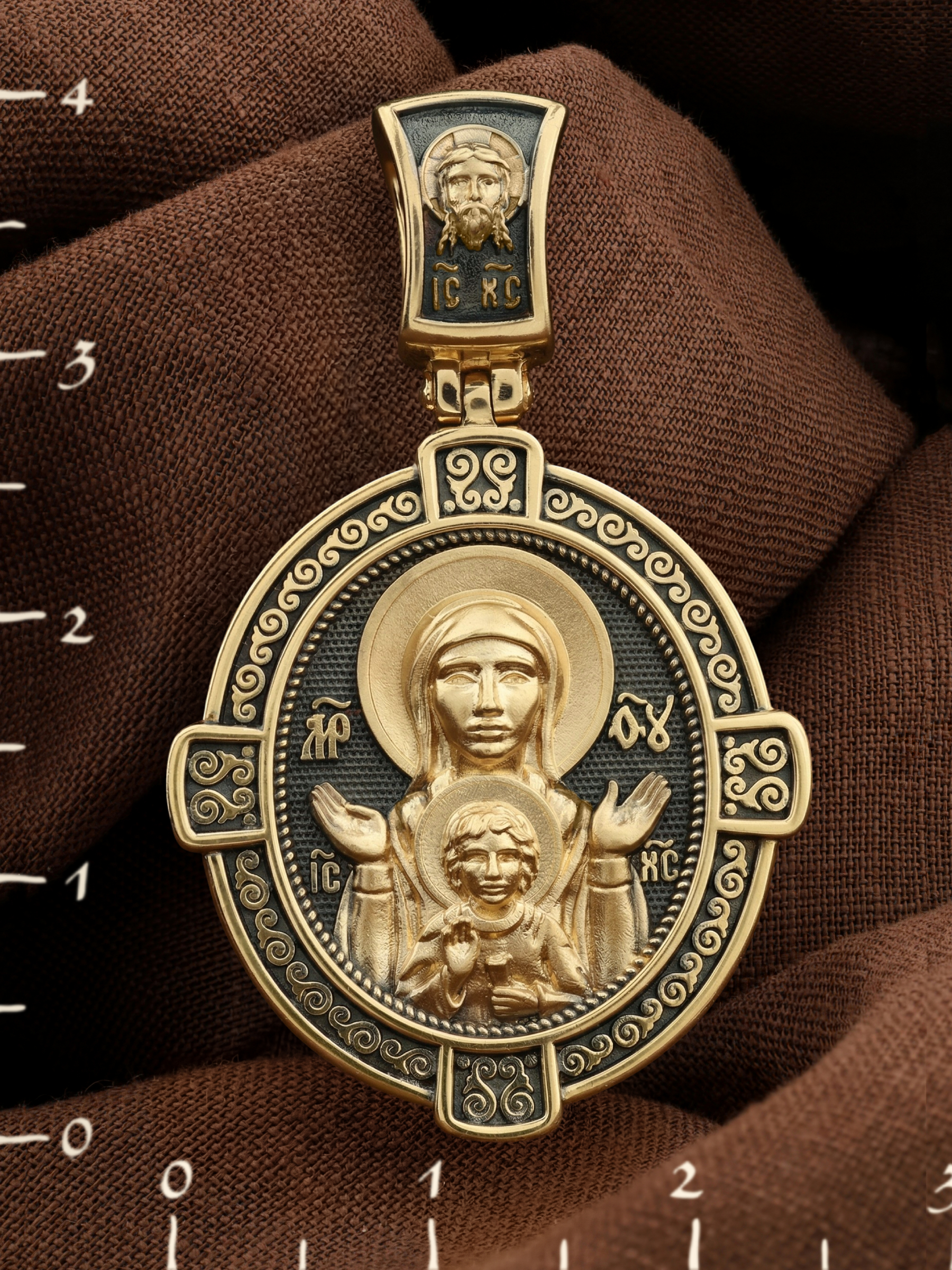 В центр образка помещен образ Божией Матери «Знамение», прославившийся многими чудесами в Новгороде в XII веке. Икона эта чтится как одна из самых великих святынь Русской земли. Молитвенно воздетые руки Богородицы означают заступничество за людей пред Богом. Рядом с Ней — благословляющий Божественный Младенец — Спас-Эммануил.