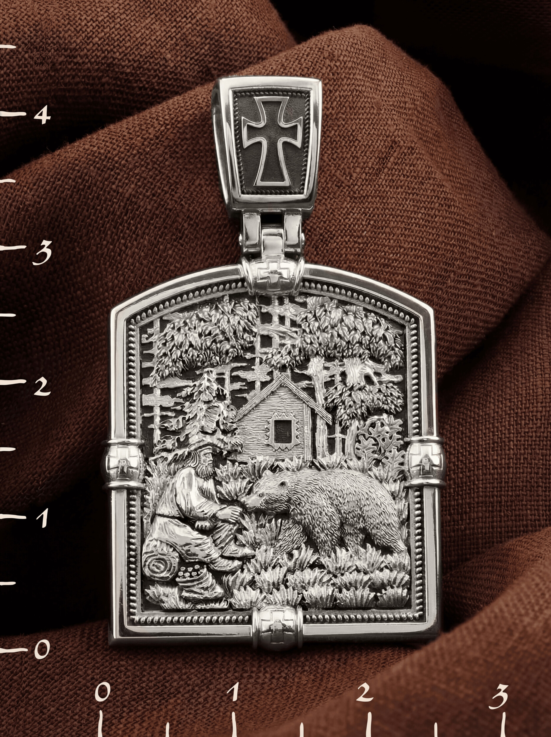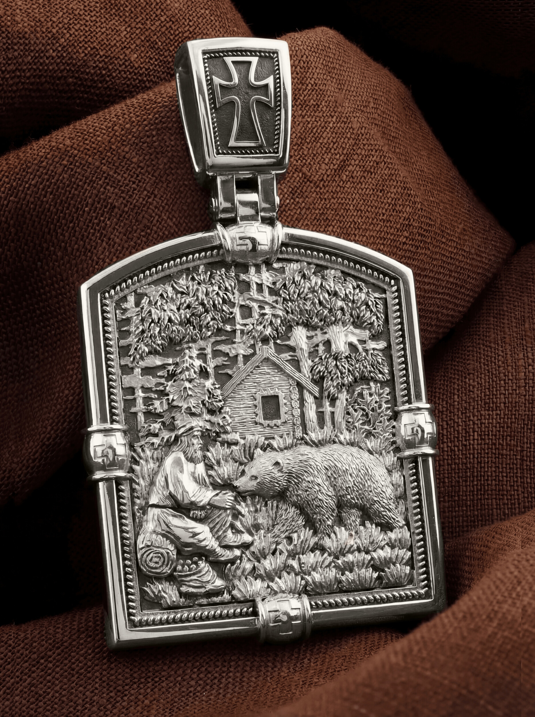 На образке изображен один из самых узнаваемых моментов жития преподобного: Тысячу дней и тысячу ночей Серафим провел в подвиге столпничества на каменном валуне. Узнав о строгой жизни преподобного отца Серафима, многие приходили к нему за советом и наставлениями. Умея узнавать и различать людей, старец от некоторых уклонялся, сохраняя молчание. Но тех, кто имел до него действительную духовную нужду, он охотно принимал и с любовью руководил их своими советами, наставлениями и духовными беседами. Даже диким зверям преподобный Серафим внушал благоговение: многие, посещавшие его в дальней пустыне, видели около него громадного медведя, которого он кормил из рук.
