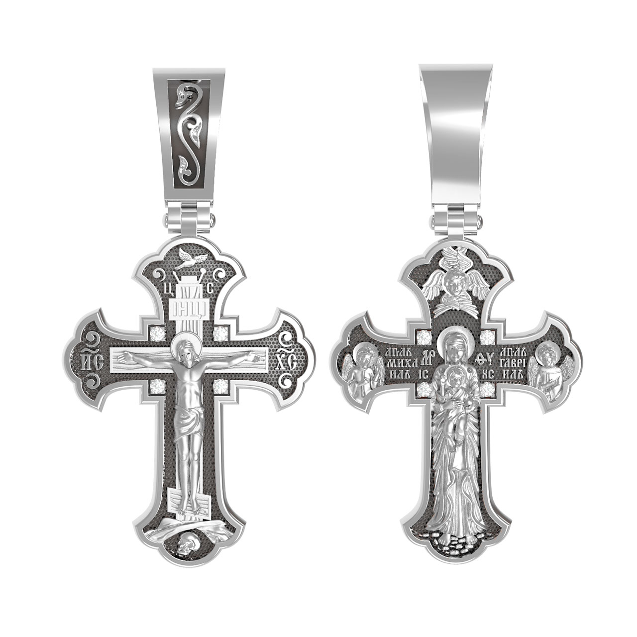 На лицевой стороне этого креста центральную часть занимает икона Распятия Христа — образ жертвы, принесенной Господом за грехи людей. Именно ко Христу, сошедшему на землю ради нашего спасения, возносятся все молитвы. Пресвятая Богородица, ангелы и святые — помощники Господа в деле спасения и заступники за людей перед Богом. «Оружием великим Христовым» именует Церковь крест, потому что, претерпев страдания и умерев, Господь победил смерть и лишил дьявола его власти над миром. Поэтому рядом с титлами Святого имени Христа написано «НИКА», что значит «победитель».