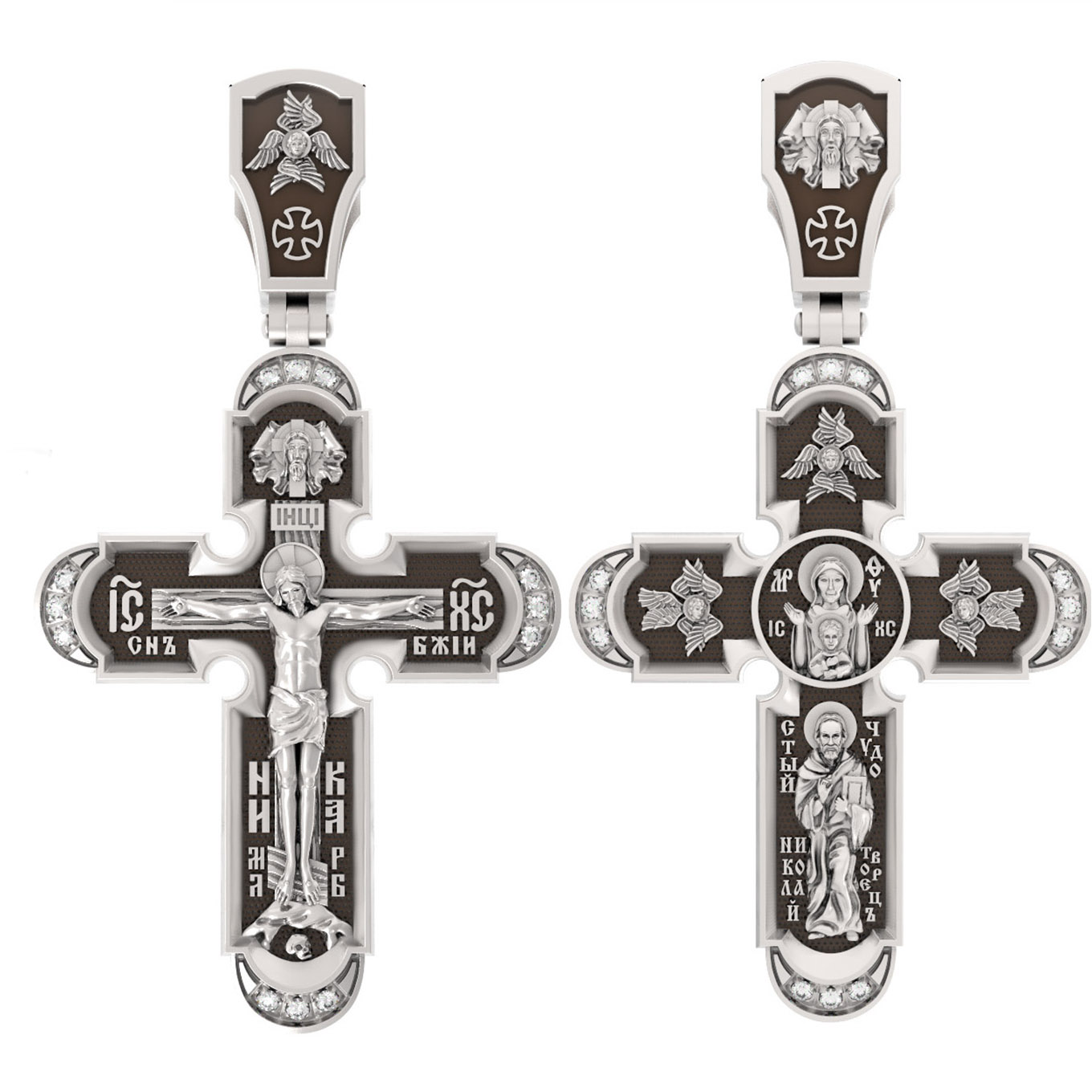 На лицевой стороне нательного креста по традиции изображено Распятие Господа нашего Иисуса Христа. Крест Господень стоит на небольшом каменистом возвышении, символизирующем гору Голгофу, которая обозначена буквами МЛРБ (Место Лобное Рай Бысть). Над головой Господа на поперечной перекладине написано «ИНЦИ», что символизирует табличку, которая была прибита к Кресту, с надписью «Иисус Назорей Царь Иудейский». Этим иудеи хотели посмеяться над Христом, не зная, что распинают истинного Царя всех царей. По сторонам основной перекладины расположены позолоченные рельефные инициалы Христа «ИС ХС». Под перекладиной, по сторонам древа, находится надпись «СЫН БОЖИЙ», а в основании креста — надпись «НИКА» (Победитель).