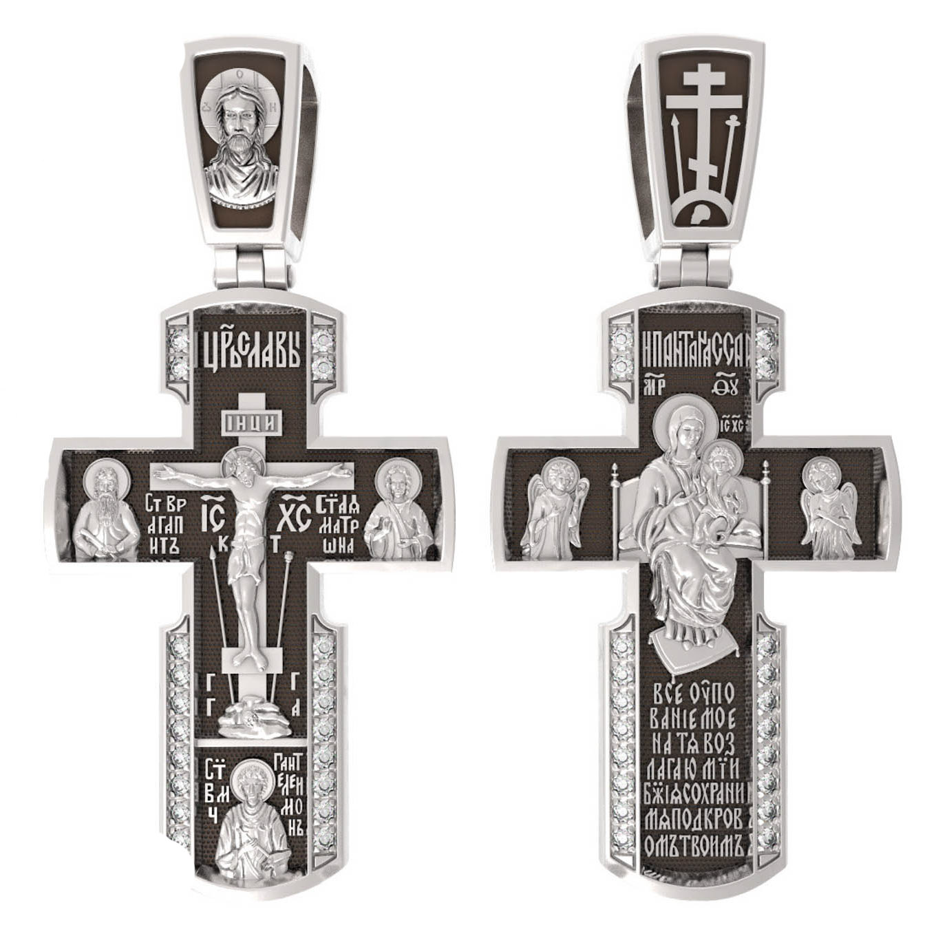 На лицевой стороне креста изображено Распятие Иисуса Христа на Голгофском Кресте, над вершиной которого помещена надпись «Царь Славы». Справа от Распятия помещен образ прославленной святой блаженной Матроны. «Матронушка», — ласково называют эту святую православные за удивительную любовь и помощь, которую она подает всем нуждающимся в ее поддержке. Слева — икона прп. Агапита. Этот святой жил в пещерах Киево-Печерского монастыря в XI веке и бескорыстно врачевал мирян и монахов.