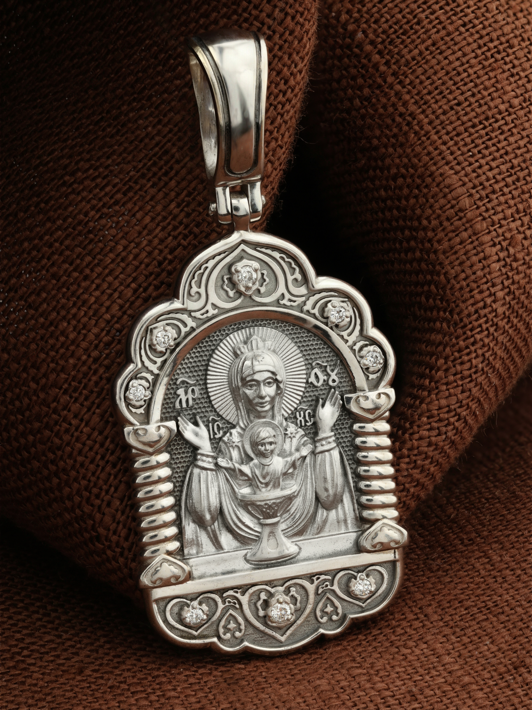 На лицевой части образка изображена икона Божией Матери «Неупиваемая чаша». Икона славится помощью в исцелении зависимостей, помогает людям обрести свободу от греховных страстей.