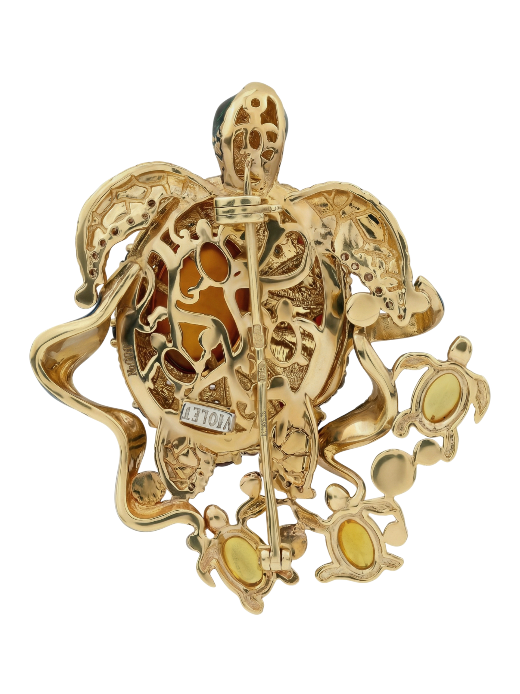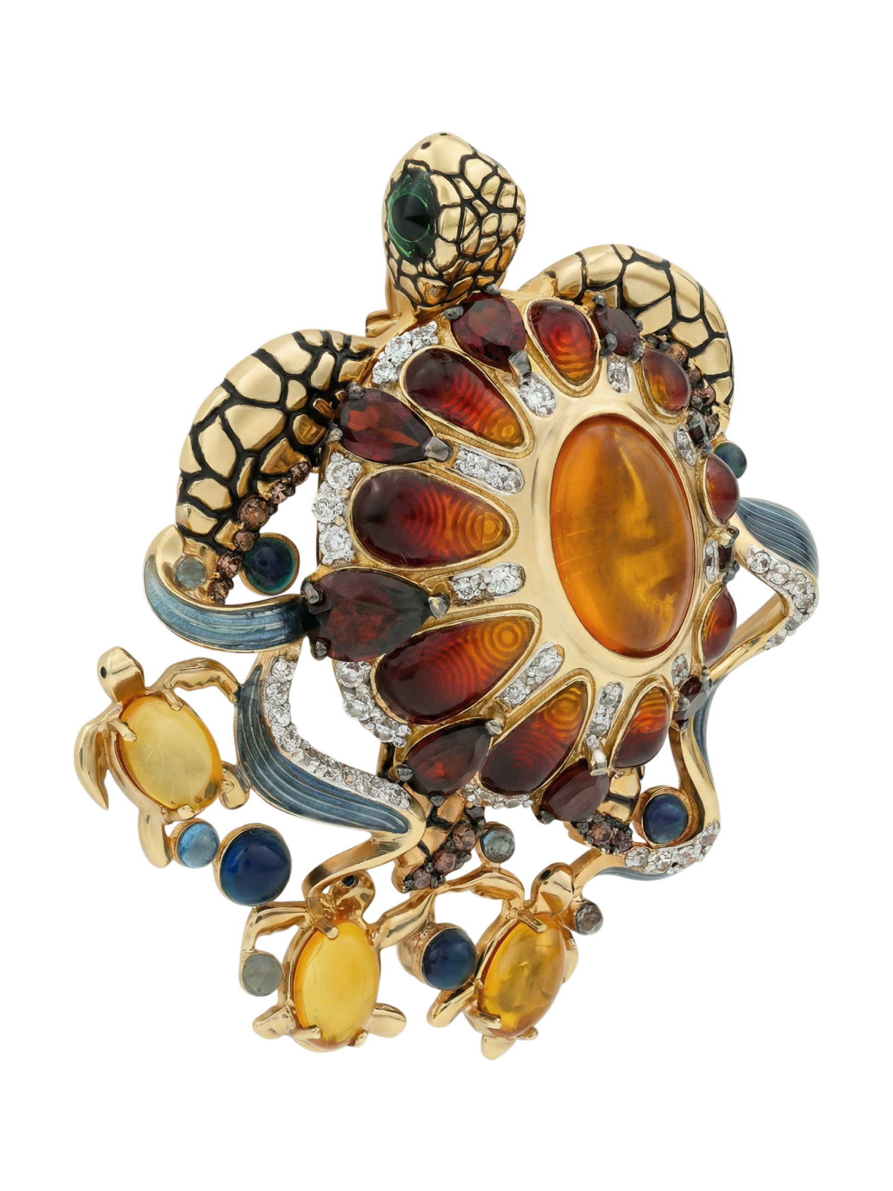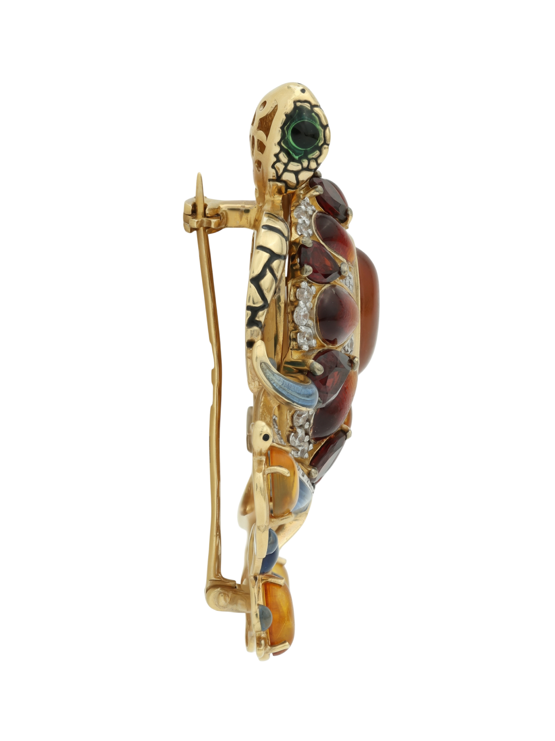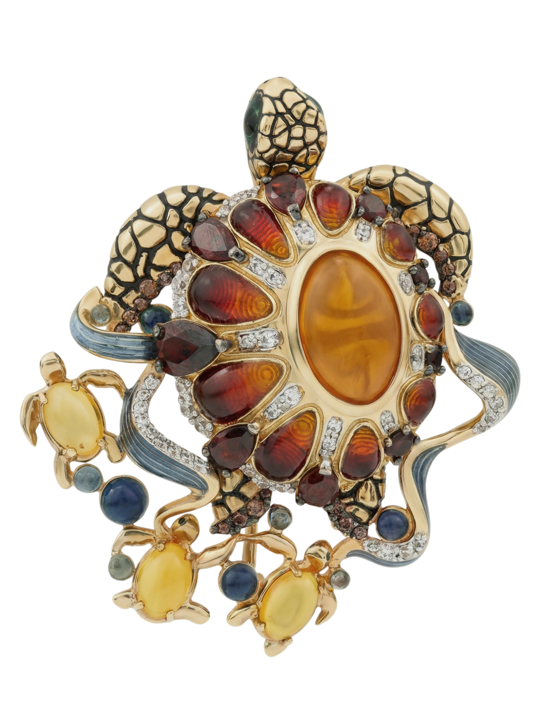 Брошь из лимонного золота c эмаль, фианитом, гранатом и янтарём