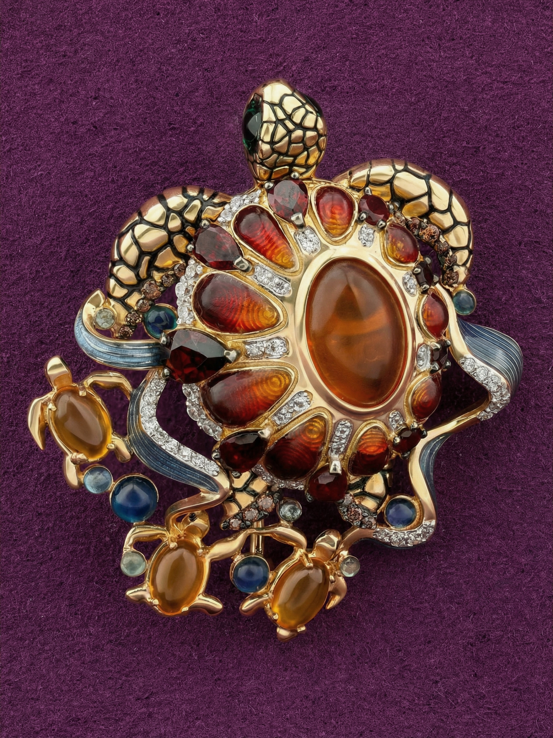 Брошь из лимонного золота c эмаль , фианитом, гранатом и янтарём