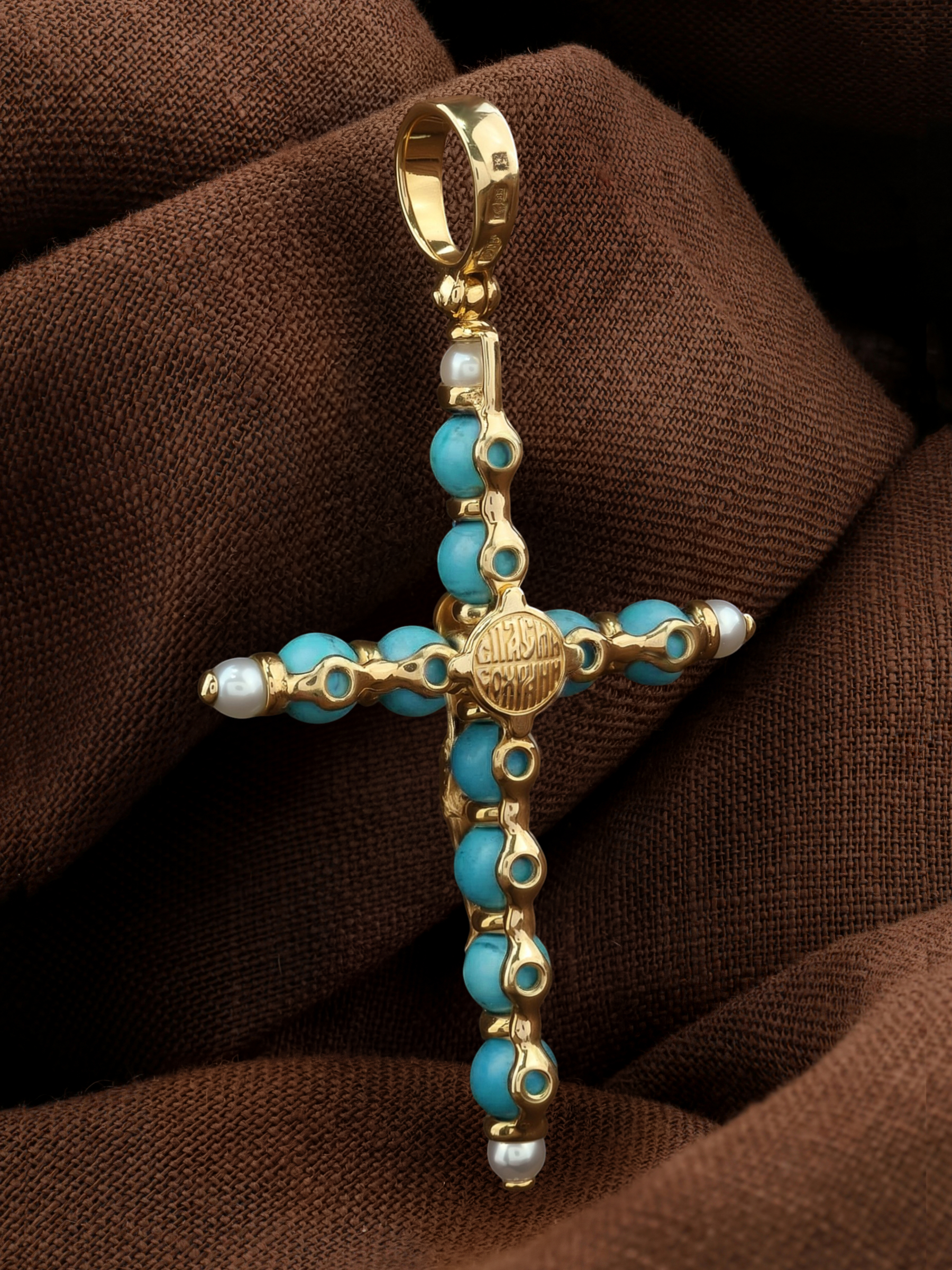 Крест из лимонного золота c жемчугом и бирюзой