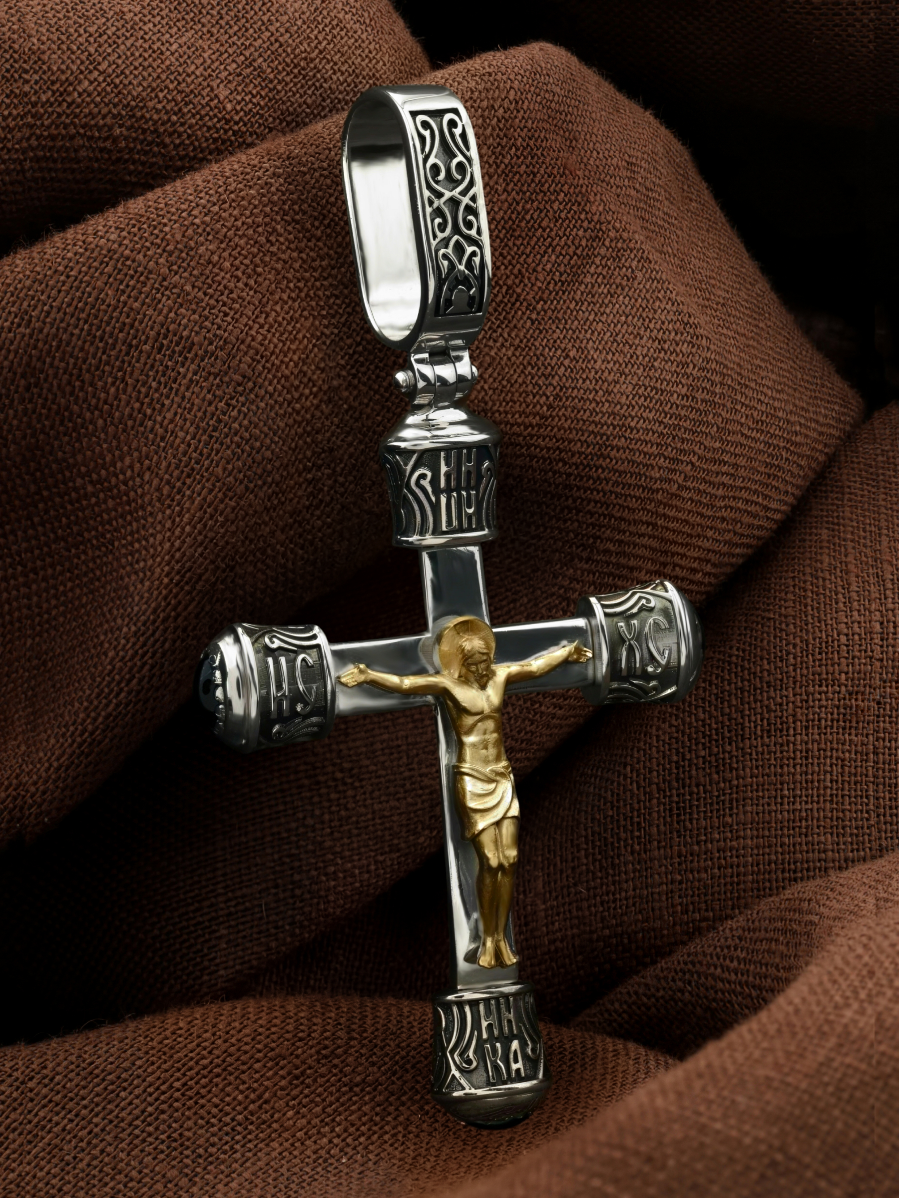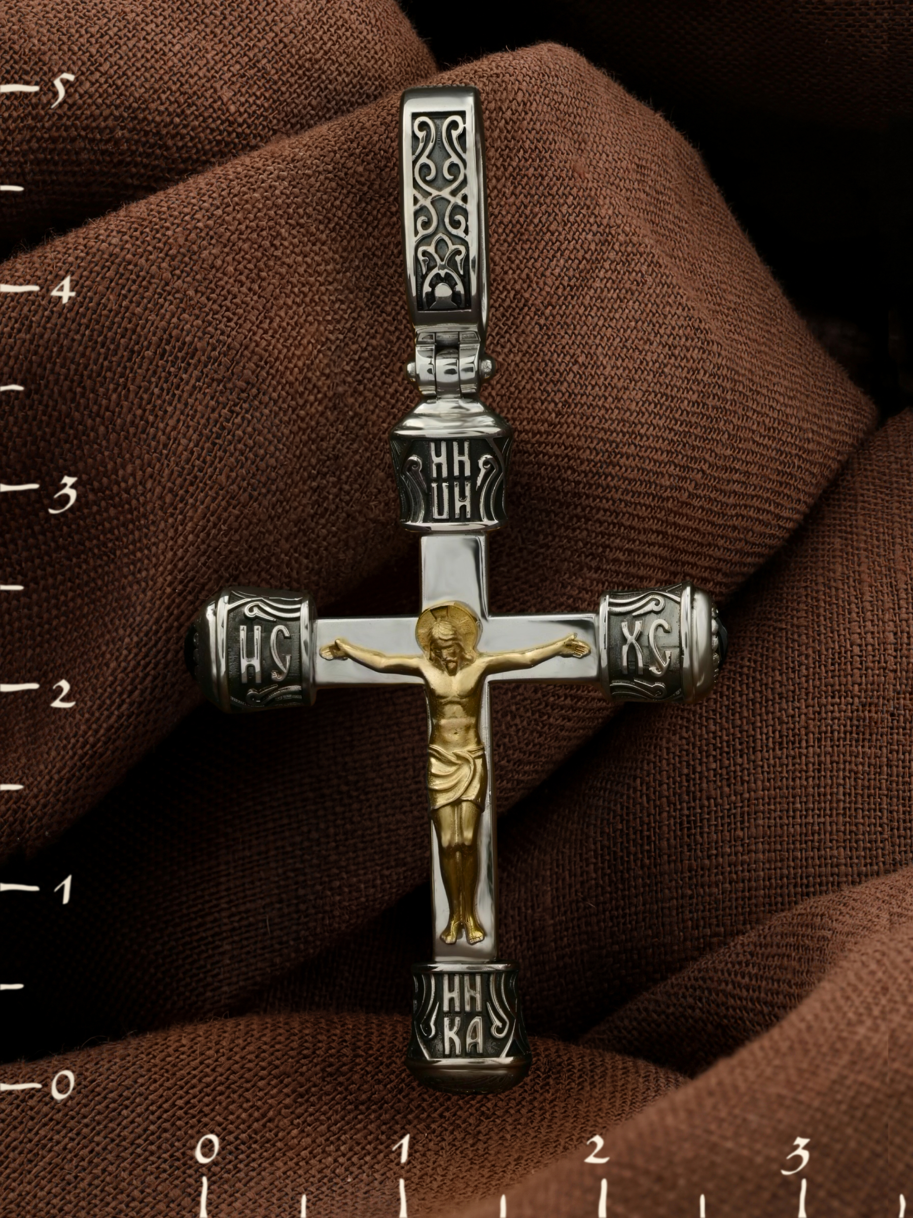 На лицевой стороне креста изображено Распятие Господа и Спасителя нашего Иисуса Христа. В Голгофе сокрыта непостижимая тайна бесконечной правды и любви Бога. Крест стал символом победы добра над злом, жизни над смертью, напоминанием бесконечной Божьей любви, предметом радости. Воплотившийся Сын Божий Своею кровью освятил крест и сделал его проводником Своей благодати, источником освящения верующих. Над распятием расположена надпись, составленная Понтием Пилатом — «ИНЦИ». Она означает «Иисус Назорей, Царь Иудейский». Надпись «ИС» «ХС» означает Иисус Христос и помещается на разных сторонах поперечной перекладины креста. В нижней части креста расположена «НИКА», что означает «победитель». На православном кресте Христос не умирает, а свободно простирает руки, ладони Иисуса открыты, будто он хочет обнять все человечество, даря им свою любовь и открывая путь к вечной жизни.
