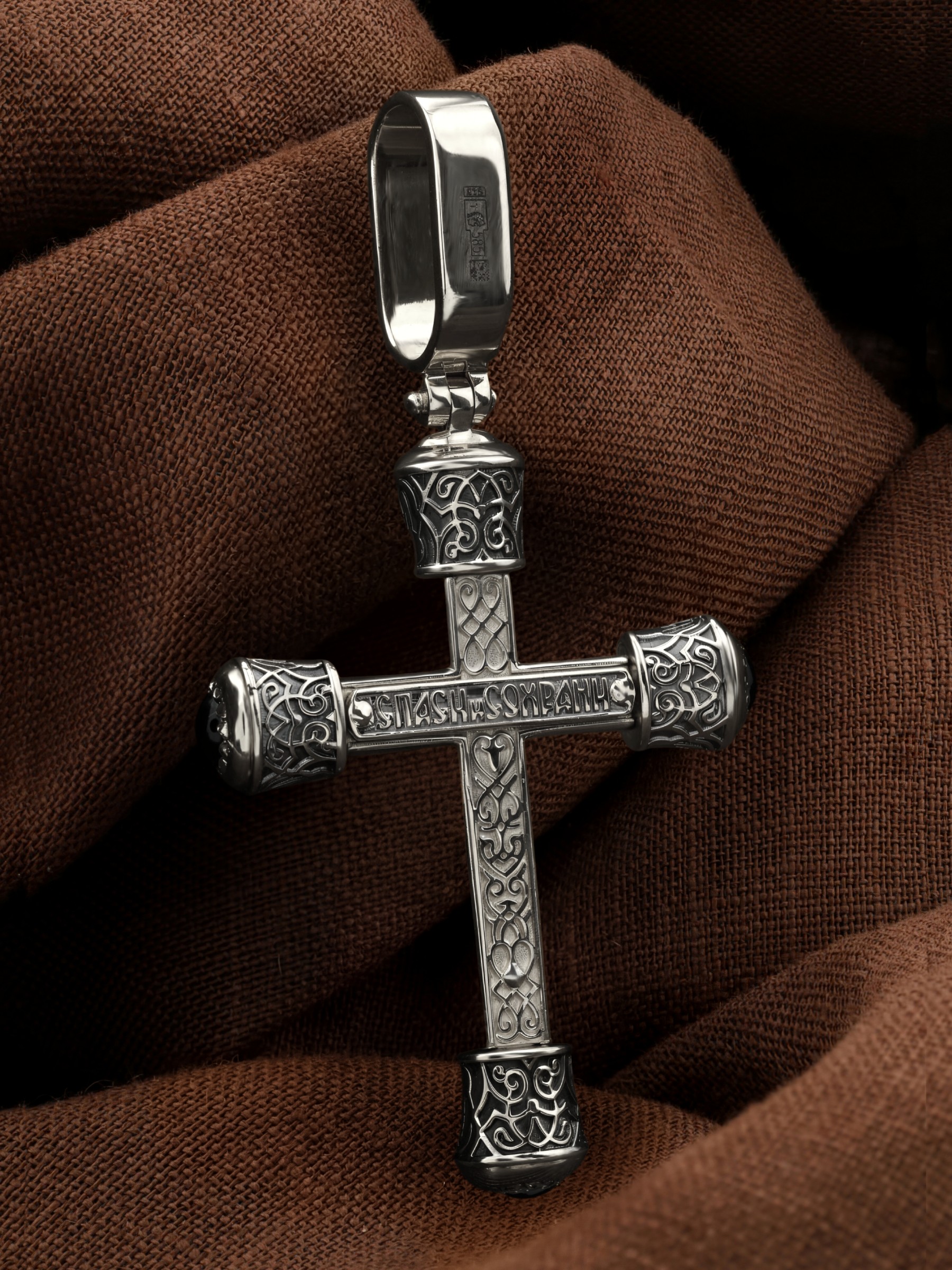 На оборотной стороне креста написана молитва: «Спаси и сохрани». Крест украшен орнаментом.