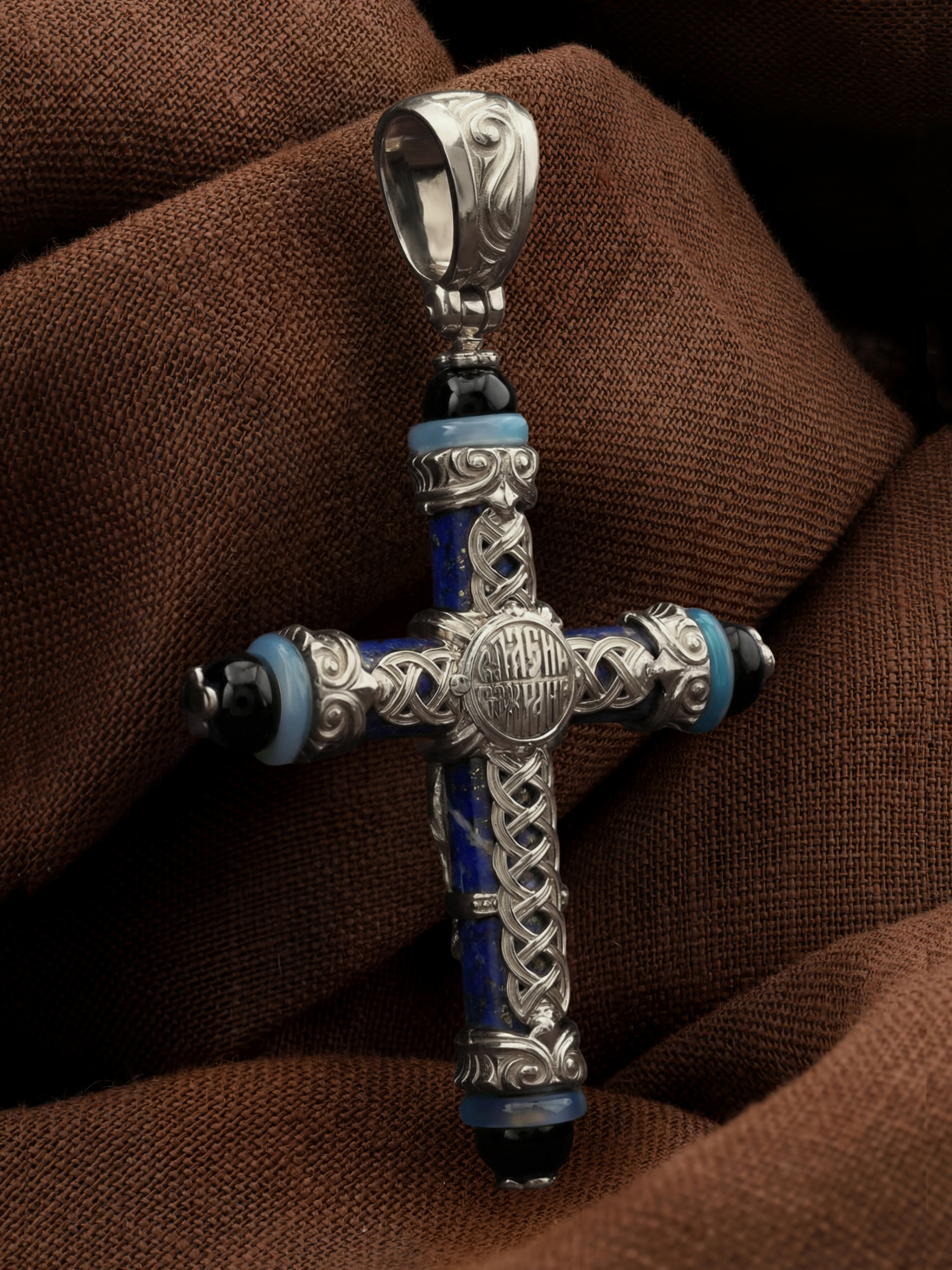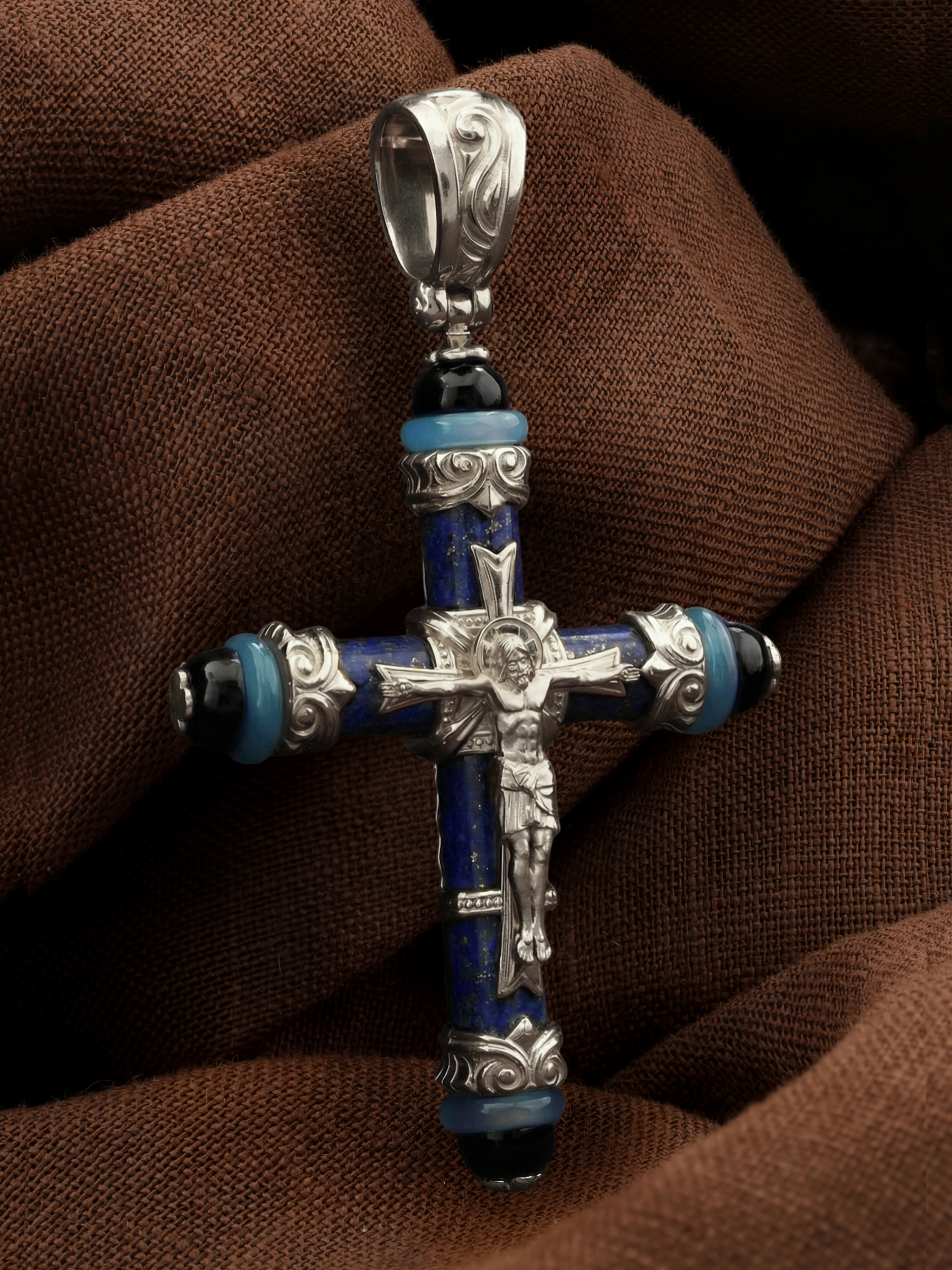Крест из белого золота c ониксом, агатом и лазуритом