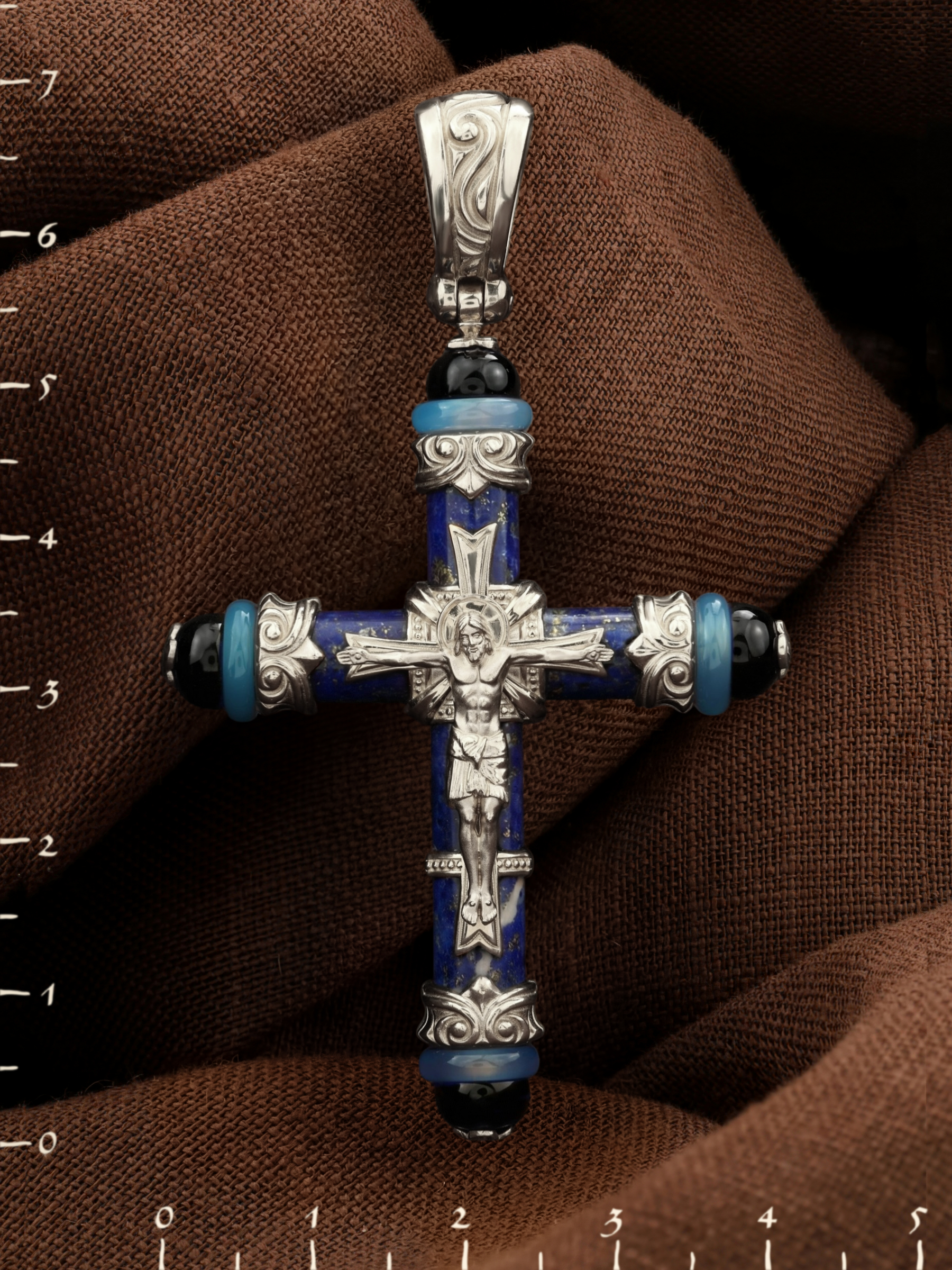 Крест из белого золота c ониксом, агатом и лазуритом