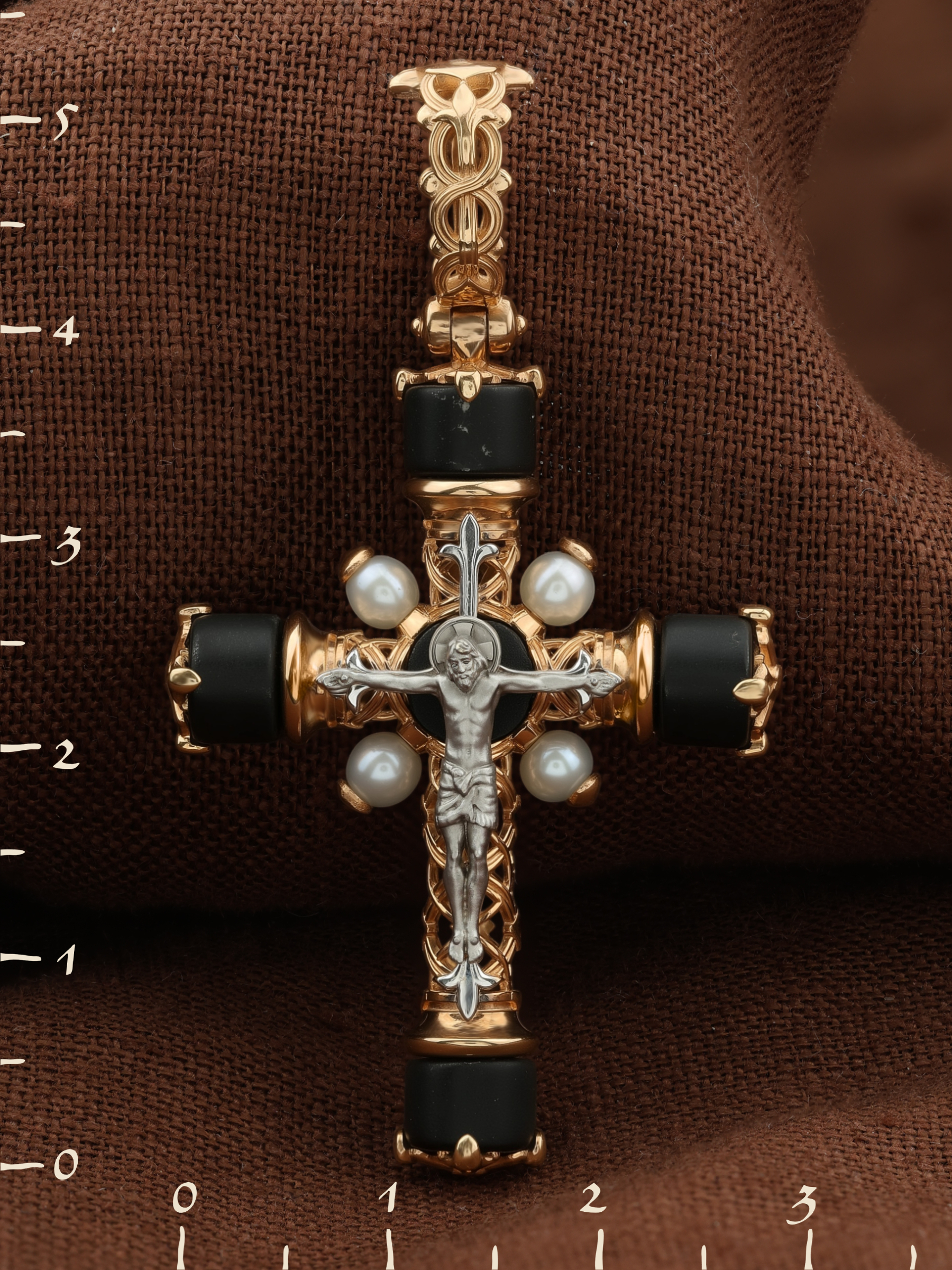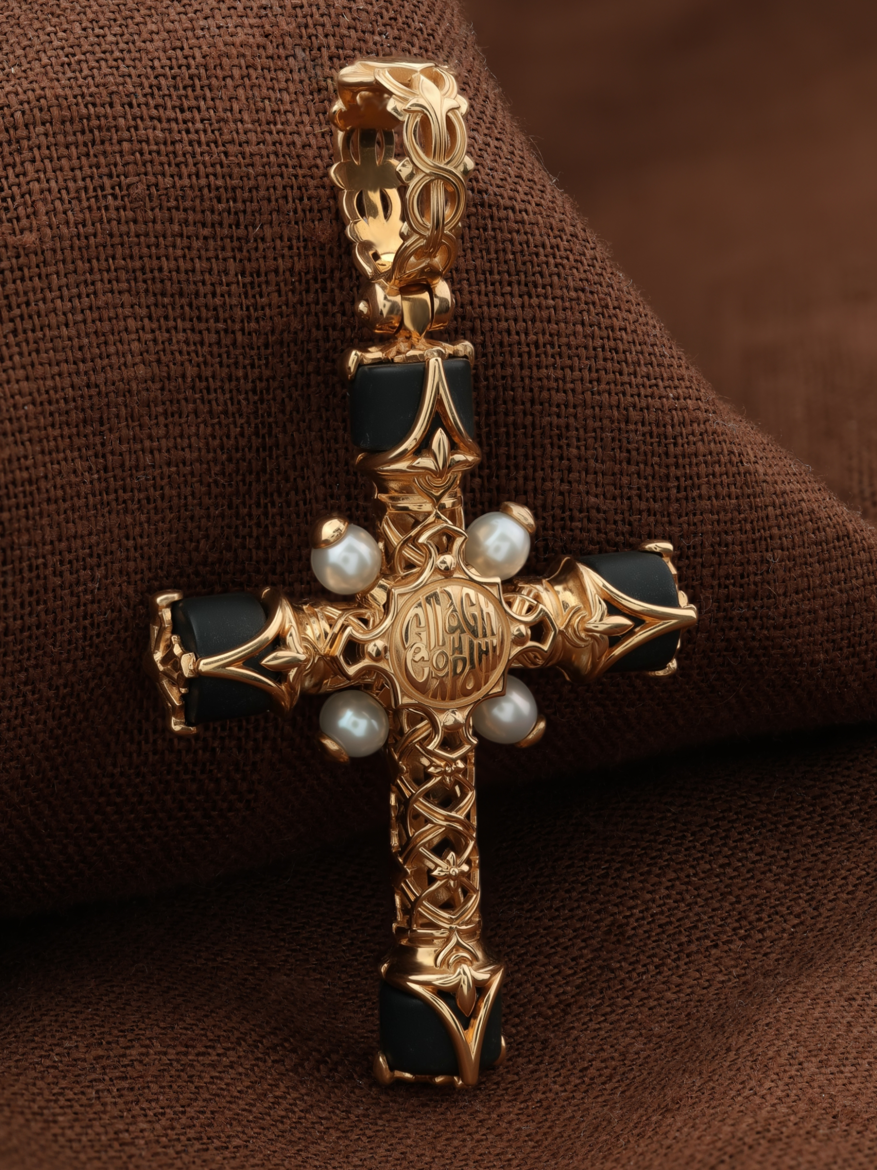 На лицевой стороне креста изображено Распятие Господа и Спасителя нашего Иисуса Христа. Своими крестными страданиями Господь смыл наши грехи, покрыл наш долг перед Богом или, на языке Писания, нас «искупил». В Голгофе сокрыта непостижимая тайна бесконечной правды и любви Бога. Крест стал символом победы добра над злом, жизни над смертью, напоминанием бесконечной Божьей любви, предметом радости. Воплотившийся Сын Божий Своею кровью освятил крест и сделал его проводником Своей благодати, источником освящения верующих. Господь сказал: кто хочет идти за Мною, отвергнись себя, и возьми крест свой, и следуй за Мною. (Мк. 8: 34). На православном кресте Христос не умирает, а свободно простирает руки, ладони Иисуса открыты, будто он хочет обнять все человечество, даря им свою любовь и открывая путь к вечной жизни.
