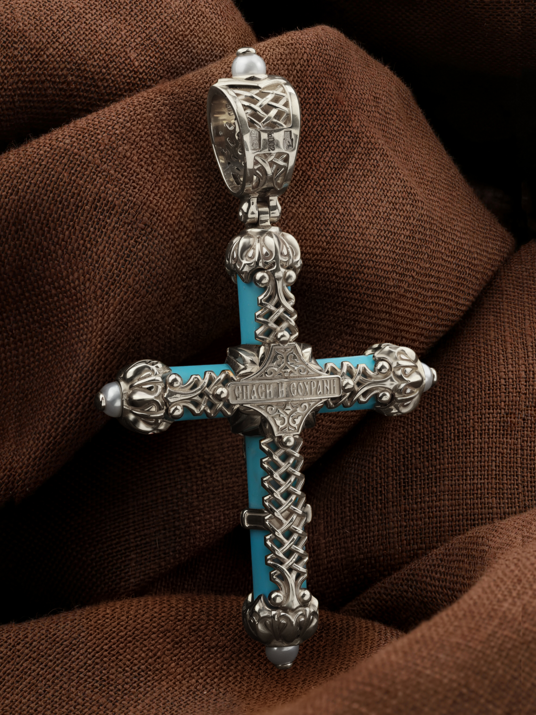 Крест из белого золота c жемчугом и бирюзой