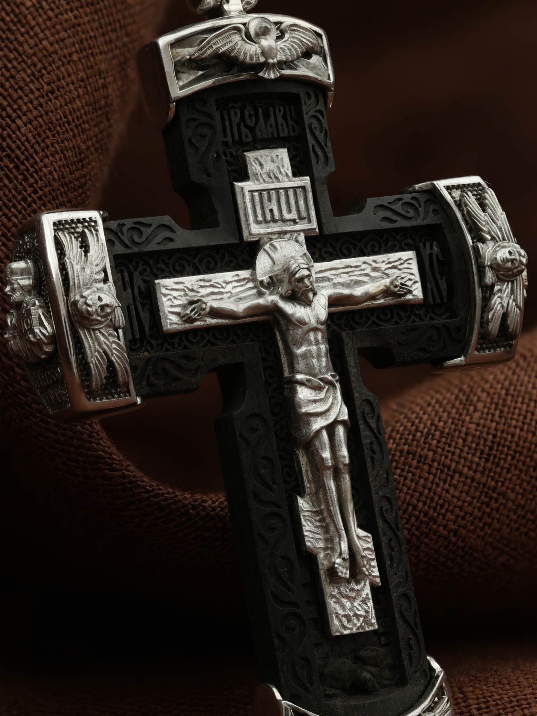 На лицевой стороне креста изображено Распятие, потому что это орудие казни Иисус Христос сделал орудием победы над грехом и смертью. Своими страданиями Он искупил грехи человечества, умерев и сошествовав во ад, победил сатану, освободил души праведников от вечной смерти и открыл им небесные врата рая. Жертва Христа сделала возможным спасение для каждого человека. На православном кресте Христос не умирает, а свободно простирает руки, ладони Иисуса открыты, будто он хочет обнять все человечество, даря им свою любовь и открывая путь к вечной жизни.