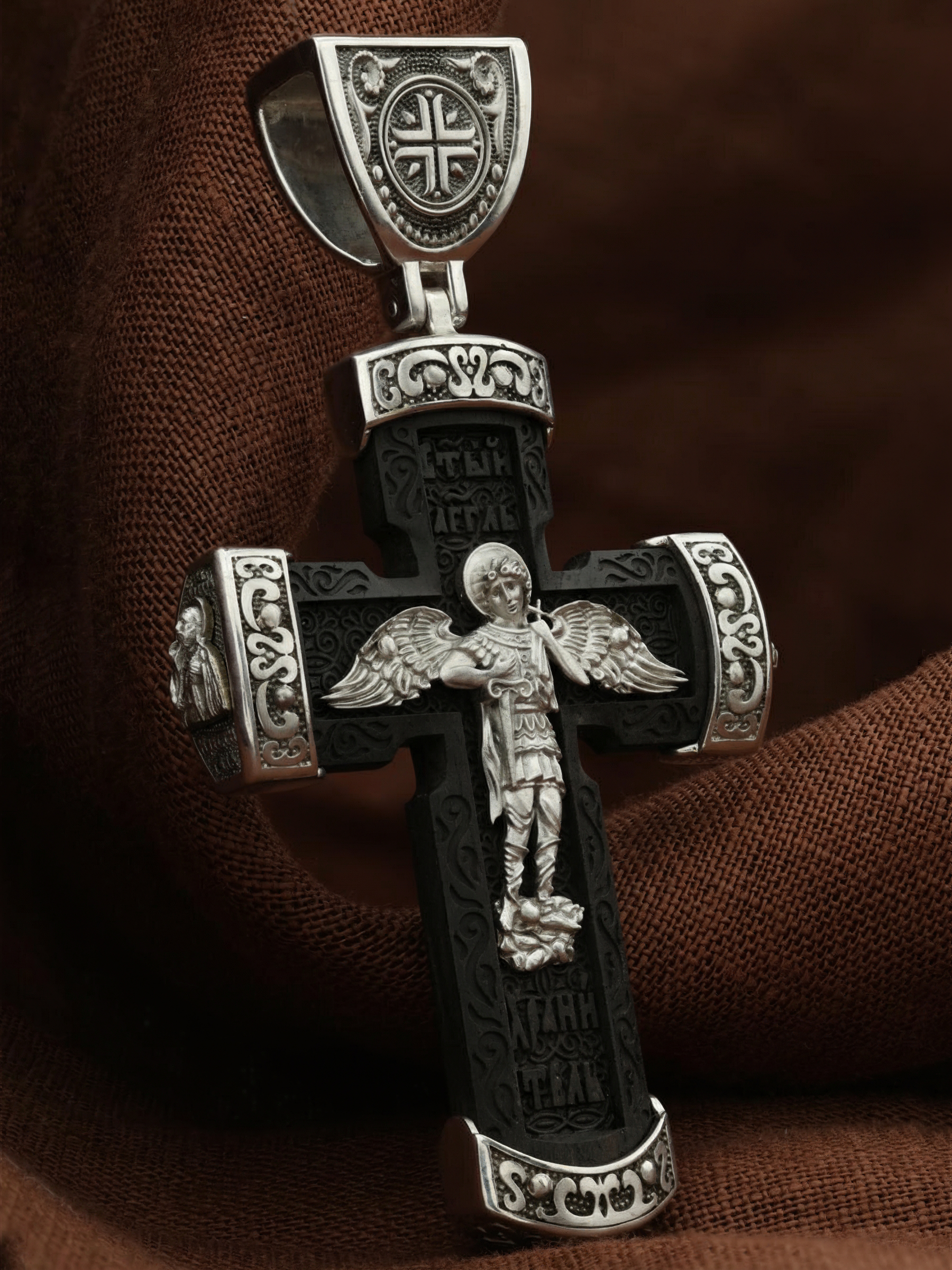 В центре оборота креста изображен Ангела Хранителя с традиционными атрибутами в руках: крестом, которым он осеняет человека, и мечом для прогнания бесов. По Православному учению, каждому, принявшему святое крещение, дается Господом Ангел Хранитель, который сопровождает человека всю его жизнь, помогая в добрых делах и охраняя от нападок злых духов. Святые отцы утверждают, что только верующий человек имеет рядом с собой Ангела Хранителя: «Тем, которые сподобились крещения и возносятся на высоту добродетелей, даны от Бога Ангелы, заботящиеся о них и содействующие им. В этом уверяет нас Господь, когда говорит, что есть Ангелы Хранители у всякого, кто верует в Него» (преп. Анастасий Синаит). Но Ангел Хранитель пребывает с христианином, если только мы не прогоним его греховными делами, поскольку «как дым разгоняет пчел, так и грех прогоняет от нас Ангела Хранителя» (свт. Василий Великий). Но и после завершения земного пути Ангел Хранитель не покидает христианина, а помогает душе преодолеть воздушные мытарства на пути в Царство Небесное.