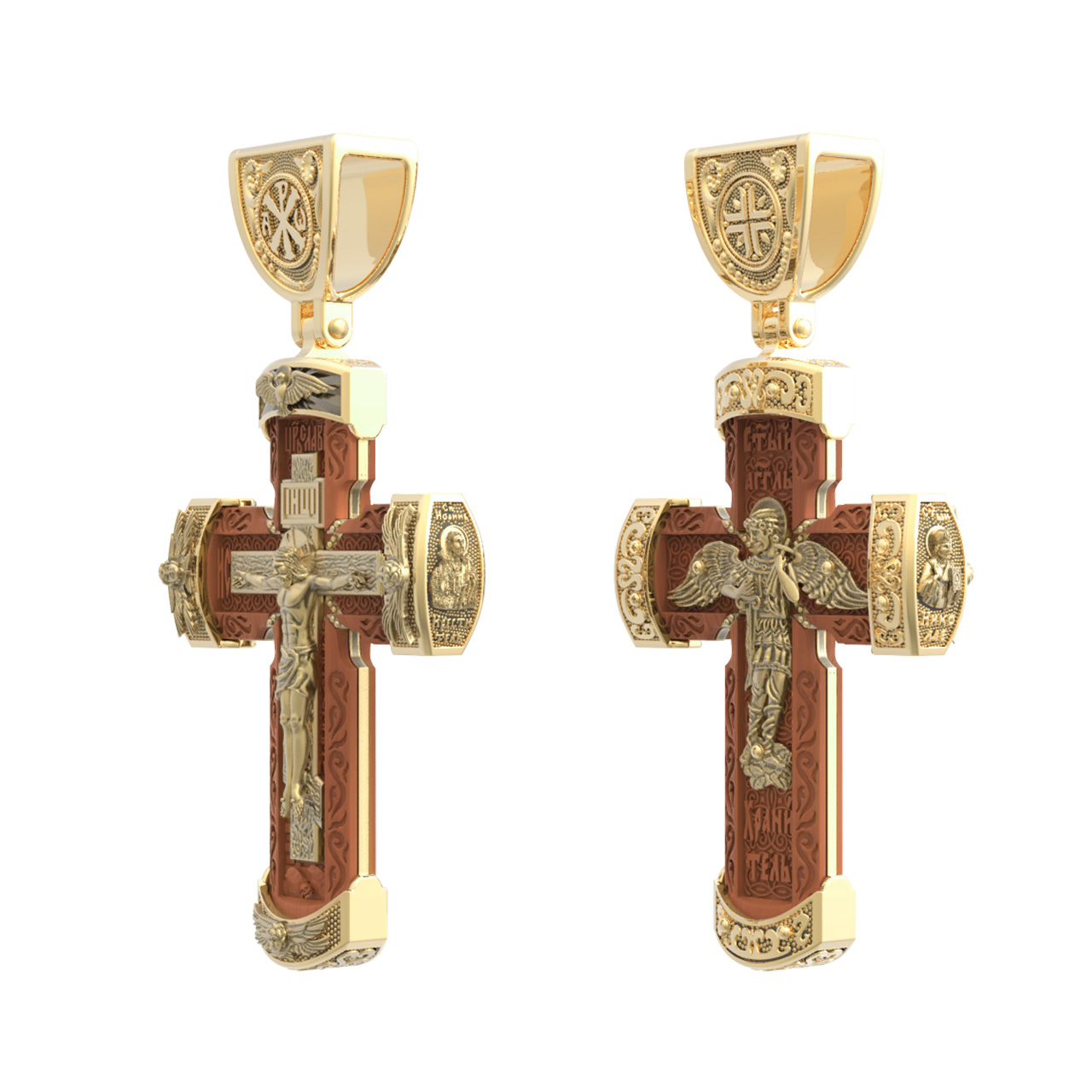 В центре оборота креста изображен Ангела Хранителя с традиционными атрибутами в руках: крестом, которым он осеняет человека, и мечом для прогнания бесов. По Православному учению, каждому, принявшему святое крещение, дается Господом Ангел Хранитель, который сопровождает человека всю его жизнь, помогая в добрых делах и охраняя от нападок злых духов. Святые отцы утверждают, что только верующий человек имеет рядом с собой Ангела Хранителя: «Тем, которые сподобились крещения и возносятся на высоту добродетелей, даны от Бога Ангелы, заботящиеся о них и содействующие им. В этом уверяет нас Господь, когда говорит, что есть Ангелы Хранители у всякого, кто верует в Него» (преп. Анастасий Синаит). Но Ангел Хранитель пребывает с христианином, если только мы не прогоним его греховными делами, поскольку «как дым разгоняет пчел, так и грех прогоняет от нас Ангела Хранителя» (свт. Василий Великий). Но и после завершения земного пути Ангел Хранитель не покидает христианина, а помогает душе преодолеть воздушные мытарства на пути в Царство Небесное.