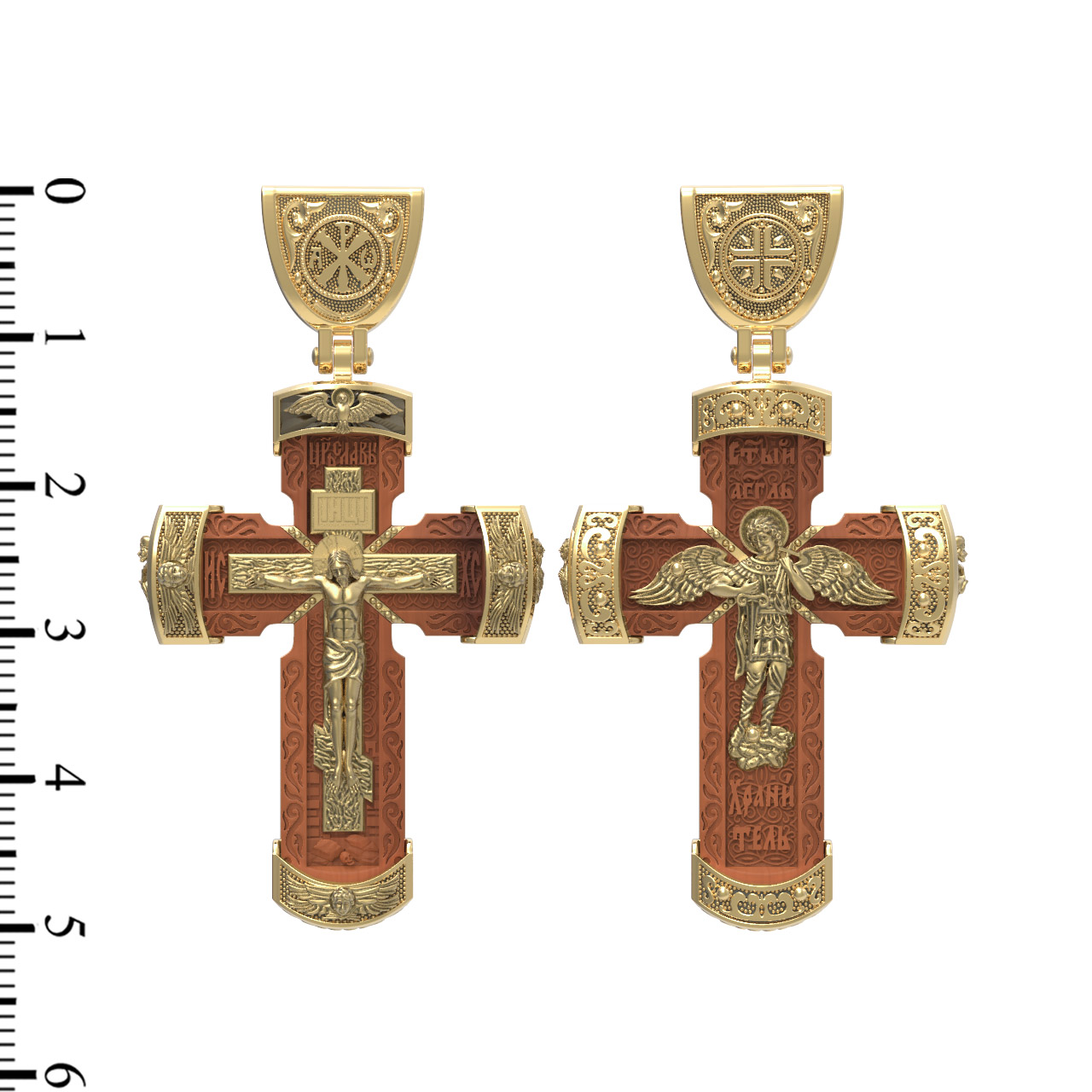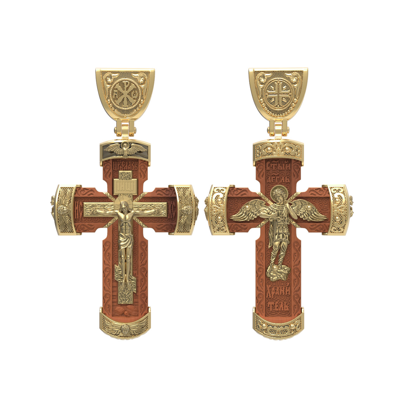 В центре оборота креста изображен Ангела Хранителя с традиционными атрибутами в руках: крестом, которым он осеняет человека, и мечом для прогнания бесов. По Православному учению, каждому, принявшему святое крещение, дается Господом Ангел Хранитель, который сопровождает человека всю его жизнь, помогая в добрых делах и охраняя от нападок злых духов. Святые отцы утверждают, что только верующий человек имеет рядом с собой Ангела Хранителя: «Тем, которые сподобились крещения и возносятся на высоту добродетелей, даны от Бога Ангелы, заботящиеся о них и содействующие им. В этом уверяет нас Господь, когда говорит, что есть Ангелы Хранители у всякого, кто верует в Него» (преп. Анастасий Синаит). Но Ангел Хранитель пребывает с христианином, если только мы не прогоним его греховными делами, поскольку «как дым разгоняет пчел, так и грех прогоняет от нас Ангела Хранителя» (свт. Василий Великий). Но и после завершения земного пути Ангел Хранитель не покидает христианина, а помогает душе преодолеть воздушные мытарства на пути в Царство Небесное.