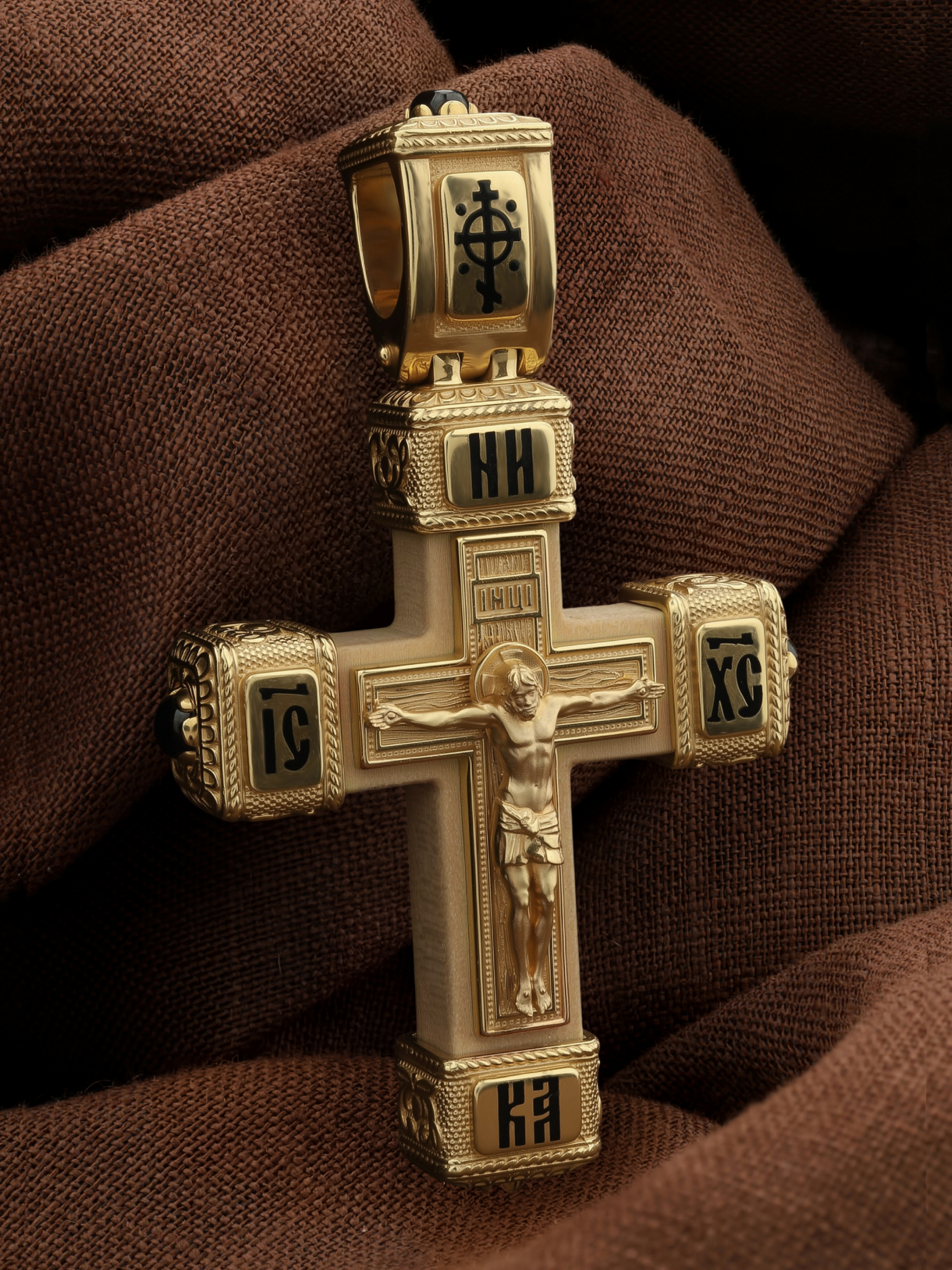 Крест из лимонного золота c эмалью, ониксом и деревом груши