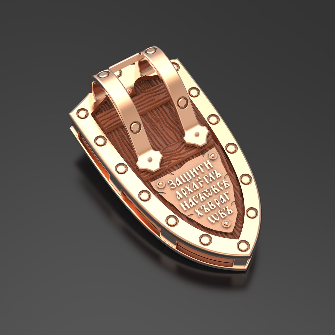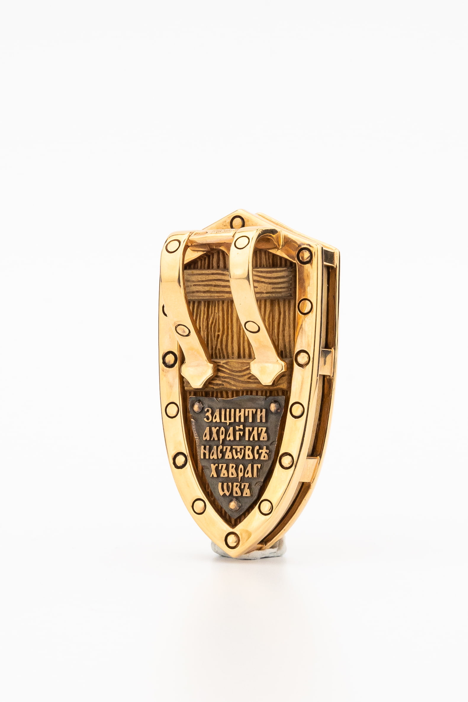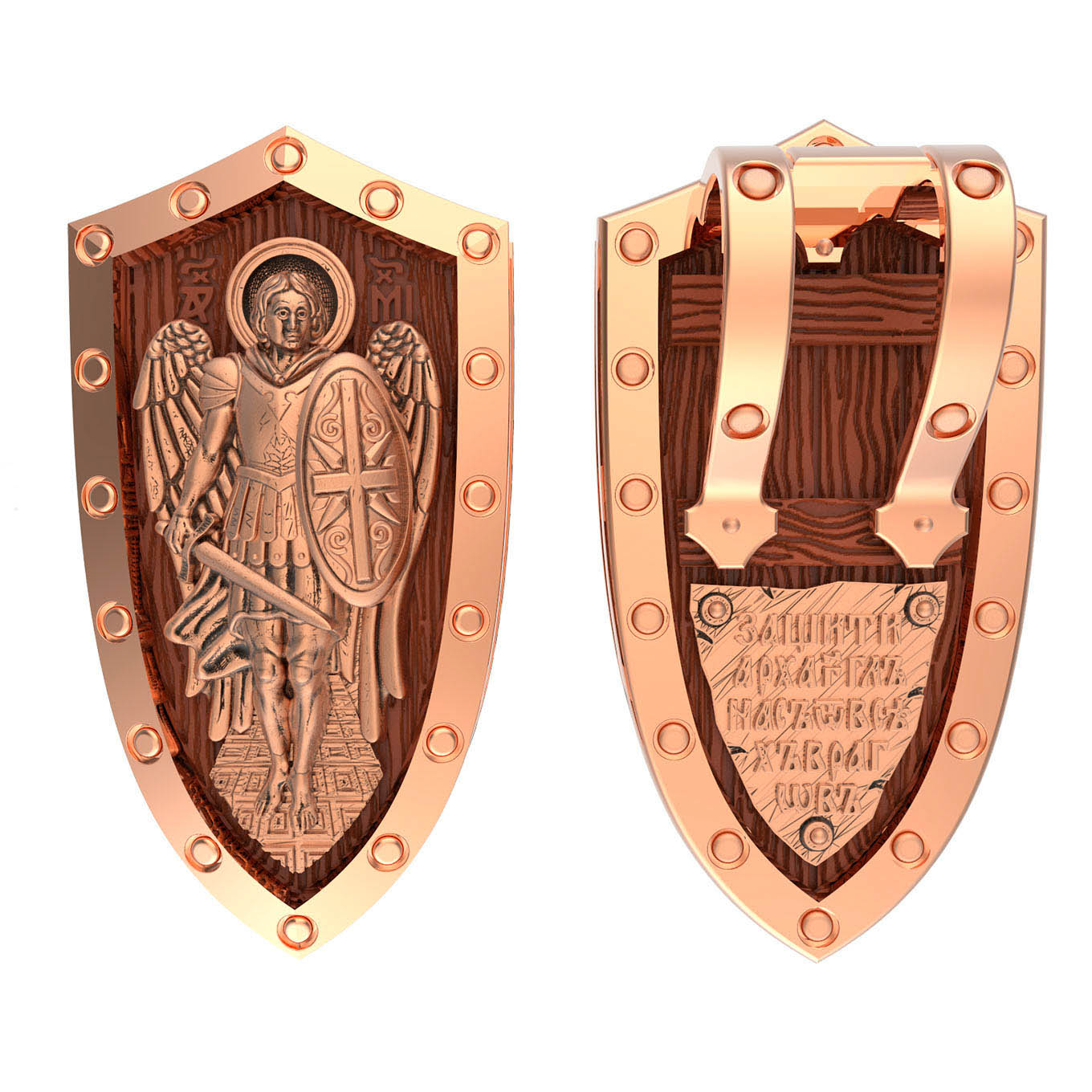 На лицевой стороне образка изображение Архангела Михаила — верного служителя Божия, который низринул с Неба возгордившегося денницу с другими павшими духами. В Православии его называют Архистратигом, что означает глава святого воинства Ангелов и Архангелов. Образок сделан в виде воинского щита. Архангел Михаил изображен в воинственном виде с огненным мечом в правой руке и щитом в левой. Архангел почитается как покровитель воинов и всех верных Богу и ведущих борьбу против сил зла, борец против ересей, а также защитник душ умерших, страж райских врат. С древних времен прославлен своими чудесами Архангел Михаил на Руси. Примеров явления и помощи Архистратига Михаила в русской истории бессчетно. Архангел Михаил не перестает ратоборствовать за славу Творца и Господа всяческих, за дело спасения рода человеческого, за церковь и чад ее. И, согласно, Откровению Иоанна Богослова во время последней битвы небесных и дьявольских сил Михаил и его ангелы опять низвергнут Люцифера вместе с его войском: «Михаил и Ангелы его воевали против дракона, и дракон и ангелы его воевали [против них], но не устояли, и не нашлось уже для них места на небе. И низвержен был великий дракон, древний змий, называемый диаволом и сатаною, обольщающий всю вселенную, низвержен на землю, и ангелы его низвержены с ним» (Откр.12:7−9).