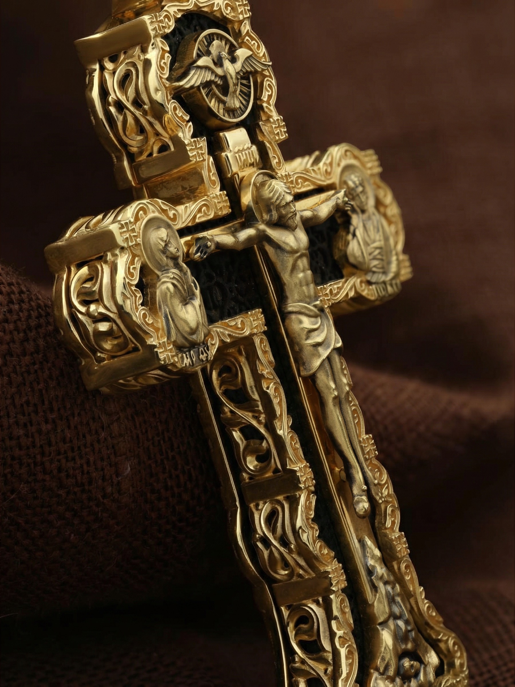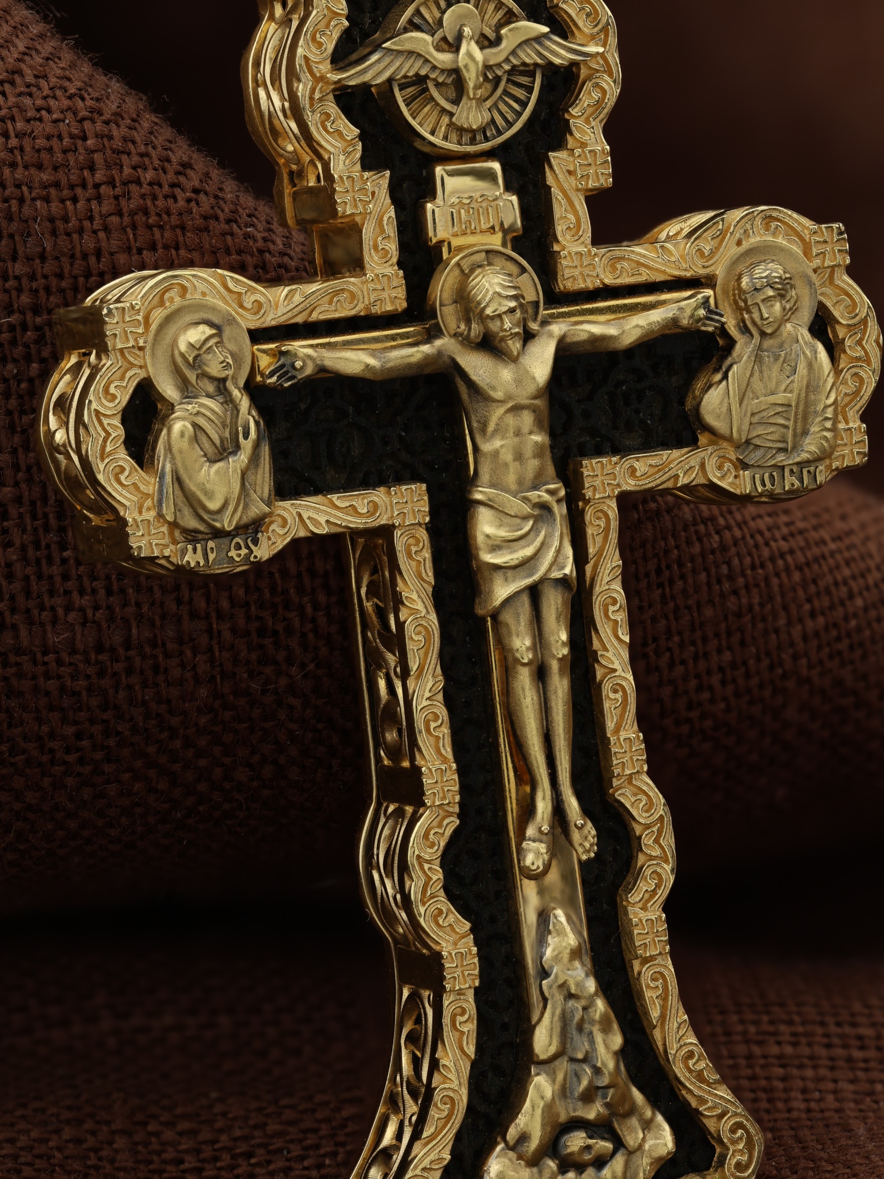 На лицевой стороне креста изображено Распятие Господа и Спасителя нашего Иисуса Христа. Христос, подвергнутый на кресте мучительной казни, своими страданиями искупил нас от древнего греха и даровал нам жизнь вечную. Без Распятия не было бы Воскресения Христова, и поэтому Крест из орудия казни обратился в святыню, в которой действует Благодать Божия. Через крестную жертву Бог раскрывает нам Свою безмерную любовь и призывает к ответной любви. На верхней табличке, выше головы Иисуса, расположена надпись, составленная Понтием Пилатом на трех языках — «IНЦI». Она означает «Иисус Назорей, Царь Иудейский». Надпись «IС ХС» означает Иисус Христос и помещается на разных сторонах поперечной (большой) перекладины креста. Крест стоит на горе камней, символизирующих Голгофу. В ее основании различается череп– это голова Адама. У Креста стоят оплакивающие Господа Божия Матерь и апостол Иоанн Богослов. Из всех апостолов об одном лишь Иоанне Богослове говорится, что он стоял на Голгофе у креста Спасителя, не заботясь о собственной безопасности. Он услышал обращенные к Ней с высоты Креста слова Распятого Господа: «Жено, се сын Твой» и к нему: «Се Мати твоя». С этого времени Иоанн взял Матерь Божию к себе, и Она жила в его доме до самой смерти. Над Распятием — изображение Духа Святого в виде голубя, сходящего с Небес. На кулонном кольце изображен Бог Отец.