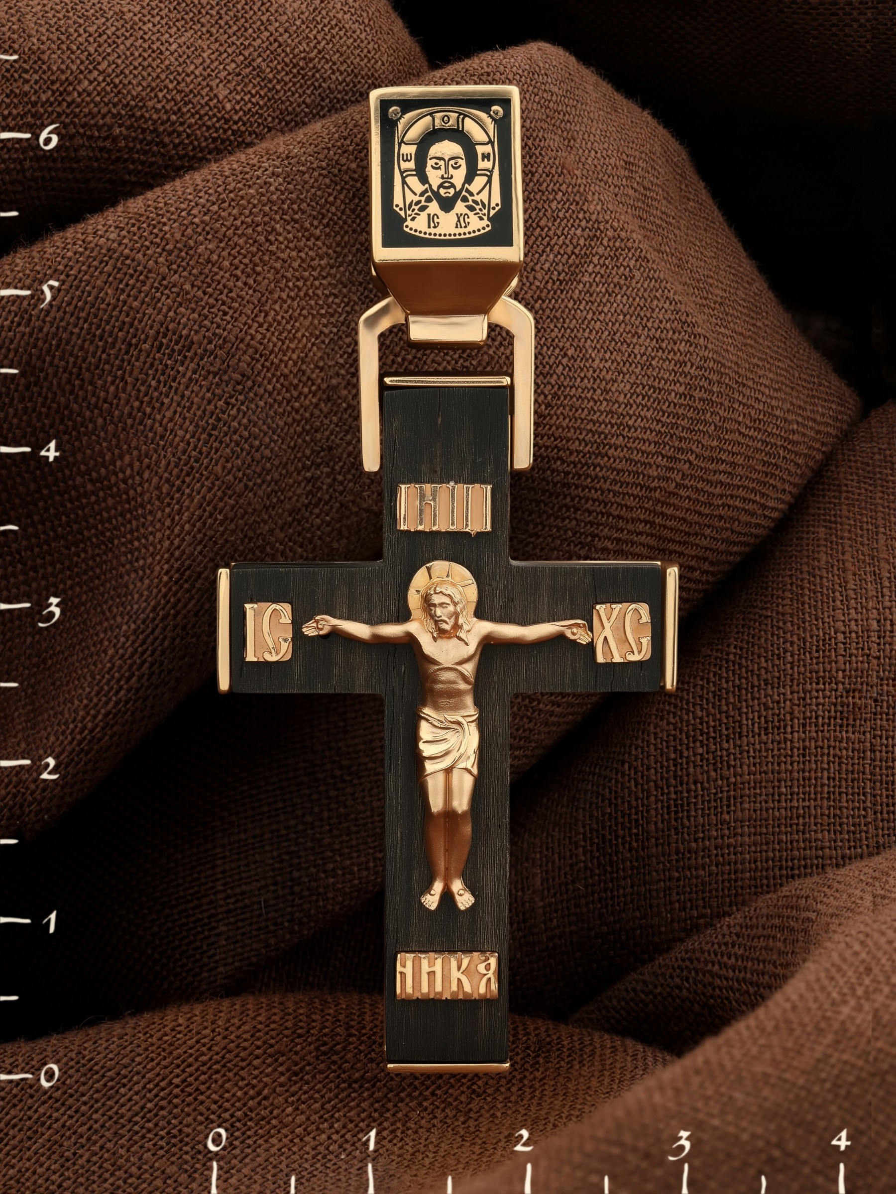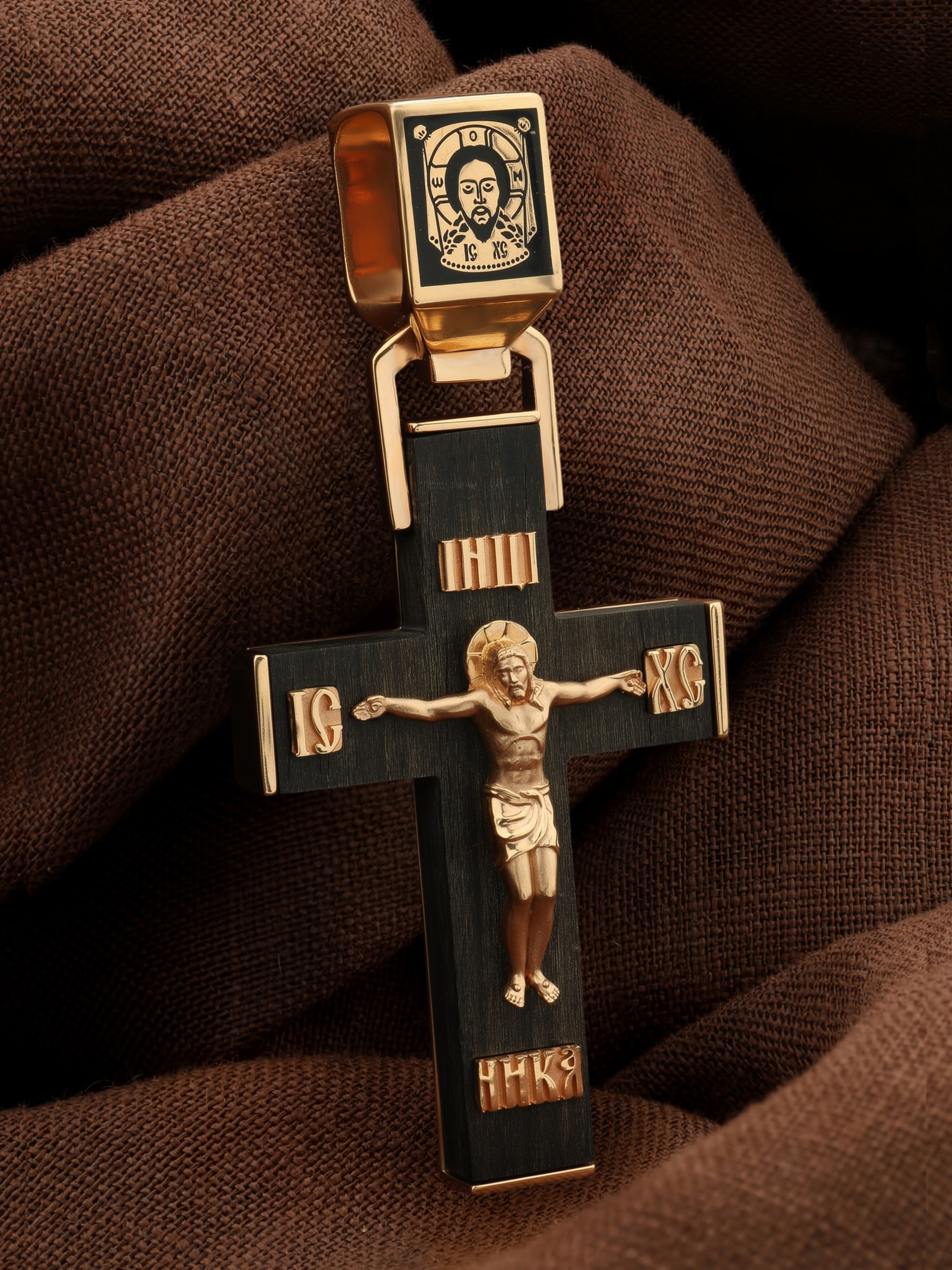 На лицевой стороне креста изображено Распятие Господа и Спасителя нашего Иисуса Христа. В Голгофе сокрыта непостижимая тайна бесконечной правды и любви Бога. Крест стал символом победы добра над злом, жизни над смертью, напоминанием бесконечной Божьей любви, предметом радости. Воплотившийся Сын Божий Своею кровью освятил крест и сделал его проводником Своей благодати, источником освящения верующих. На верхней табличке, выше головы Иисуса, расположена надпись, составленная Понтием Пилатом — «IНЦI». Она означает «Иисус Назорей, Царь Иудейский». Надпись «IС ХС» означает Иисус Христос размещается на разных сторонах поперечной перекладины креста. В нижней части креста находится надпись «НИКА», что в переводе с греческого означает «победитель». На православном кресте Христос не умирает, а свободно простирает руки, ладони Иисуса открыты, будто он хочет обнять все человечество, даря им свою любовь и открывая путь к вечной жизни. На кулонном кольце размещено изображение Спаса Нерукотворного — образ Спасителя, который Он запечатлел на плате и передал для исцеления больному проказой царю Эдессы. Ему придается победное и защитное значение.