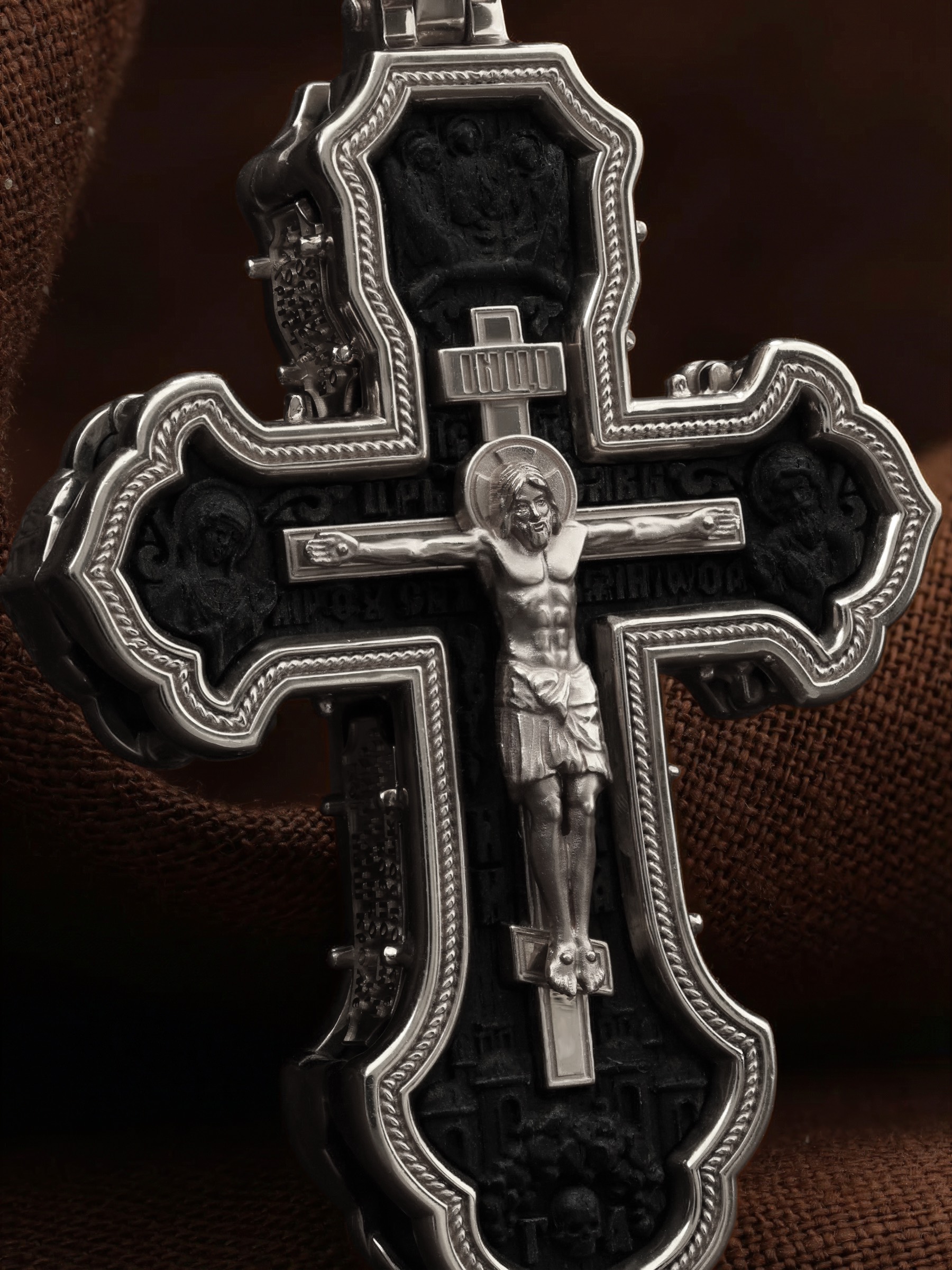 На лицевой стороне креста изображено Распятие Господа и Спасителя нашего Иисуса Христа, отдавшего Себя на смерть, чтобы другие могли жить — жить вечной жизнью, жить с Богом. Через крестную жертву Бог раскрывает нам Свою безмерную любовь и призывает к ответной любви. Своею кровью Господь освятил крест и сделал его проводником Своей благодати, источником освящения верующих. На верхней табличке, выше головы Иисуса, расположена надпись, составленная Понтием Пилатом — «IНЦI». Она означает «Иисус Назорей, Царь Иудейский». Распятие сопровождается каноническими надписями. Надпись «IС» « ХС» означает Иисус Христос и помещается над Распятием. Надпись «Царь Славы» помещается на разных сторонах поперечной (большой) перекладины креста. Ниже расположены надпись «Сын Божий» и слово «НИКА», что означает «победитель». Слева от Распятия изображена Пресвятая Богородица, Справа изображен Пророк Предтеча и Креститель Господень Иоанн. За Распятием высится Иерусалимская стена, в знак того, что Господь был распят вне стен города. Возвышение, на котором стоит Крест, символизирует гору Голгофу, на которой произошло Распятие. Под подножием Креста изображена покоящаяся голова (череп) Адама и надпись «Г.А.». Над распятием помещено изображение иконы Святой Троицы в виде трех ангелов. На кулонном кольце изображен Нерукотворный образ Господа и Спасителя нашего Иисуса Христа, чудесно отпечатавшийся на плате, котором Христос вытер свой лик.