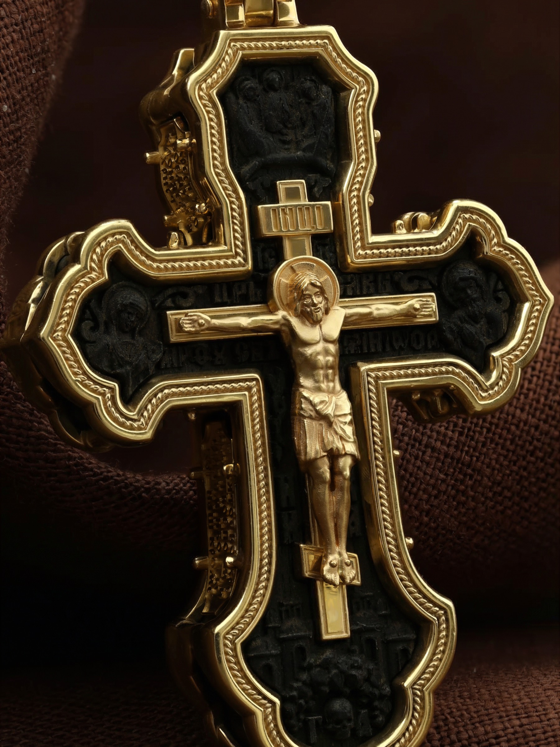На лицевой стороне креста изображено Распятие Господа и Спасителя нашего Иисуса Христа, отдавшего Себя на смерть, чтобы другие могли жить — жить вечной жизнью, жить с Богом. Через крестную жертву Бог раскрывает нам Свою безмерную любовь и призывает к ответной любви. Своею кровью Господь освятил крест и сделал его проводником Своей благодати, источником освящения верующих. На верхней табличке, выше головы Иисуса, расположена надпись, составленная Понтием Пилатом — «IНЦI». Она означает «Иисус Назорей, Царь Иудейский». Распятие сопровождается каноническими надписями. Надпись «IС» « ХС» означает Иисус Христос и помещается над Распятием. Надпись «Царь Славы» помещается на разных сторонах поперечной (большой) перекладины креста. Ниже расположены надпись «Сын Божий» и слово «НИКА», что означает «победитель». Слева от Распятия изображена Пресвятая Богородица, Справа изображен Пророк Предтеча и Креститель Господень Иоанн. За Распятием высится Иерусалимская стена, в знак того, что Господь был распят вне стен города. Возвышение, на котором стоит Крест, символизирует гору Голгофу, на которой произошло Распятие. Под подножием Креста изображена покоящаяся голова (череп) Адама и надпись «Г.А.». Над распятием помещено изображение иконы Святой Троицы в виде трех ангелов. На кулонном кольце изображен Нерукотворный образ Господа и Спасителя нашего Иисуса Христа, чудесно отпечатавшийся на плате, котором Христос вытер свой лик.