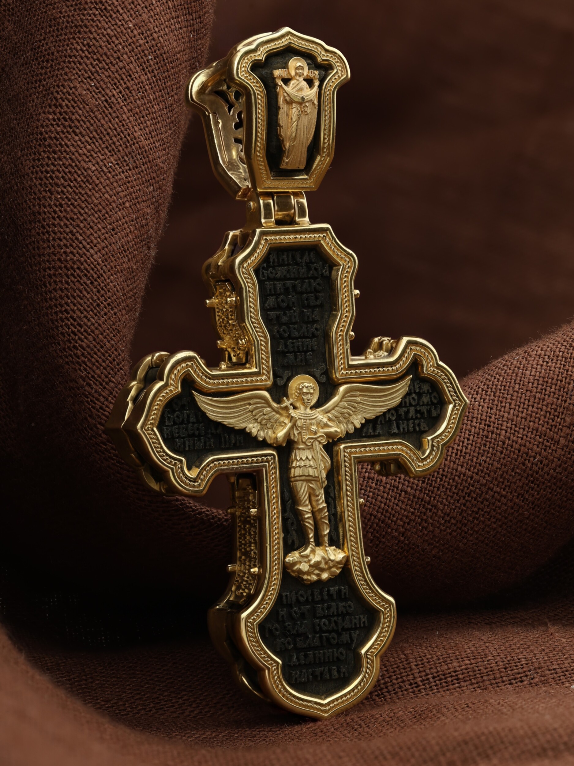 В центре оборотной стороне креста изображен Святой Агнгел-Хранитель в виде юноши держащего в правой руке крест, а в левой — мечь. Агнгел-Хранитель — это Ангел приставляемый Богом к человеку при крещении для охраны и помощи в добрых делах. Он невидимо находится при человеке на протяжении всей его жизни, если человек сохраняет в себе любовь к Богу и истинную веру перед Ним. По сторонам от изображения помещена молитва: «Ангеле Божий, хранителю мой святый, на соблюдение мне от Бога с небесе данный! Прилежно молю тя: ты мя днесь просвети, и от всякаго зла сохрани, ко благому деянию настави…». На кулонном кольце изображена икона Божией Матери «Покров Пресвятой Богородицы».