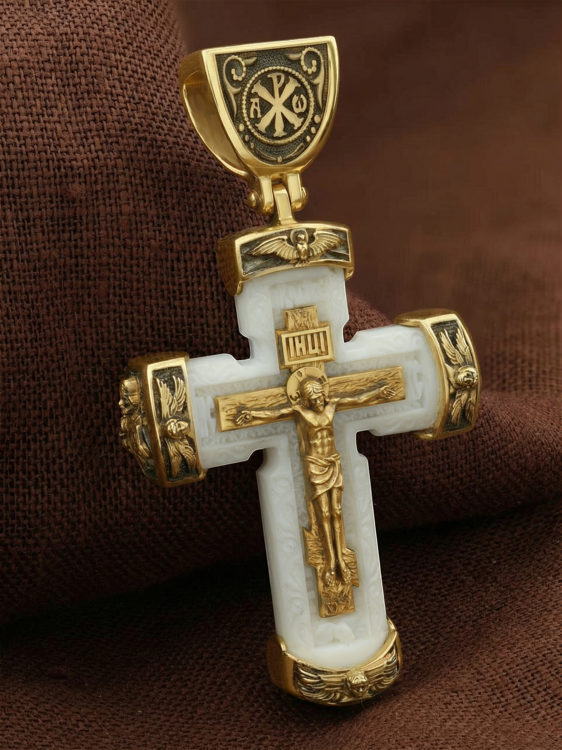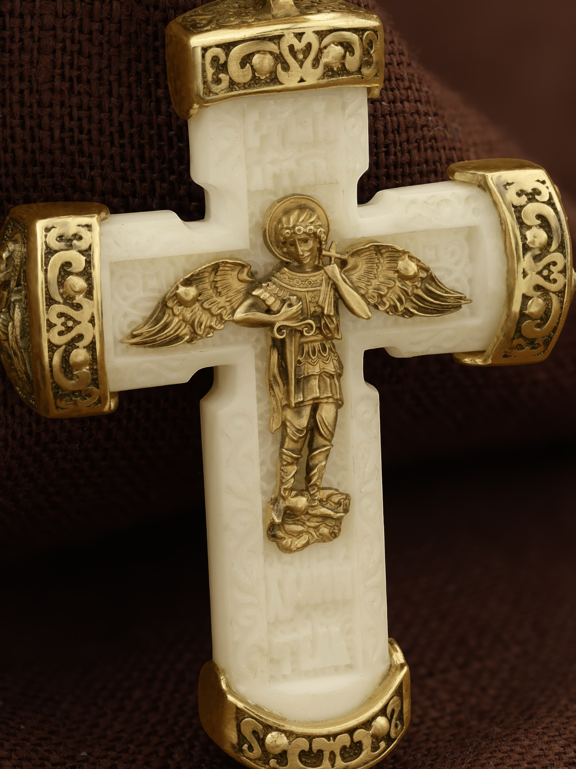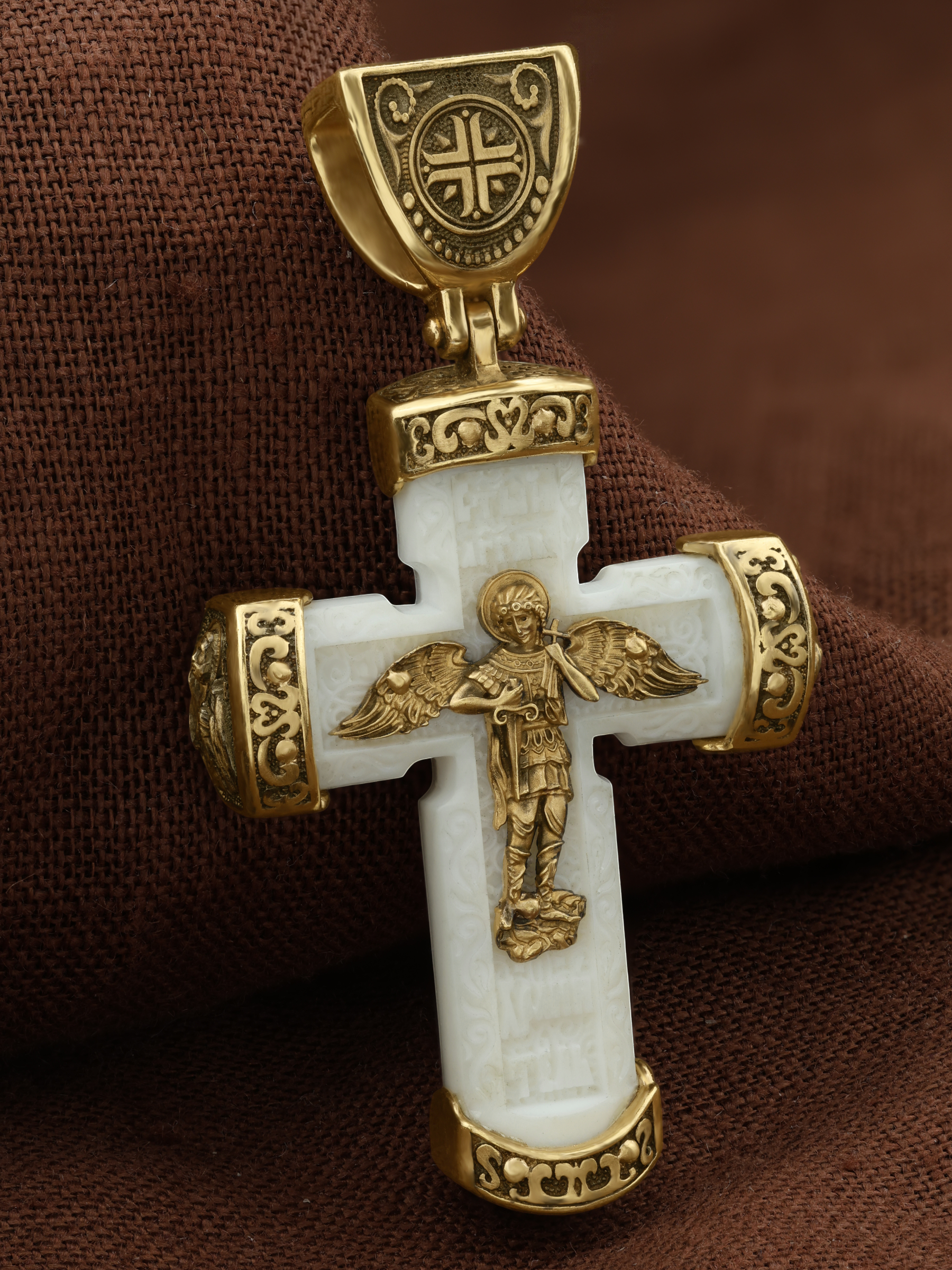 В центре оборота креста изображен Ангела Хранителя с традиционными атрибутами в руках: крестом, которым он осеняет человека, и мечом для прогнания бесов. По Православному учению, каждому, принявшему святое крещение, дается Господом Ангел Хранитель, который сопровождает человека всю его жизнь, помогая в добрых делах и охраняя от нападок злых духов. Святые отцы утверждают, что только верующий человек имеет рядом с собой Ангела Хранителя: «Тем, которые сподобились крещения и возносятся на высоту добродетелей, даны от Бога Ангелы, заботящиеся о них и содействующие им. В этом уверяет нас Господь, когда говорит, что есть Ангелы Хранители у всякого, кто верует в Него» (преп. Анастасий Синаит). Но Ангел Хранитель пребывает с христианином, если только мы не прогоним его греховными делами, поскольку «как дым разгоняет пчел, так и грех прогоняет от нас Ангела Хранителя» (свт. Василий Великий). Но и после завершения земного пути Ангел Хранитель не покидает христианина, а помогает душе преодолеть воздушные мытарства на пути в Царство Небесное.