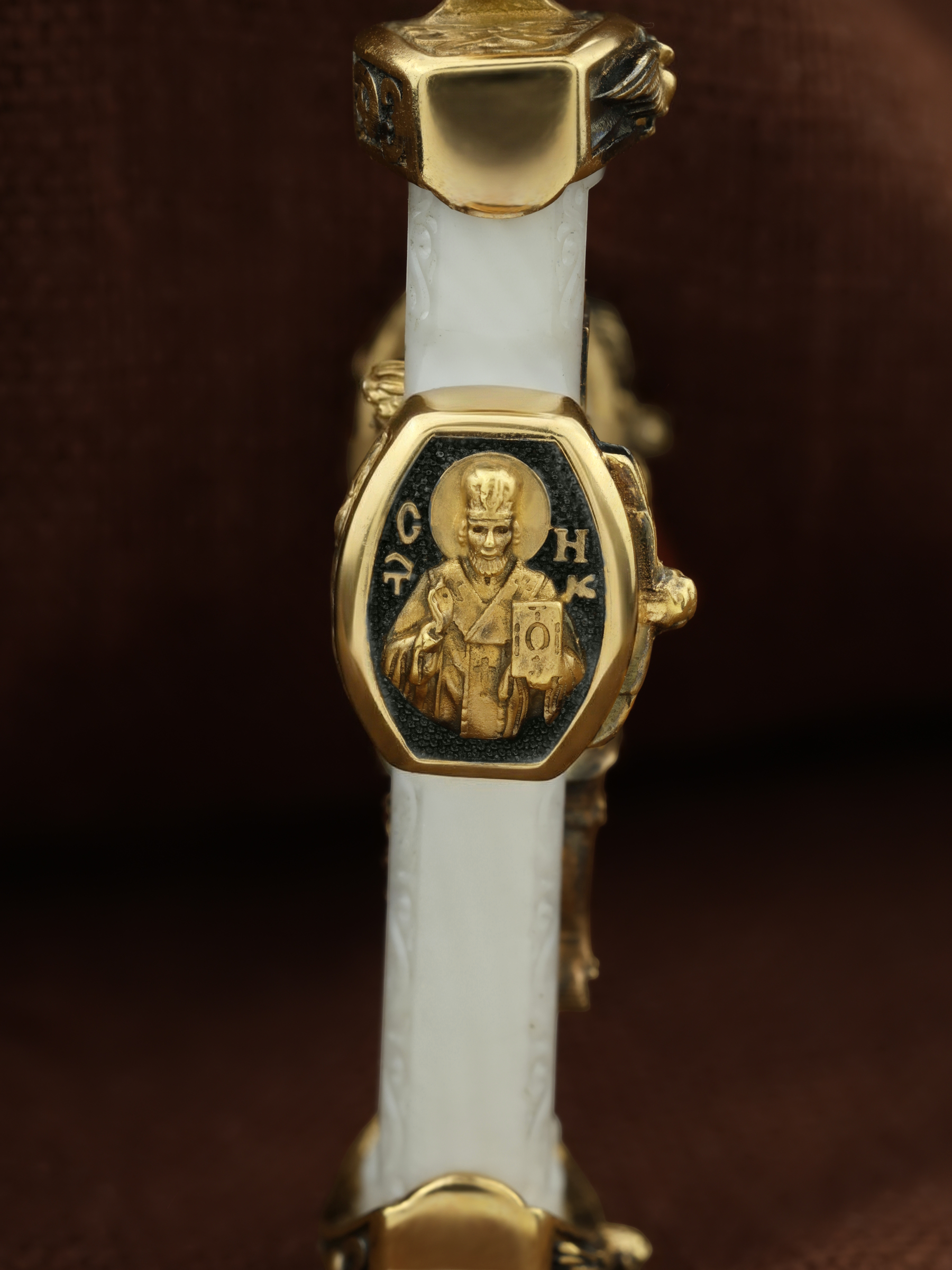 На торце изделия с левой стороны помещена икона Святого Николая Чудотворца — самый почитаемый в Православной Церкви, которого еще называют Николай Угодник за то, что он угодил своей жизнью Богу. Николай Чудотворец, помощник в делах, покровитель учащихся, утешитель обиженных и нуждающихся, целитель самых страшных и тяжелых недугов, предстатель и молитвенник за людей перед Богом. Также Святитель Николай Чудотворец известен своими молитвами за путешественников, когда непрестанный ветер и бушующие волны утихают и корабль заходит в спокойную гавань. На торце изделия с правой стороны — икона Святого Иоанна Крестителя. Святой Иоанн был последним пророком Израиля. Он призывал к покаянию, предвозвещая приближение Царствия Небесного (Мф. 3, 2), и удостоился стать Крестителем Христа. Иисус Христос говорит о нем: «Сей есть о котором написано: «Вот, Я посылаю Ангела Моего пред лицем Твоим, который приготовит путь Твой пред Тобою» (Лк. 7, 27). И еще: «Из рожденных женами нет ни одного пророка больше Иоанна Крестителя» (Лк. 7, 28).
