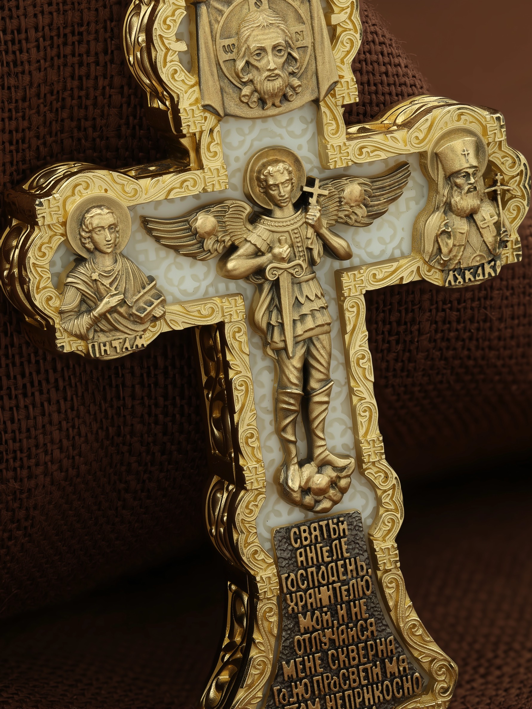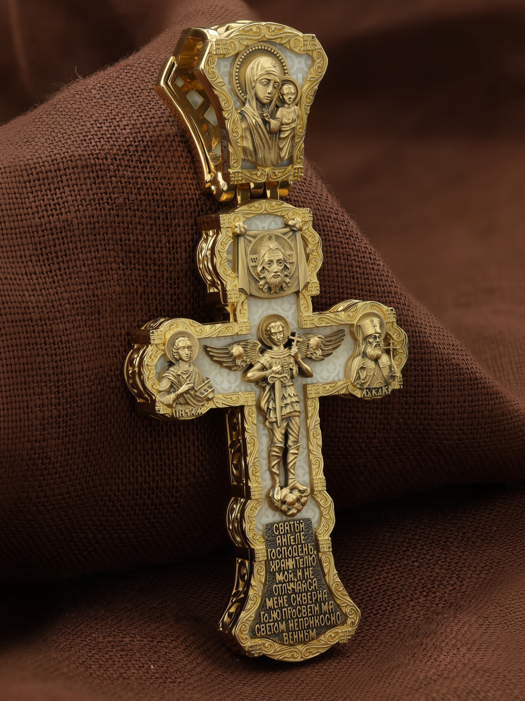 На центральной части оборотной стороны креста изображен Святой Ангел-Хранитель в виде прекрасного юноши держащего в правой руке крест, а в левой — мечь. Ангел-Хранитель — это Ангел приставляемый Богом к человеку при крещении для охраны и помощи в добрых делах. Невидимо пребывая при нас постоянно, он, руководствуя нас ко спасению, не только по нашему желанию таинственно наставляет нас на все доброе и полезное, не только возносит наши молитвы к Богу, но еще и сам от себя охраняют и защищают нас от врагов видимых и невидимых и ходатайствует за нас пред Богом. Ниже образа написана молитва: «Святый Ангеле Господень, Хранитель мой, не отлучайся мене скверного, но просвети мя светом неприкосновенным.» Выше образа изображен Спас Нерукотворный — образ Господа и Спасителя нашего Иисуса Христа, чудесно отпечатавшийся на плате, котором Христос вытер свой лик. Слева — Свя¬той ве¬ли¬ко¬му¬че¬ник и це¬ли¬тель Пан¬те-ле¬и¬мон. Господь даровал удивительную силу его молитве. Ею он исцелял любые болезни, воскрешал мертвых. Справа — Святитель Лука (Войно-Ясенецкий). На кулонном кольце изображена Казанская икона Божией Матери — одна из самых любимых на Руси.