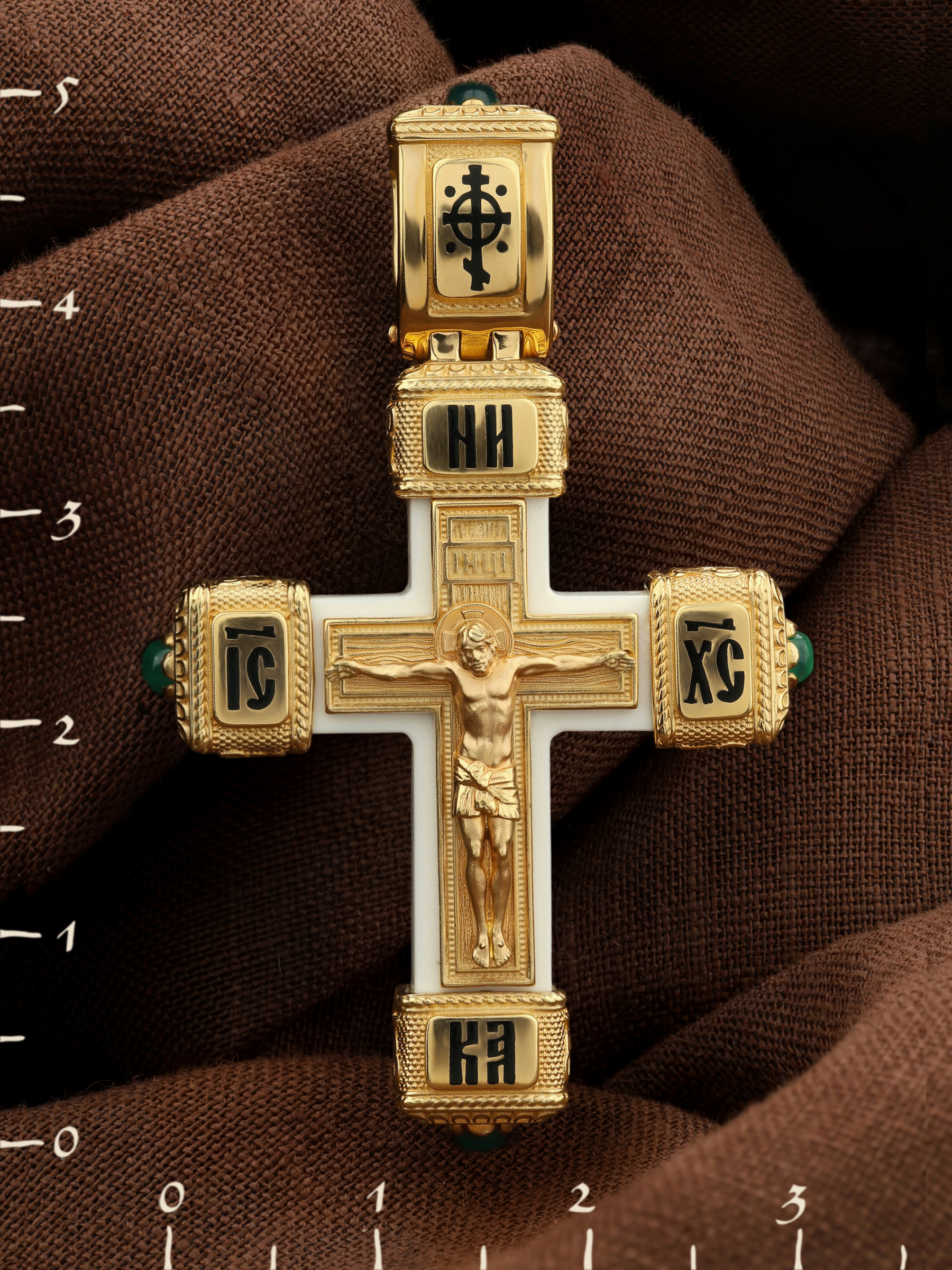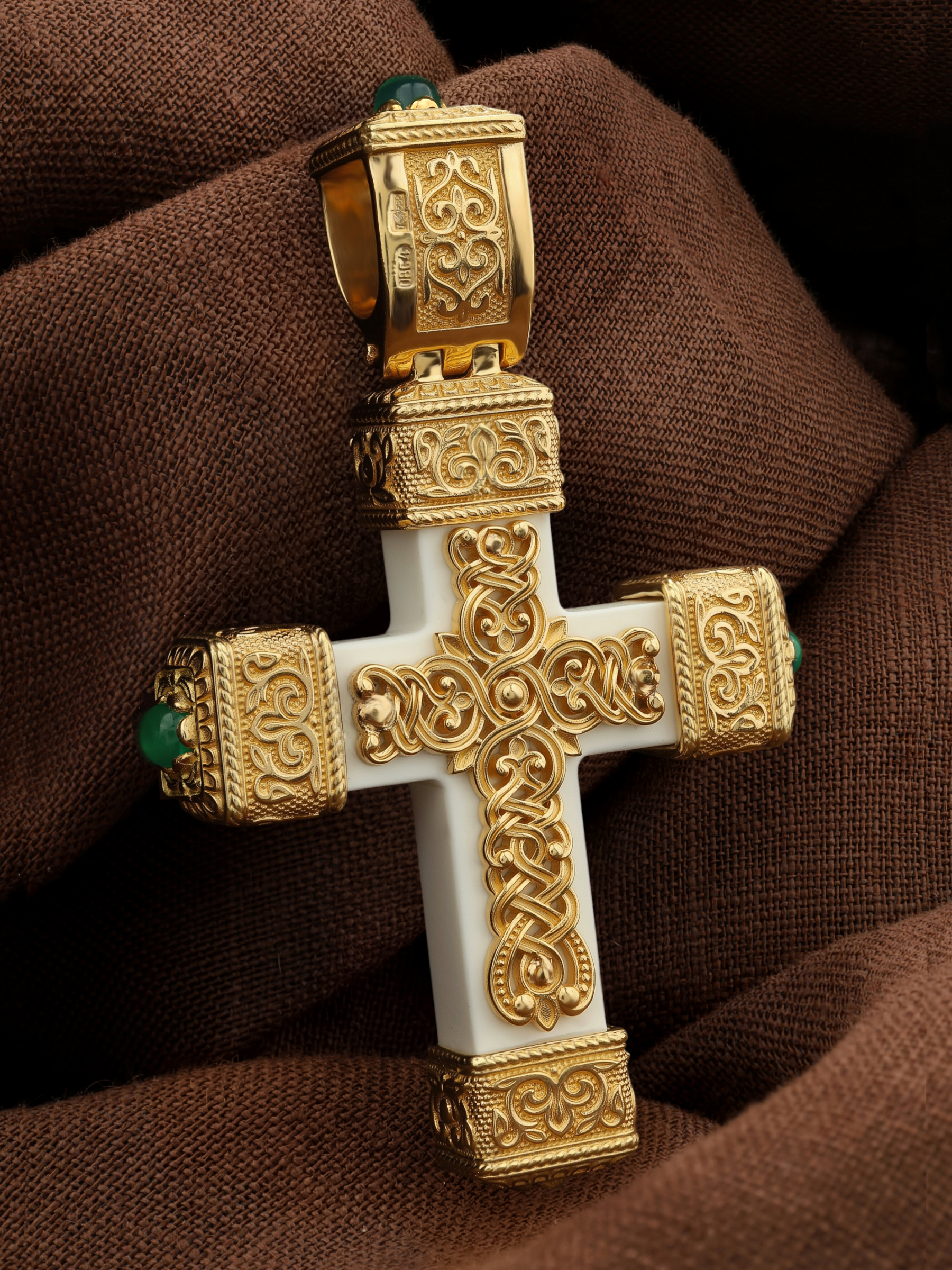 Крест из лимонного золота c эмалью, хризопразом и бивнем мамонта