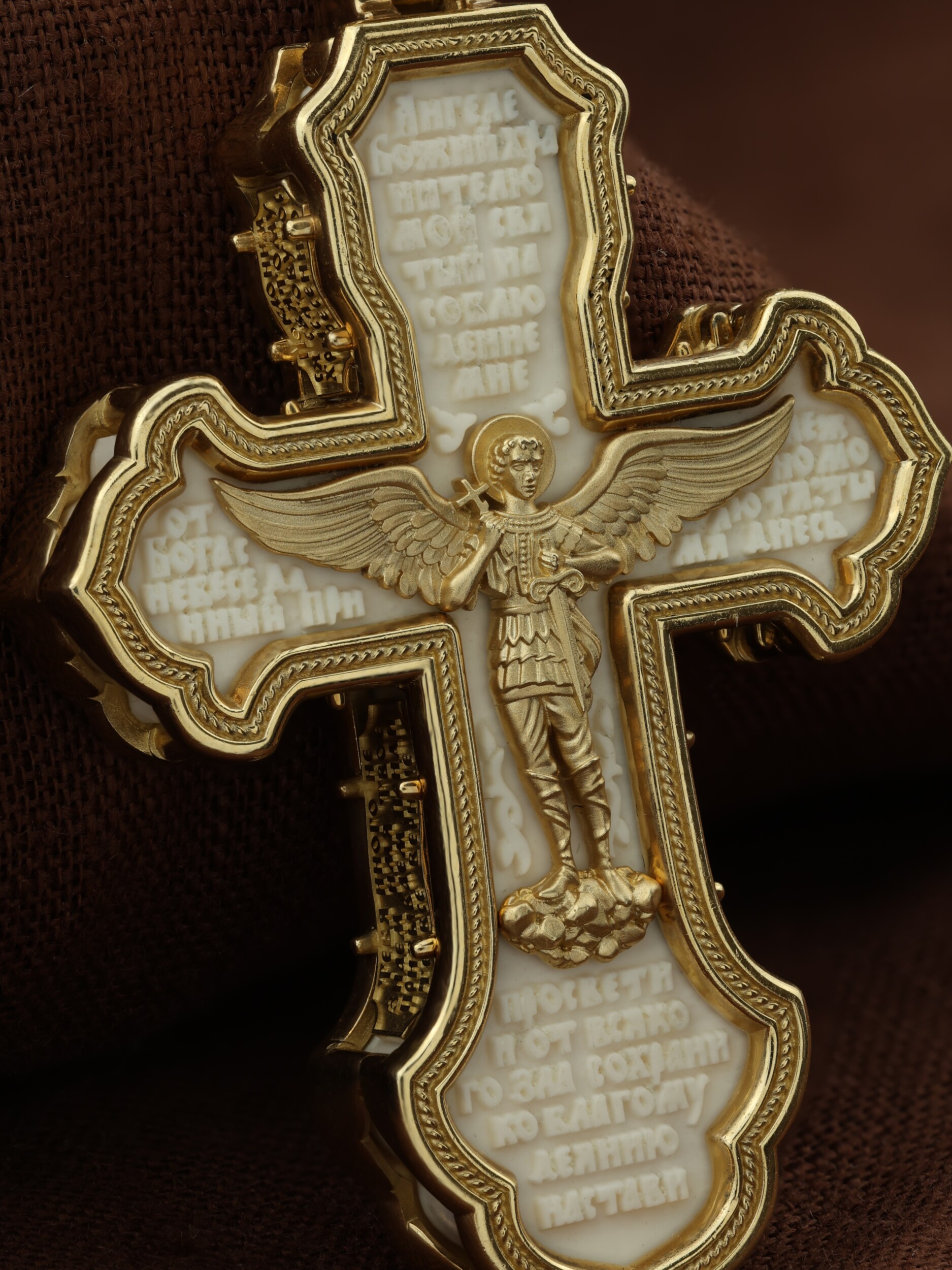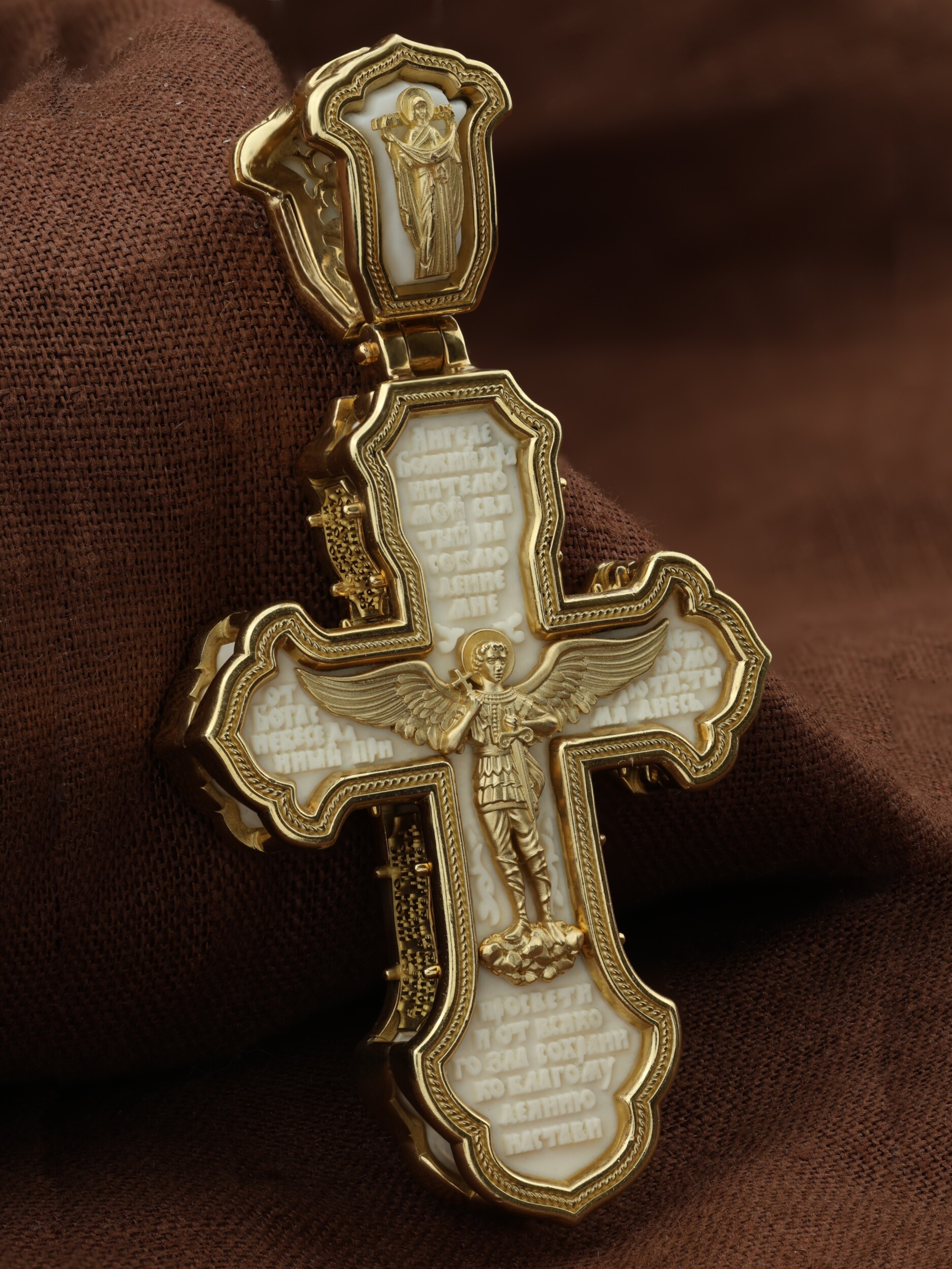 В центре оборотной стороне креста изображен Святой Агнгел-Хранитель в виде юноши держащего в правой руке крест, а в левой — мечь. Агнгел-Хранитель — это Ангел приставляемый Богом к человеку при крещении для охраны и помощи в добрых делах. Он невидимо находится при человеке на протяжении всей его жизни, если человек сохраняет в себе любовь к Богу и истинную веру перед Ним. По сторонам от изображения помещена молитва: «Ангеле Божий, хранителю мой святый, на соблюдение мне от Бога с небесе данный! Прилежно молю тя: ты мя днесь просвети, и от всякаго зла сохрани, ко благому деянию настави…». На кулонном кольце изображена икона Божией Матери «Покров Пресвятой Богородицы».