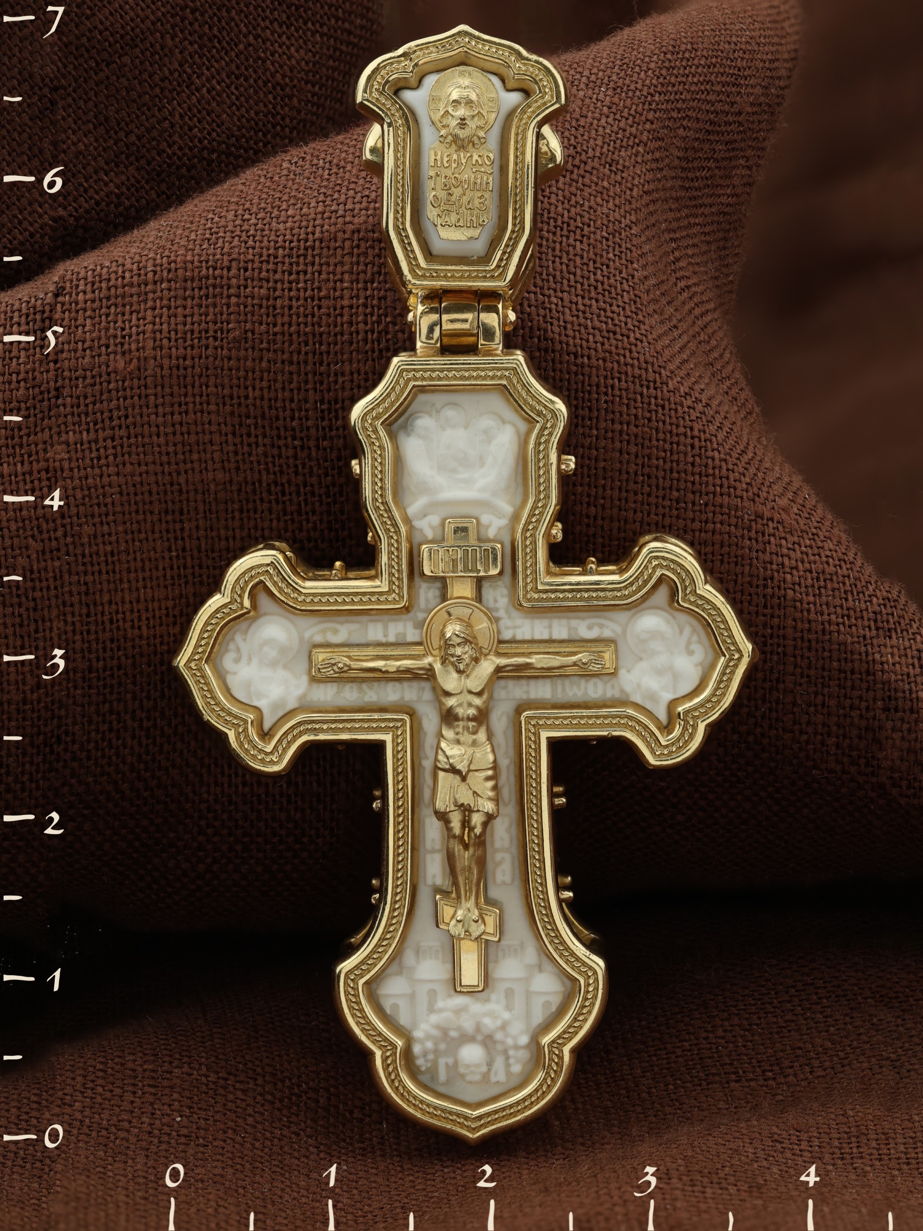 На лицевой стороне креста изображено Распятие Господа и Спасителя нашего Иисуса Христа, отдавшего Себя на смерть, чтобы другие могли жить — жить вечной жизнью, жить с Богом. Через крестную жертву Бог раскрывает нам Свою безмерную любовь и призывает к ответной любви. Своею кровью Господь освятил крест и сделал его проводником Своей благодати, источником освящения верующих. На верхней табличке, выше головы Иисуса, расположена надпись, составленная Понтием Пилатом — «IНЦI». Она означает «Иисус Назорей, Царь Иудейский». Распятие сопровождается каноническими надписями. Надпись «IС» « ХС» означает Иисус Христос и помещается над Распятием. Надпись «Царь Славы» помещается на разных сторонах поперечной (большой) перекладины креста. Ниже расположены надпись «Сын Божий» и слово «НИКА», что означает «победитель». Слева от Распятия изображена Пресвятая Богородица, Справа изображен Пророк Предтеча и Креститель Господень Иоанн. За Распятием высится Иерусалимская стена, в знак того, что Господь был распят вне стен города. Возвышение, на котором стоит Крест, символизирует гору Голгофу, на которой произошло Распятие. Под подножием Креста изображена покоящаяся голова (череп) Адама и надпись «Г.А.». Над распятием помещено изображение иконы Святой Троицы в виде трех ангелов. На кулонном кольце изображен Нерукотворный образ Господа и Спасителя нашего Иисуса Христа, чудесно отпечатавшийся на плате, котором Христос вытер свой лик.