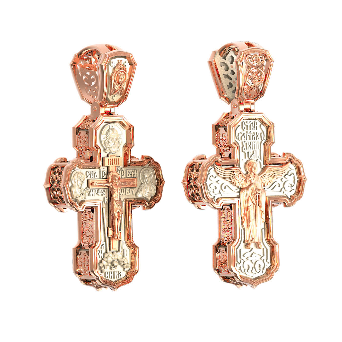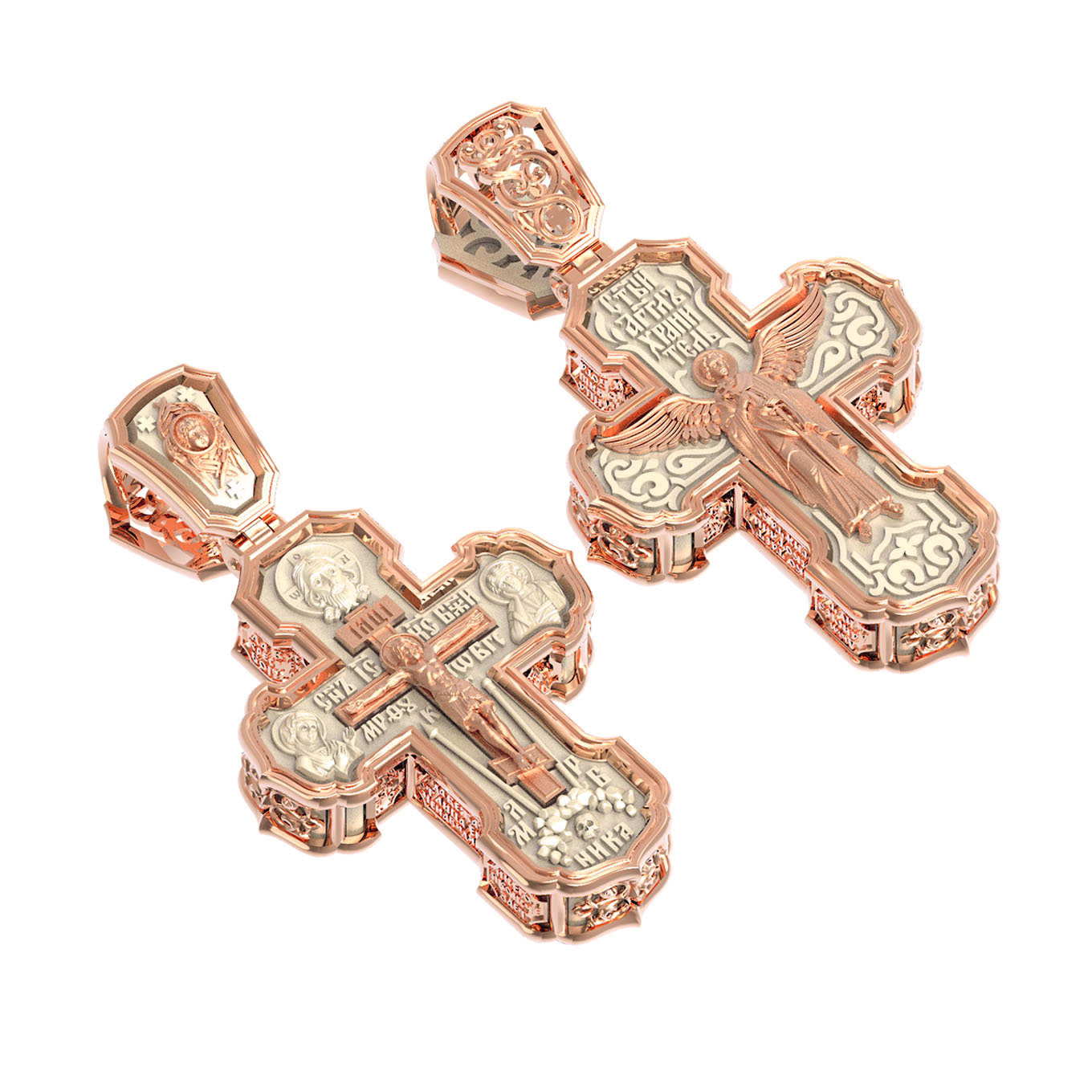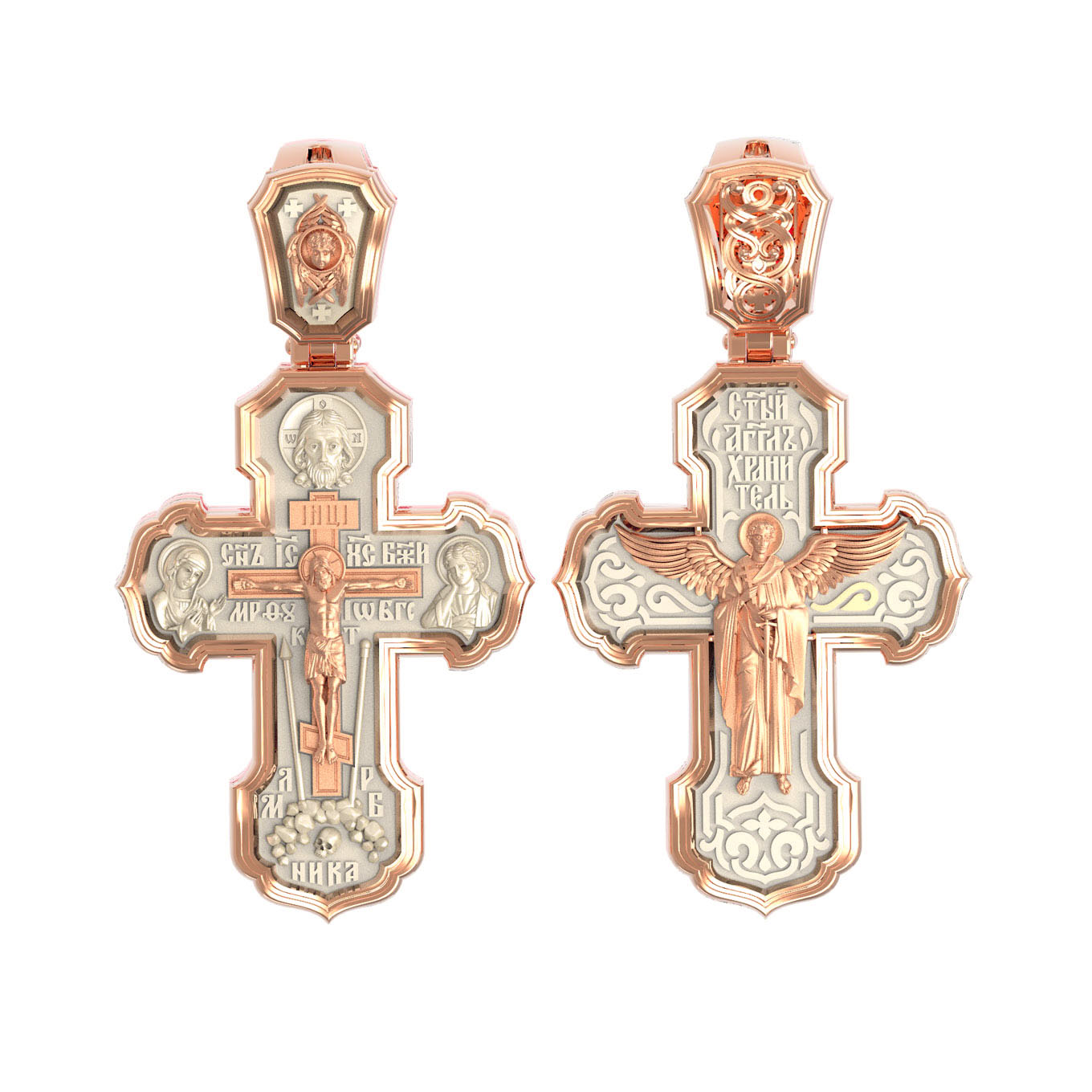 На лицевой стороне креста изображено Распятие Господа и Спасителя нашего Иисуса Христа. Крест- символ спасения и искупления рода человеческого, знамение победы над смертью и адом. Иисус Христос, как искупительная жертва освобождения человечества от власти греха, умер крестной смертью и в третий день воскрес. На верхней табличке, выше головы Иисуса, расположена надпись, составленная Понтием Пилатом — «IНЦI». Она означает «Иисус Назорей, Царь Иудейский». Надпись «IС» « ХС» означает Иисус Христос и помещается на разных сторонах поперечной (большой) перекладины креста. Рядом расположена надпись «Сын Божий». Выше Распятия изображен Нерукотворный образ Господа и Спасителя нашего Иисуса Христа. Слева от Распятия изображена Пресвятая Богородица, справа — апостол и евангелист Иоанн Богослов, один из ближайших учеников Иисуса Христа. Крест стоит на горе камней, символизирующих Голгофу. В ее основании различается череп — это голова Адама. Вдоль креста изображены копие сотника Лонгина и трость с губкой и буквы «К» и «Т». Надпись «МЛРБ» — «место лобное рай бысть» означает, что место лобное стало раем и помещаются в нижней части креста. Рядом — слово «НИКА», что означает «победитель». На православном кресте Христос не умирает, а свободно простирает руки, ладони Иисуса открыты, будто он хочет обнять все человечество, даря им свою любовь и открывая путь к вечной жизни. На кулонном кольце изображен шестикрылый Серафим.