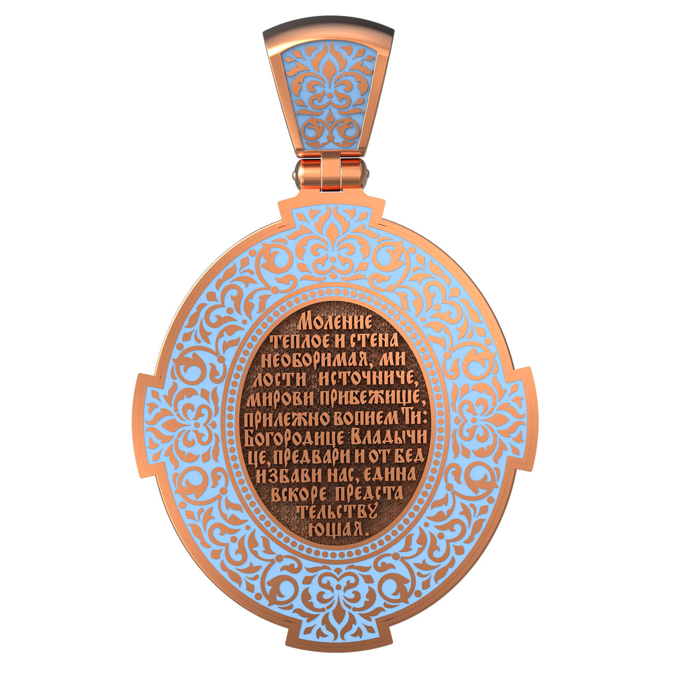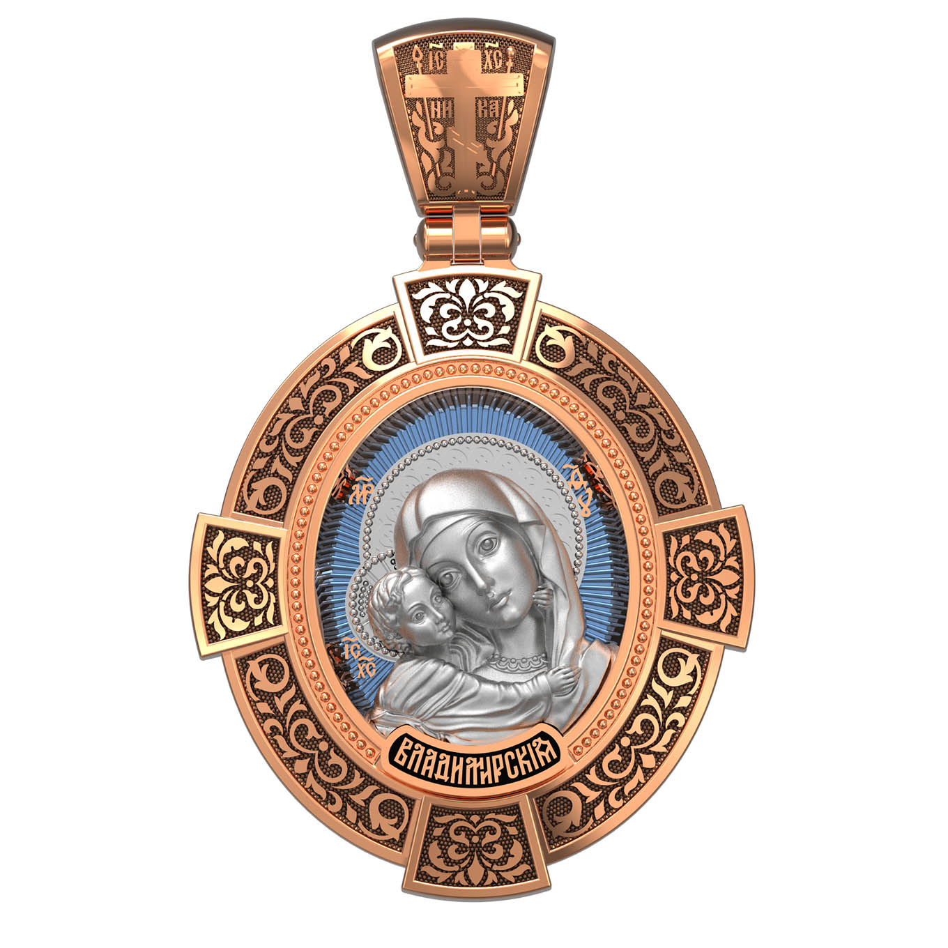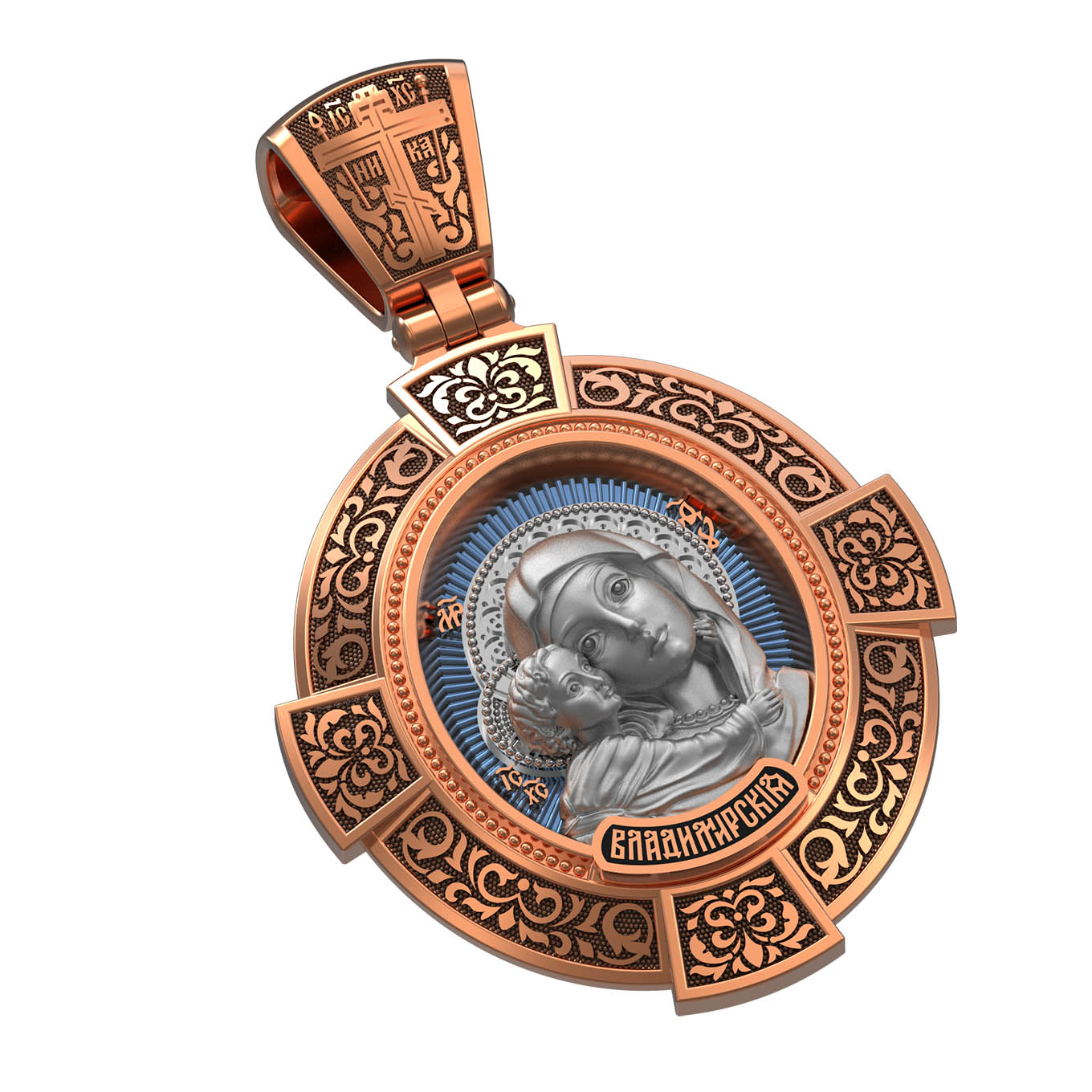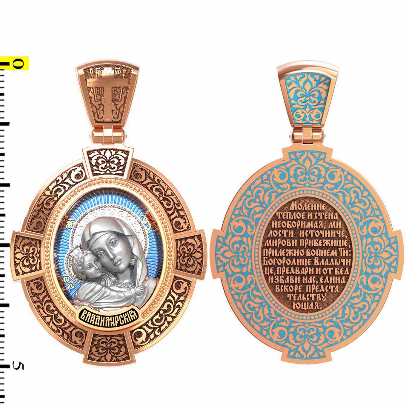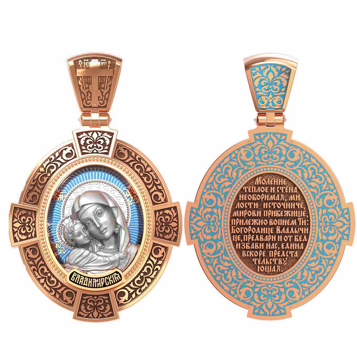 На лицевой стороне образка изображена Владимирская икона Божией Матери — одна из самых чтимых святынь Русской православной церкви. По преданию, икона была написана Святым апостолом и евангелистом Лукой во время земной жизни Богородицы. Дева Мария, увидев Свое изображение, молвила: «Отныне ублажат Мя вси роди. Благодать Рождшегося от Меня и Моя с сим образом да будет». Образ написан в лирическом иконографическом типе «Умиление». Младенец припал щекой к щеке Матери и тянется к ней правой рукой, другой нежно обнимая за шею. Икона вплоть до V века находилась в Иерусалиме, затем была перевезена в Византию. На Русь икона была привезена в 1131 г. За прошедшие столетия святыня неоднократно переезжала из Владимира в Москву и обратно, не раз спасая страну от захватчиков. Русская Православная Церковь установила троекратное празднование Владимирской иконе Божьей Матери. Каждый из дней празднования связан с избавлением русского народа от порабощения иноплеменниками по молитвам ко Пресвятой Богородице. В последующие века у иконы происходили многие важные исторические события: подписание актов, принятие присяги значимых государственных деятелей и возведение на престол. На кулонном кольце изображен Спас Нерукотворный — образ Господа и Спасителя нашего Иисуса Христа, чудесно отпечатавшийся на плате, котором Христос вытер свой лик.