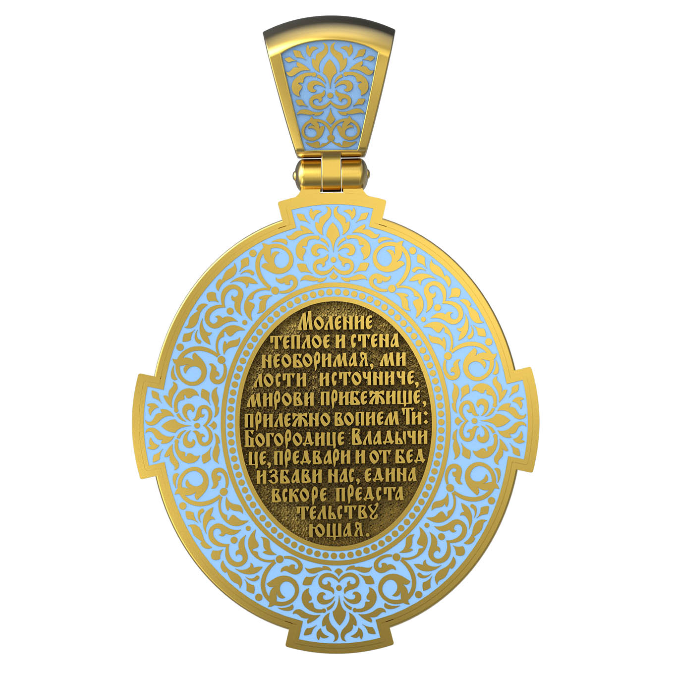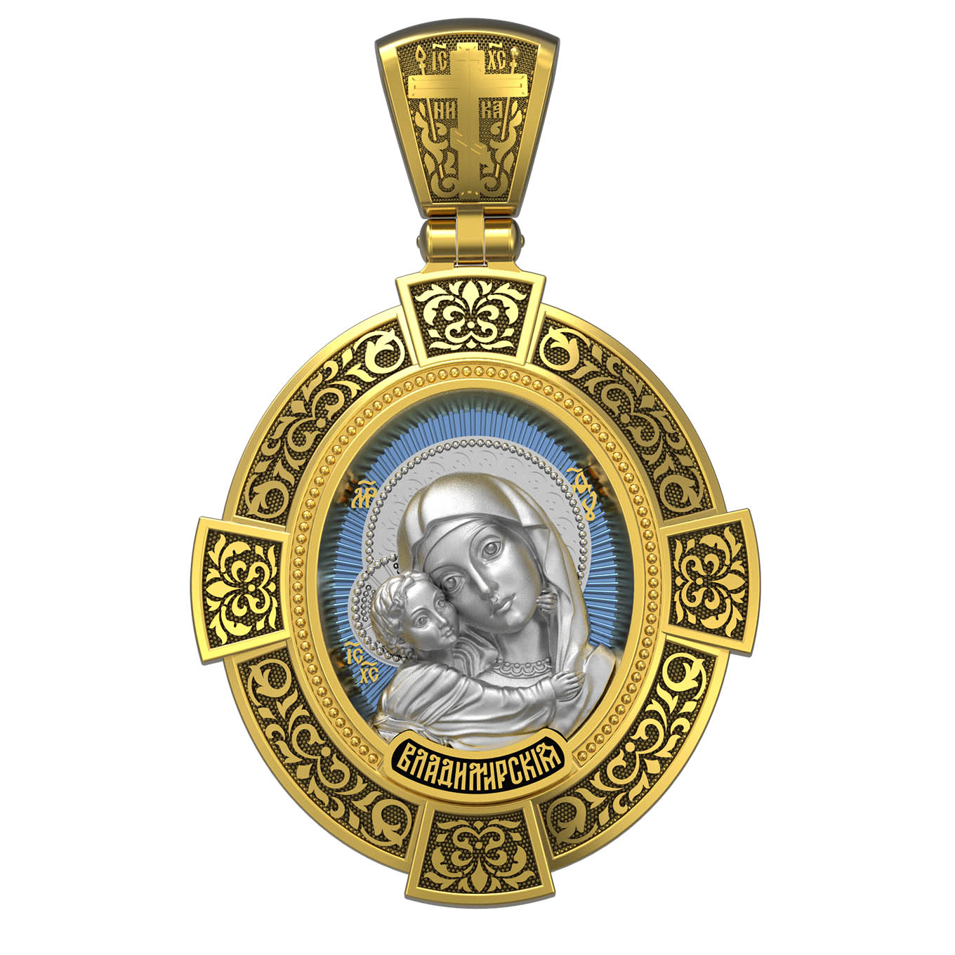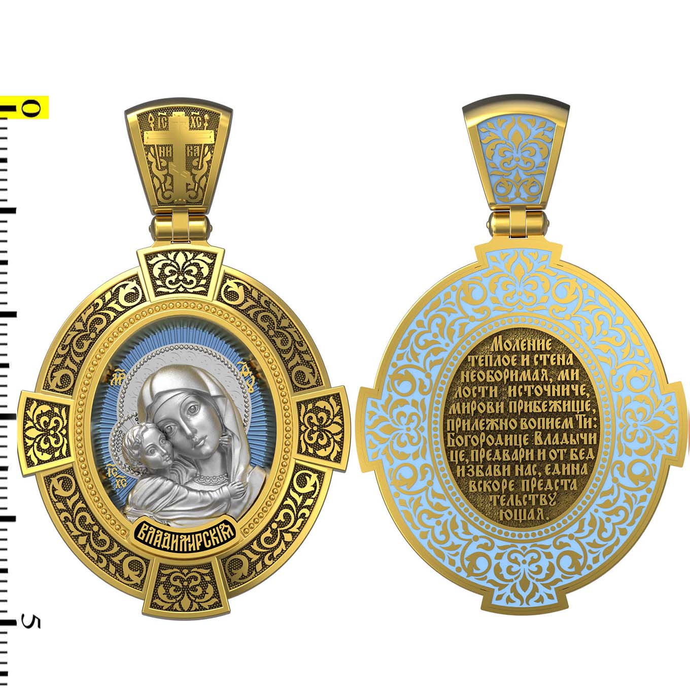 На лицевой стороне образка изображена Владимирская икона Божией Матери — одна из самых чтимых святынь Русской православной церкви. По преданию, икона была написана Святым апостолом и евангелистом Лукой во время земной жизни Богородицы. Дева Мария, увидев Свое изображение, молвила: «Отныне ублажат Мя вси роди. Благодать Рождшегося от Меня и Моя с сим образом да будет». Образ написан в лирическом иконографическом типе «Умиление». Младенец припал щекой к щеке Матери и тянется к ней правой рукой, другой нежно обнимая за шею. Икона вплоть до V века находилась в Иерусалиме, затем была перевезена в Византию. На Русь икона была привезена в 1131 г. За прошедшие столетия святыня неоднократно переезжала из Владимира в Москву и обратно, не раз спасая страну от захватчиков. Русская Православная Церковь установила троекратное празднование Владимирской иконе Божьей Матери. Каждый из дней празднования связан с избавлением русского народа от порабощения иноплеменниками по молитвам ко Пресвятой Богородице. В последующие века у иконы происходили многие важные исторические события: подписание актов, принятие присяги значимых государственных деятелей и возведение на престол. На кулонном кольце изображен Спас Нерукотворный — образ Господа и Спасителя нашего Иисуса Христа, чудесно отпечатавшийся на плате, котором Христос вытер свой лик.