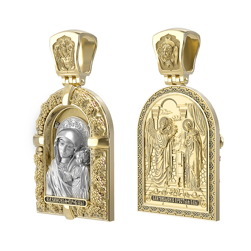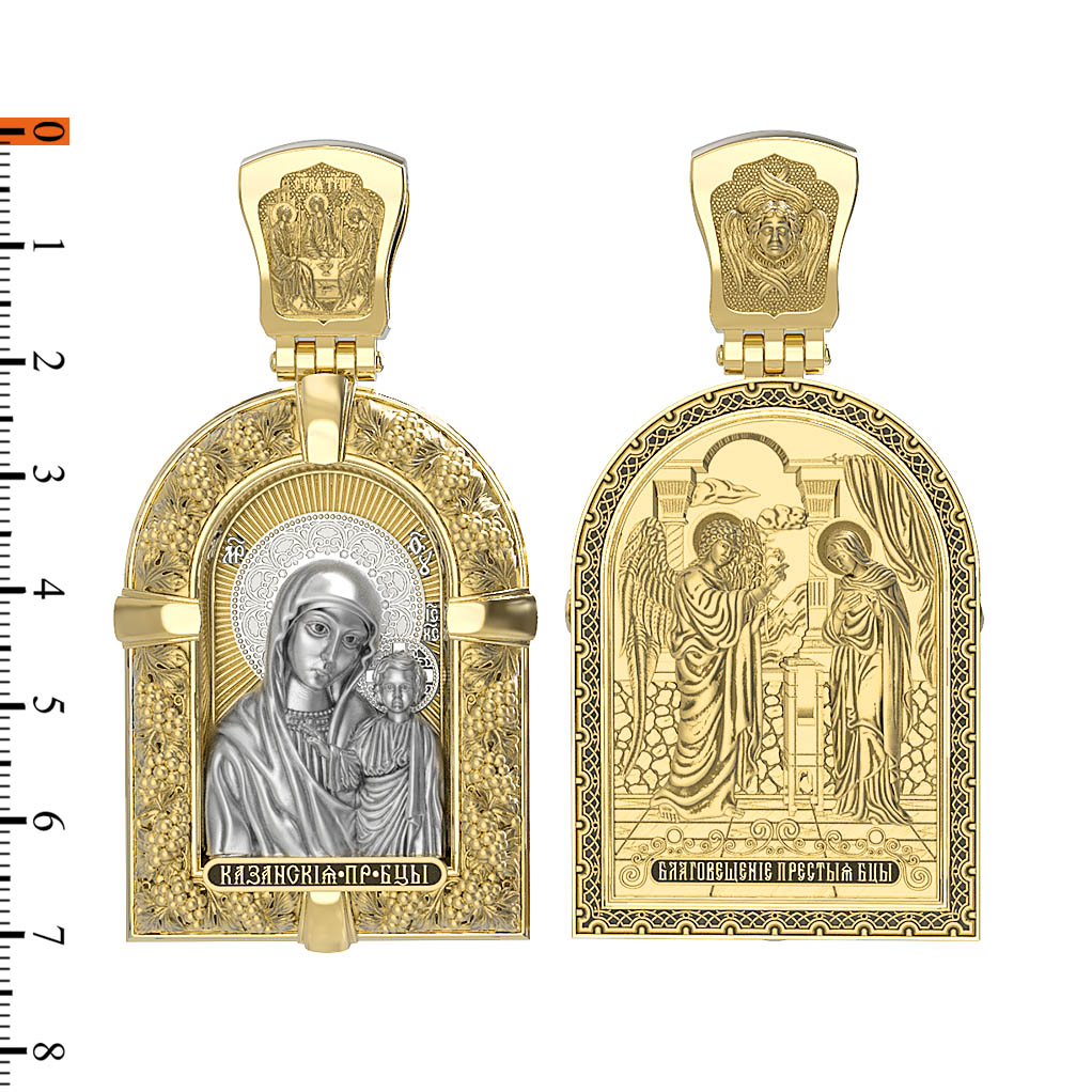 Казанская икона Божией Матери — одна из самых почитаемых в России чудотворных икон Богородицы. Богословское значение Казанской иконы — указать верующим истинный Путь к спасению, который лежит через Христа. Только Божия Матерь имеет настолько сильное дерзновение к Спасителю, что может ходатайствовать перед Ним за всех верных. Именно этот образ дарится новой повенчанной паре, как хранитель очага и семейная реликвия. Молитва перед Казанской иконой Божьей Матери помогает во всех сложных случаях жизни, в болезнях, во всех печалях, невзгодах, скорбях. Уникальная история появления, чудеса, случившиеся по молитвам православных людей возле образа — все это делает Казанскую Богородицу особенной, среди тысяч других икон. Вверху — икона Святой Троицы, на которой запечатлено явление Триединого Бога праотцу Аврааму в виде трех ангелов. Образок обвивает виноградная лоза — один из самых распространенных символических образов христианства. Она является символом Иисуса Христа, Который в Евангелии говорит о Себе: «Я есмь истинная виноградная лоза, и Отец мой — виноградарь». (Ин. 15:1). Поэтому именно из винограда изготавливается вино для Причастия, призванное символизировать Кровь Христову.