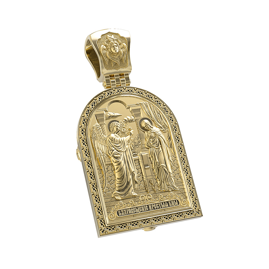 Основной композицией оборотной стороны является «Благовещение Пресвятой Богородицы». Благовещение — праздник великого откровения — получения Девой Марией Благой Вести о чудесном зачатии Божиего Сына.