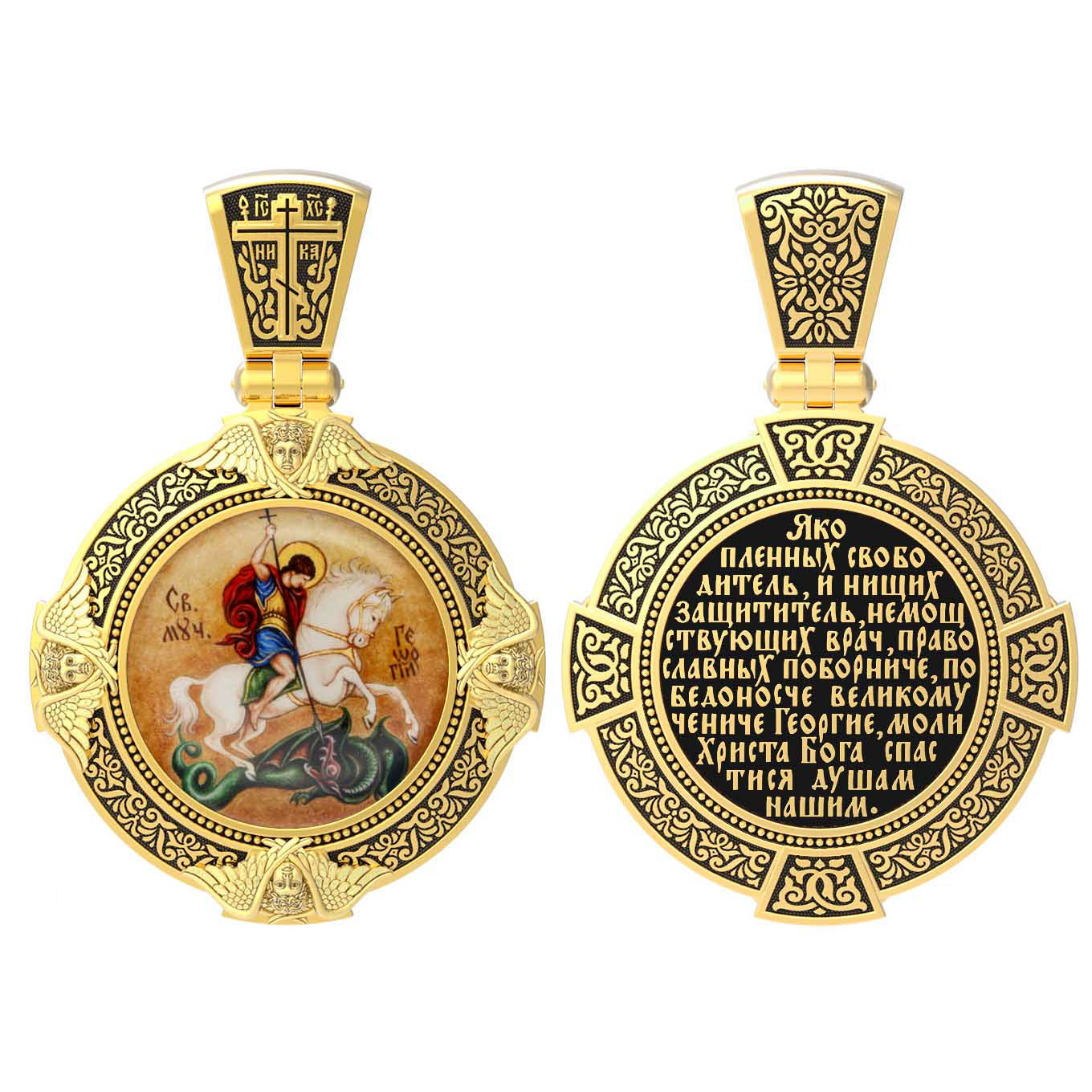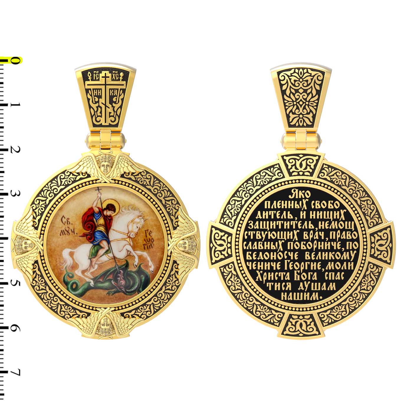 На обороте написана молитва"Яко пленных свободитель, и нищих защититель, немощствующих врач, православных поборниче, победоносче великому чениче Георгие, моли Христа Бога спастися душам нашим.»