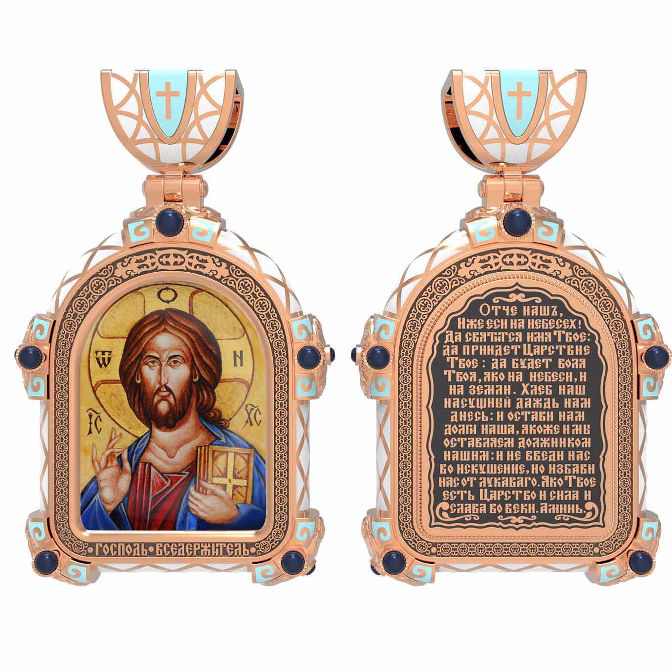 На лицевой стороне образка изображена икона Господа и Спасителя нашего Иисуса Христа — Господь Вседержитель или Пантократор (от греч. всевластный, всесильный). Он представлен как Царь Небесный и будущий Судия мира. Именование Иисуса «Вседержителем» указывает, с одной стороны, на Его Божественную природу: «Аз есмь Альфа и Омега, начало и конец, говорит Господь, Который есть и был и грядет, Вседержитель» (Откр. 1: 8). С другой стороны, такое именование связано и с человеческой природой Христа, искупившего крестной жертвой людские грехи и обновившего тем самым человеческую природу. Господь Иисусь Христос изображен фронтально огрудно. Главу Спасителя осеняет нимб, на нем угадывается крест. Крест символизирует голгофскую жертву Спасителя. По греческой традиции, на нимбе написаны буквы Омега, Омикрон, Ню — вместе они обозначают слово Сущий, одно из имен и характеристику Бога, согласно Священному Писанию. Правой рукой Он благословляет, а левой держит Евангелие — благую весть, принесенную Христом всему миру. Также означает она тот новый мир, который будет сотворен Богом после второго пришествия Христа. Символизирует и Книгу Жизни, где записаны имена всех, возлюбивших Бога. Всемогущий Бог предстает здесь не как обличающий судья, а как милостивый отец, ждущий возвращения блудных детей.