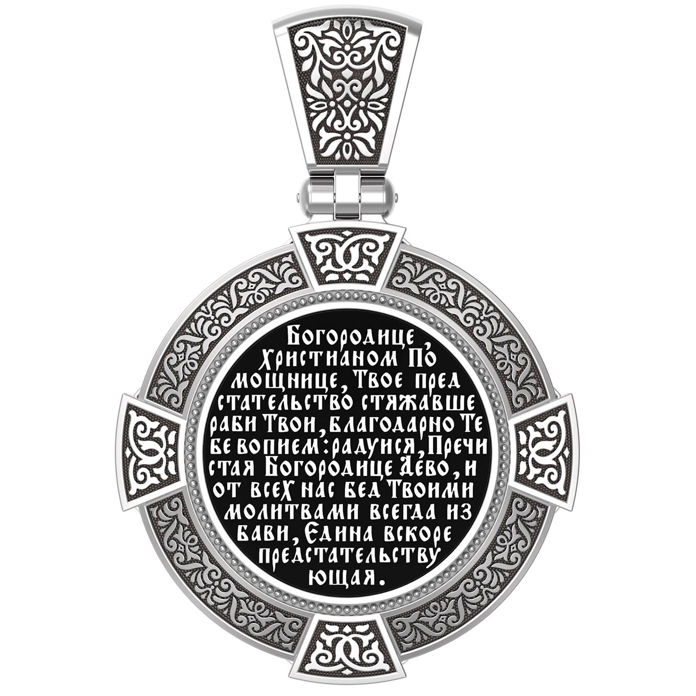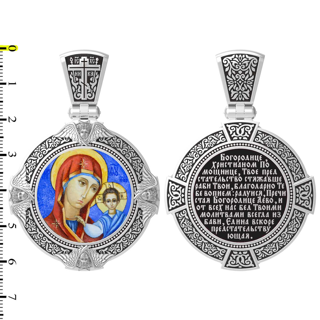 На лицевой стороне образка изображена Казанская икона Божией Матери. Пресвятая Богородица — милосердная заступница, просительница за нас перед Богом. Она стала воистину нашей Матушкой, охраняющей и поддерживающей нас от рождения до самой смерти, а Ее благодатная помощь изливается на нас по молитвам у ее чудотворных икон. Казанская икона явилась в 1579 году в Казани, вскоре после взятия Казанского царства у татар Иоанном Грозным. Этот образ Богородицы не раз сопровождал русский народ в бедствиях. Икона Божией Матери Казанская вдохновляла русских ратников в период Смутного времени при освобождении Москвы от поляков. Перед Казанской иконой в 1709 году, накануне Полтавской победы, император Петр I молился о даровании победы русскому войску. В 1812 году накануне отъезда в действующую армию перед чудотворной иконой Божией Матери молился князь Михаил Кутузов. Не только государственным мужам и дружинам указывала путь икона — по доброй традиции именно этой иконой благословляют на брак молодых родители, длинным списком чудес сопровождается этот образ Богоматери — один из самых любимых на Руси. Существует множество древних списков с этой удивительной иконы. На кулонном кольце изображен Спас Нерукотворный — образ Господа и Спасителя нашего Иисуса Христа, чудесно отпечатавшийся на плате, котором Христос вытер свой лик.