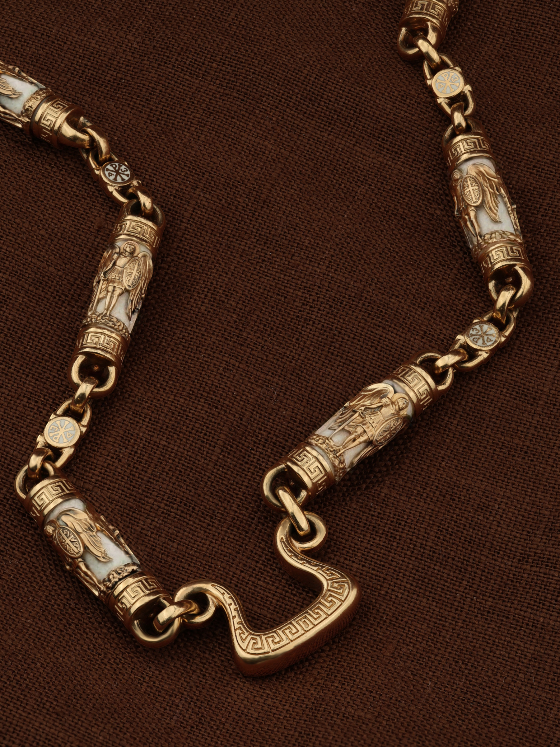 На звеньях цепи изображена Хризма — монограмма имени Христа, которая состоит из двух начальных греческих букв имени  — Х (хи) и Р (ро), скрещённых между собой. По краям монограммы помещены греческие буквы a и w. Такое употребление этих букв восходит к тексту Апокалипсиса: «Аз есмь Альфа и Омега, начало и конец, говорит Господь, Который есть и был и грядет, Вседержитель.» (Откр. 1:8; см. также Откр. 22:13). Также на звеньях изображен Святой Ангел-Хранитель в виде прекрасного юноши держащего в правой руке мечь, а в левой — щит. Ангел-Хранитель — это Ангел приставляемый Богом к человеку при крещении для охраны и помощи в добрых делах. Он невидимо находится при человеке на протяжении всей его жизни, если человек сохраняет в себе любовь к Богу и истинную веру перед Ним. Ангел-Xранитель делают для нас все, что служит к истинному нашему благу и спасению. Невидимо пребывая при нас постоянно, он, руководствуя нас ко спасению, не только по нашему желанию таинственно наставляет нас на все доброе и полезное, не только возносит наши молитвы к Богу, но еще и сам от себя охраняют и защищают нас от врагов видимых и невидимых и ходатайствует за нас пред Богом. Ангел-Хранитель так любит нас, как никто на земле любить не может. Одного лишь каждому из нас он желает — спасения души; к этому он направляет все свои заботы. И если видит нас также заботящимися о спасении, радуется, если же видит нас пребывающими в нерадении о душе своей, скорбит. Но и самый великий грешник может примириться со своим Ангелом-Хранителем посредством искреннего раскаяния в грехах и оставления их навсегда. В таком случае, по слову Писания, великая радость бывает для всех ангелов на небесах (Лк. 15:10). Цепь украшена орнаментом.